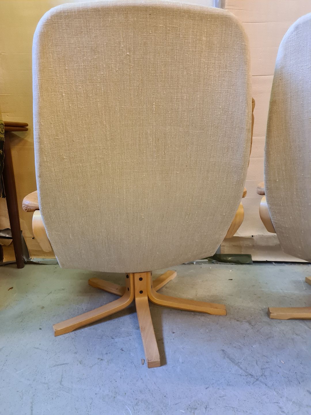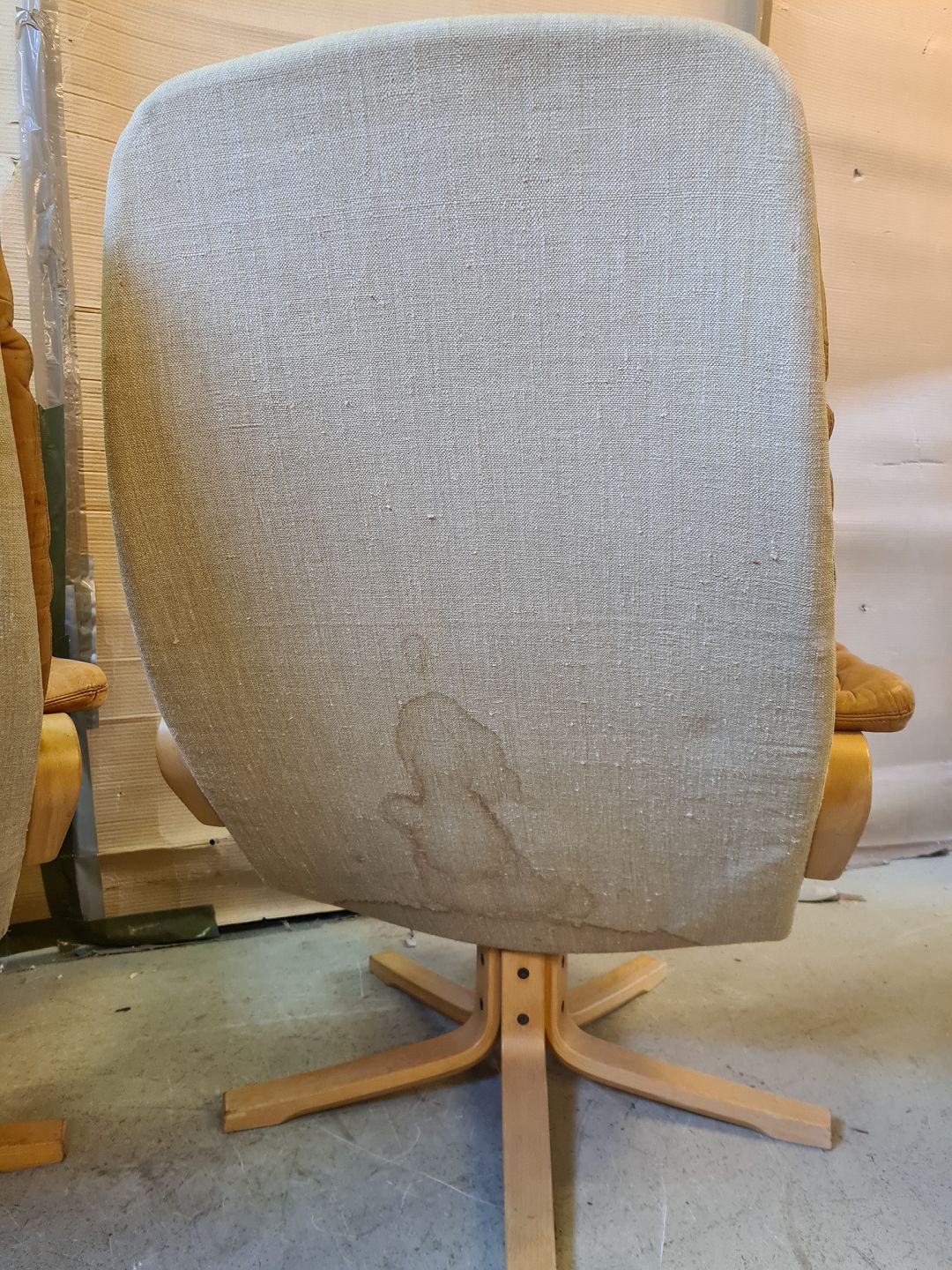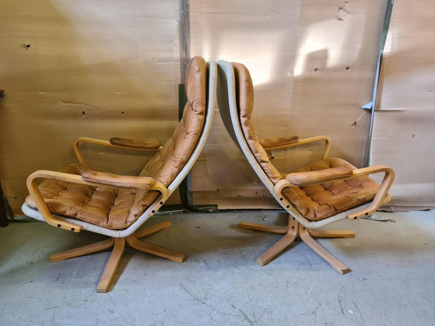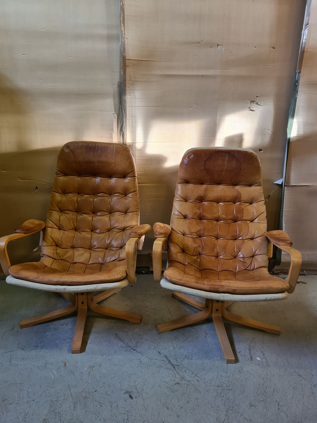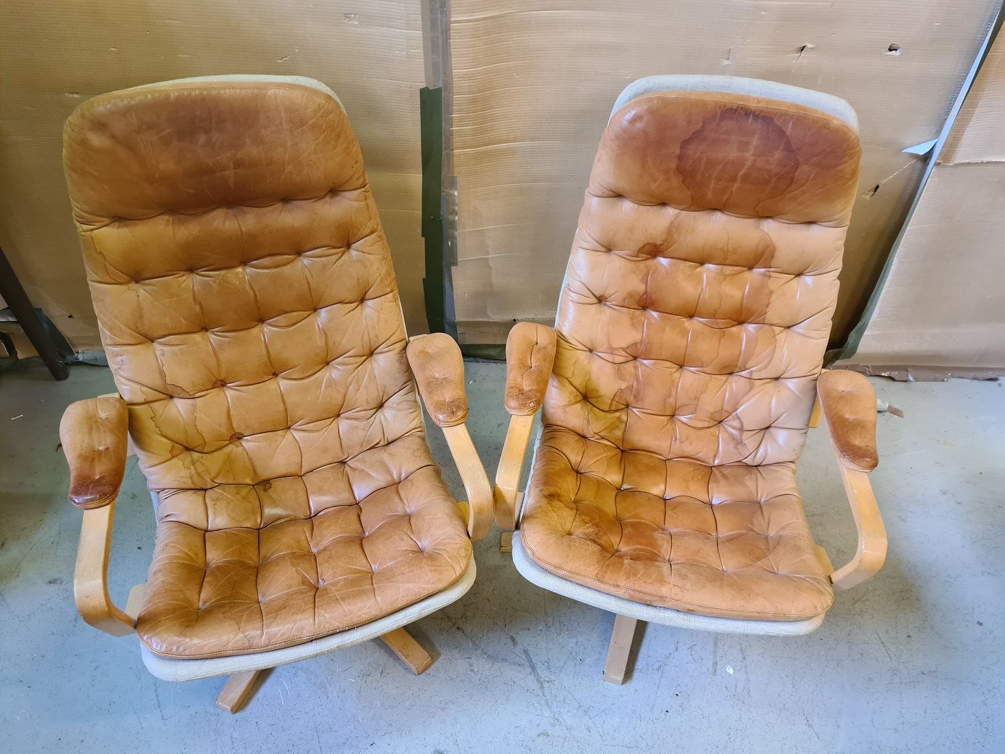 2 Lænestole i bøgetræ og læder, fra 1980erne. De har brugsspor. Ryghøjde 91cm Sædehøjde 37cm Emne nummer: 75948