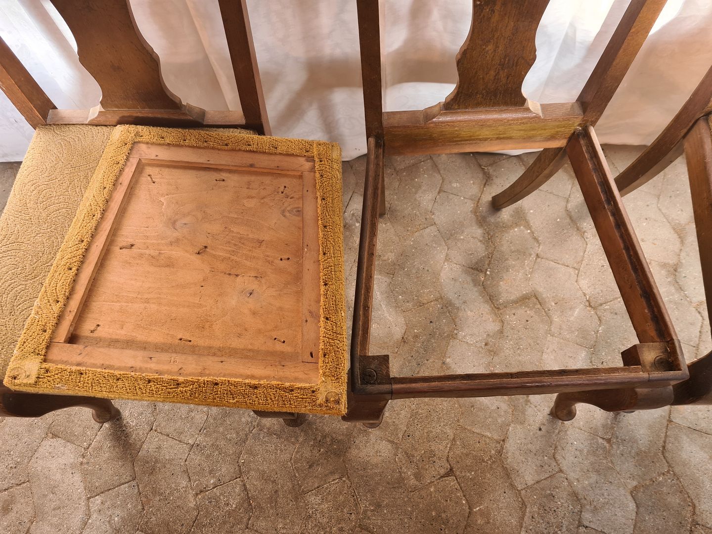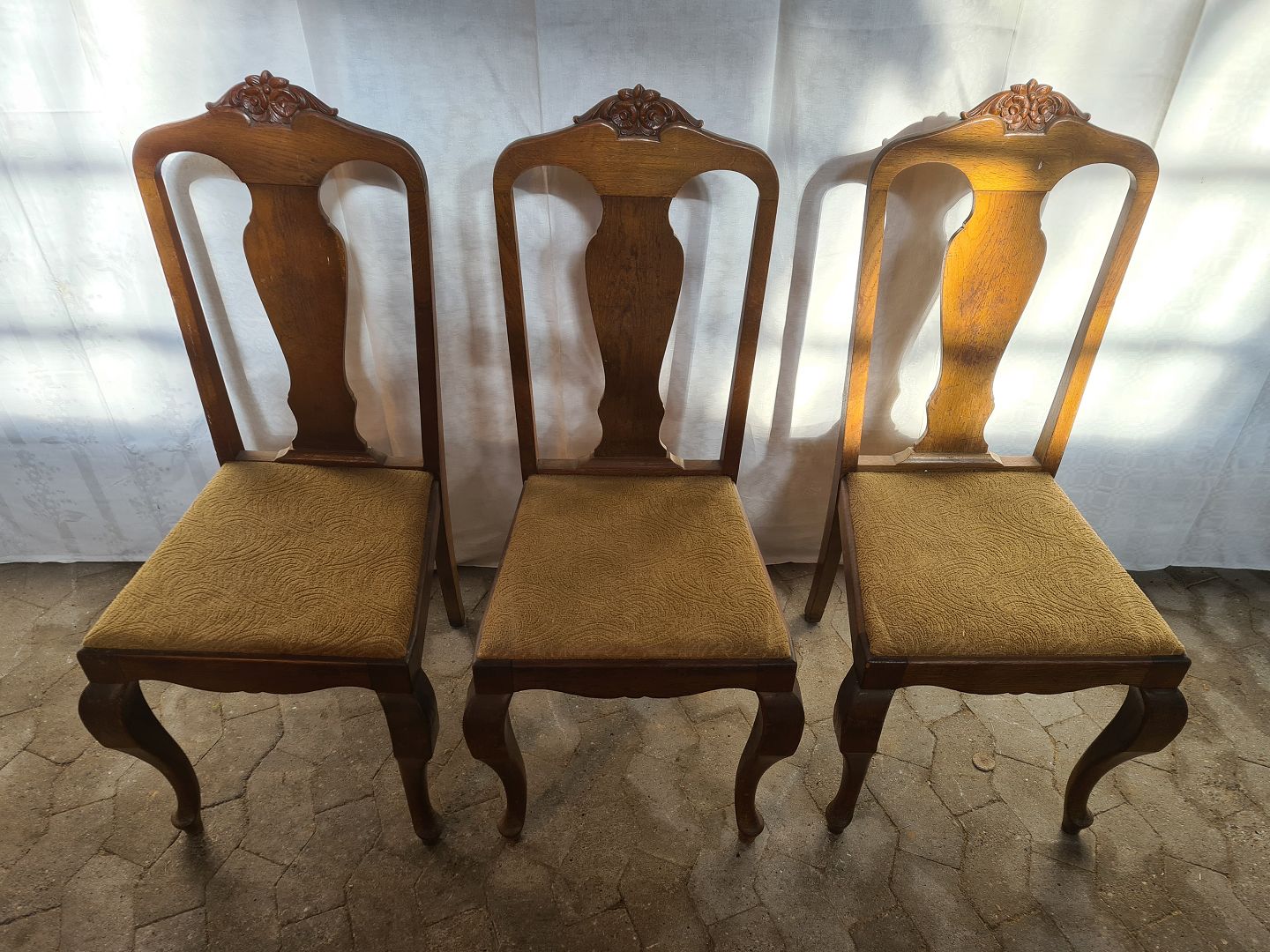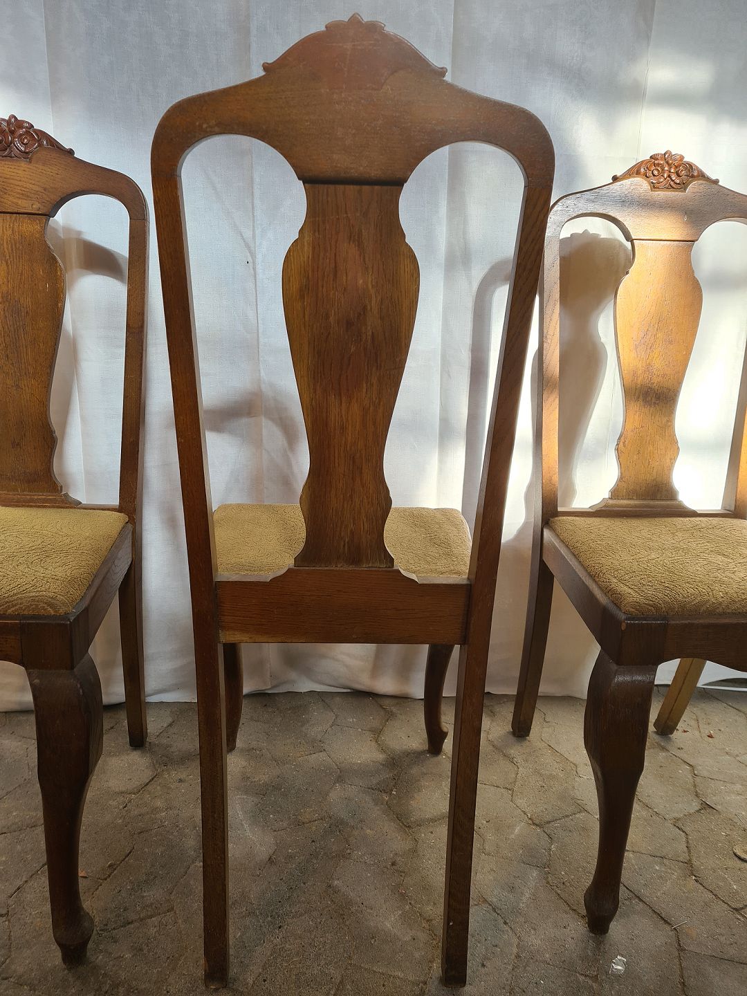 6 Stole i massivt egetræ, 1920erne. De har brugsspor. Ryghøjde 107cm Sædehøjde 47cm Emne nummer: 91043