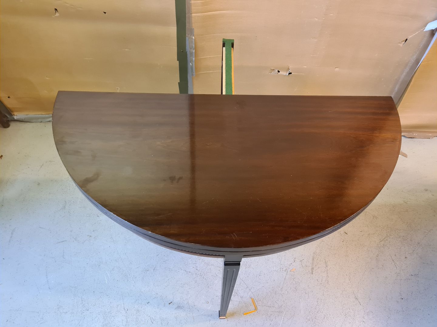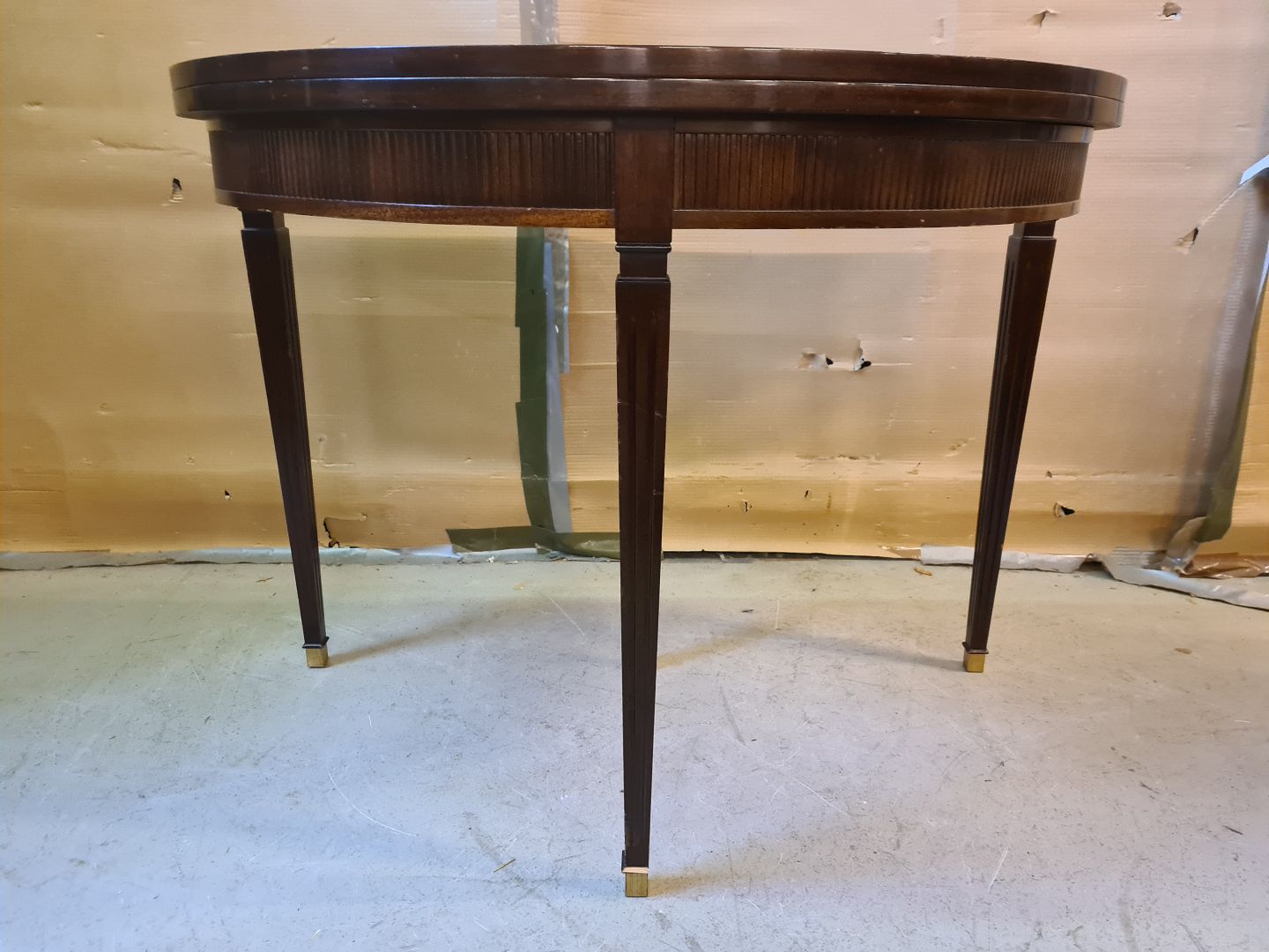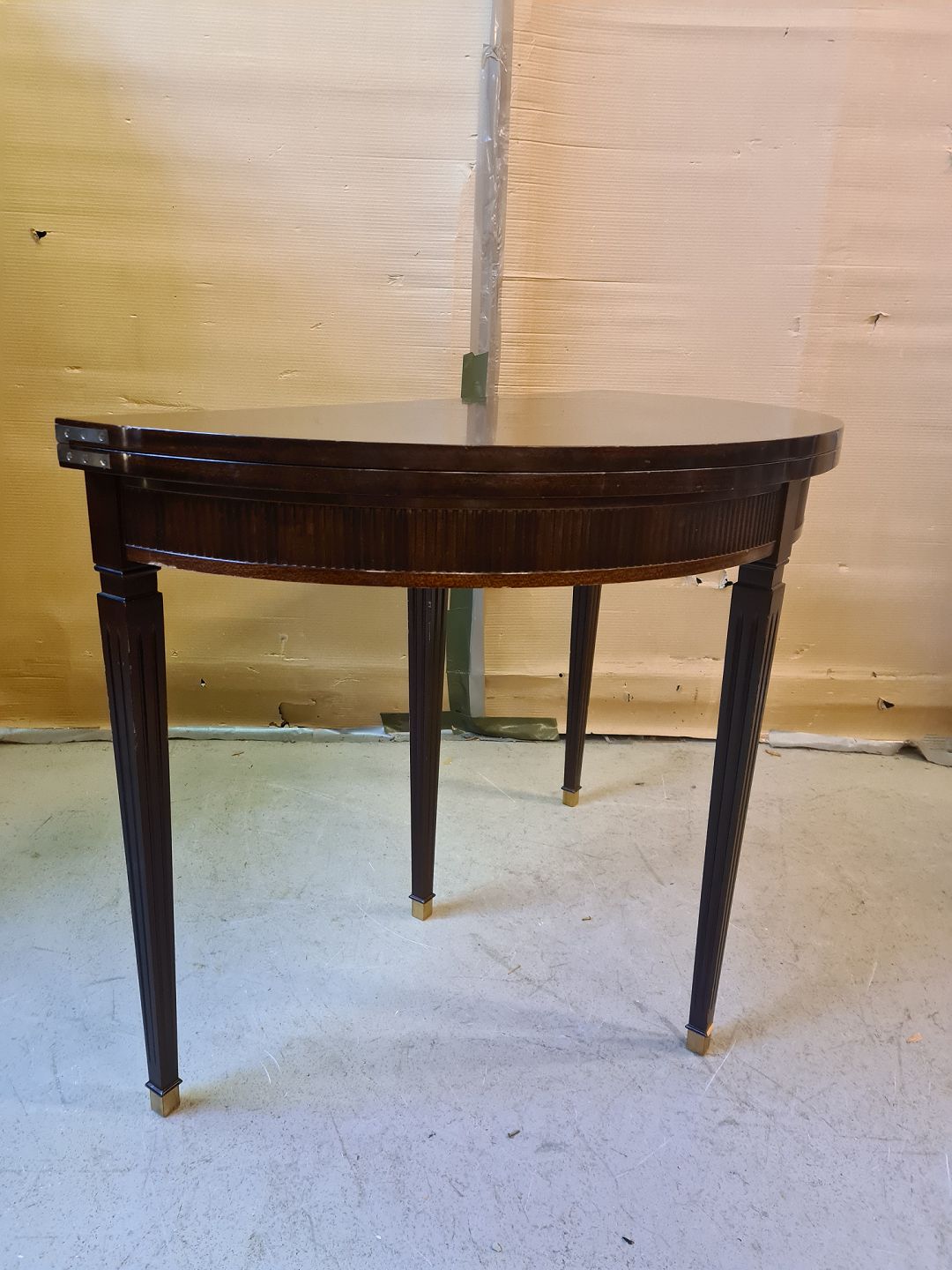 Spillebord i fineret mahogni, fra 1980erne. Det har brugsspor. Højde 74cm Bredde 100cm Dybde 50cm Diameter udslået 100cm Emne nummer: 75969