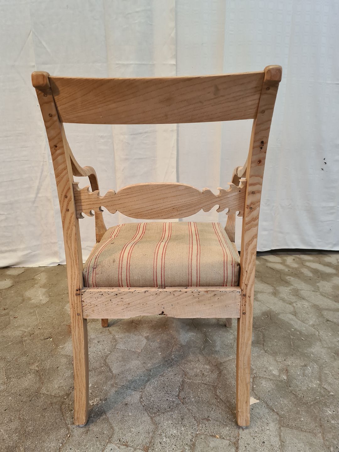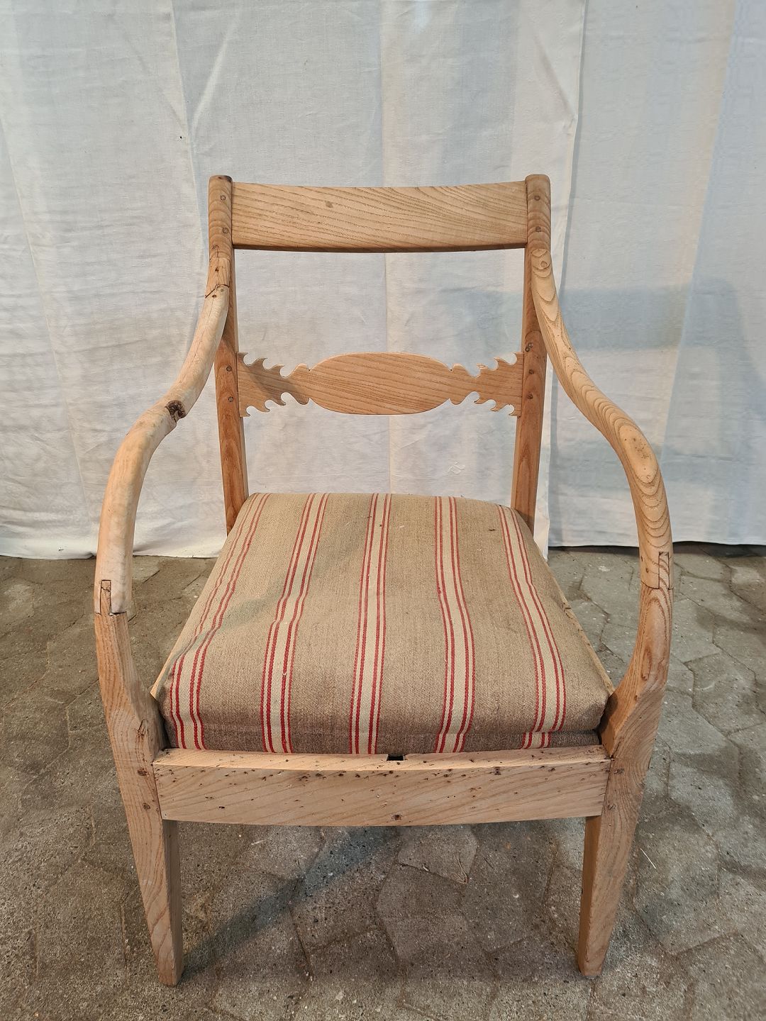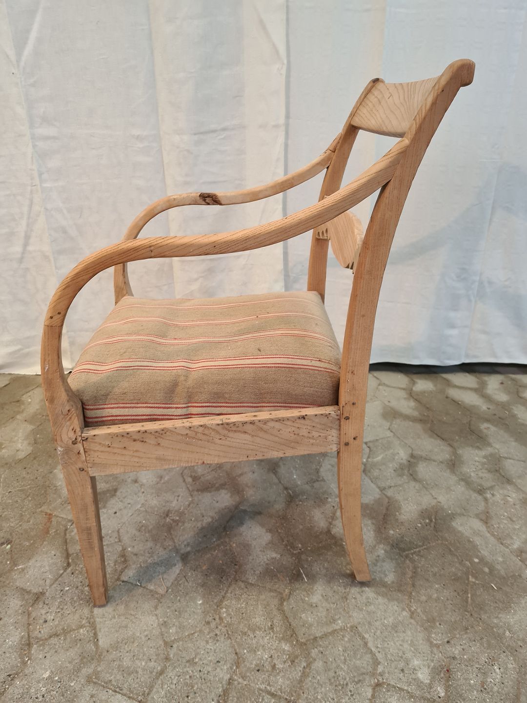 Armstol i massivt fyrretræ, fra 1900erne. Den har brugsspor og trænger til nyt betræk. Ryghøjde 83cm Sædehøjde 42cm Emne nummer: 91082