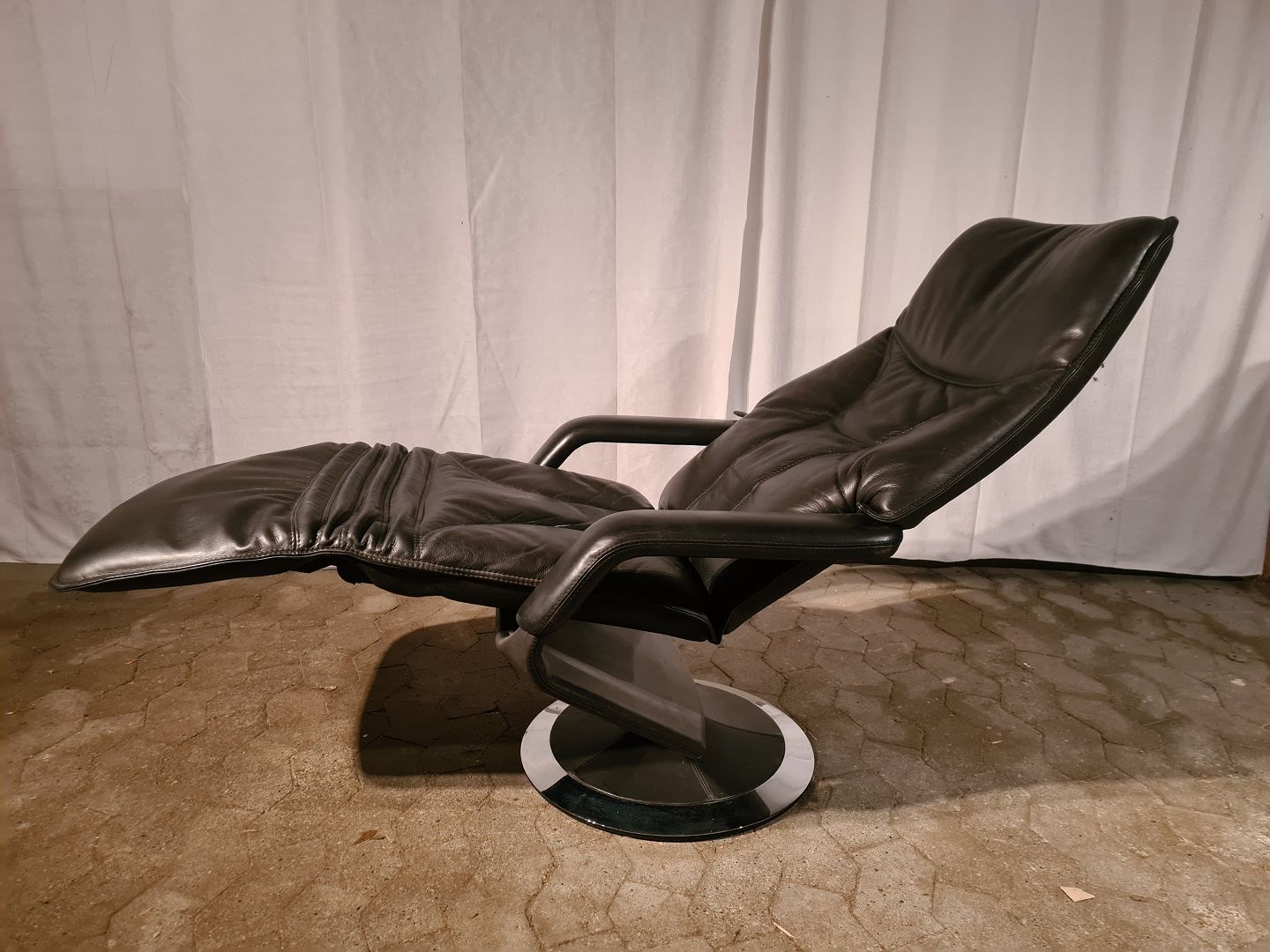 Lænestol i læder med vippefunktion, fra 2000erne. Den har brugsspor. Ryghøjde 110cm Sædehøjde 41cm Emne nummer: 91088