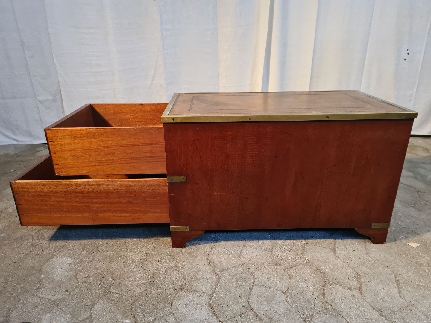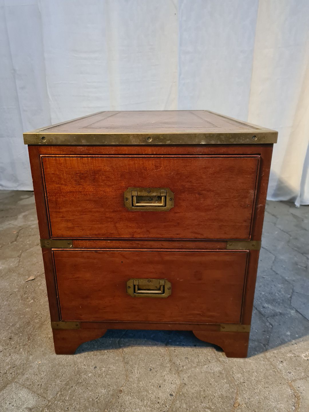 Kommode i fineret mahogni med kunstlæder indlæg, fra 1980erne. Den har brugsspor. Højde 48cm Bredde 42cm Dybde 77cm Emne nummer: 91093