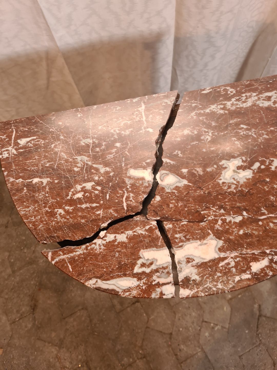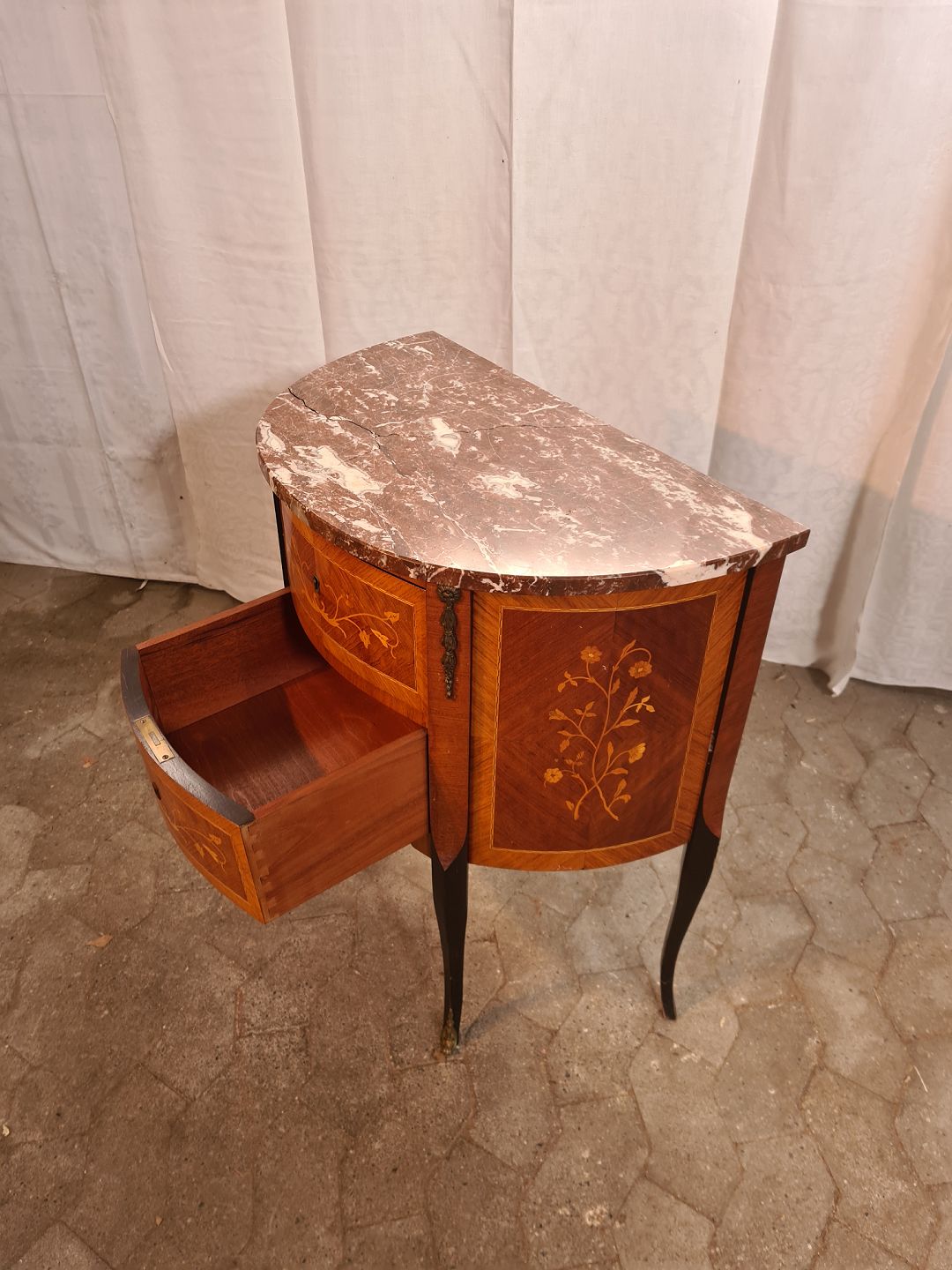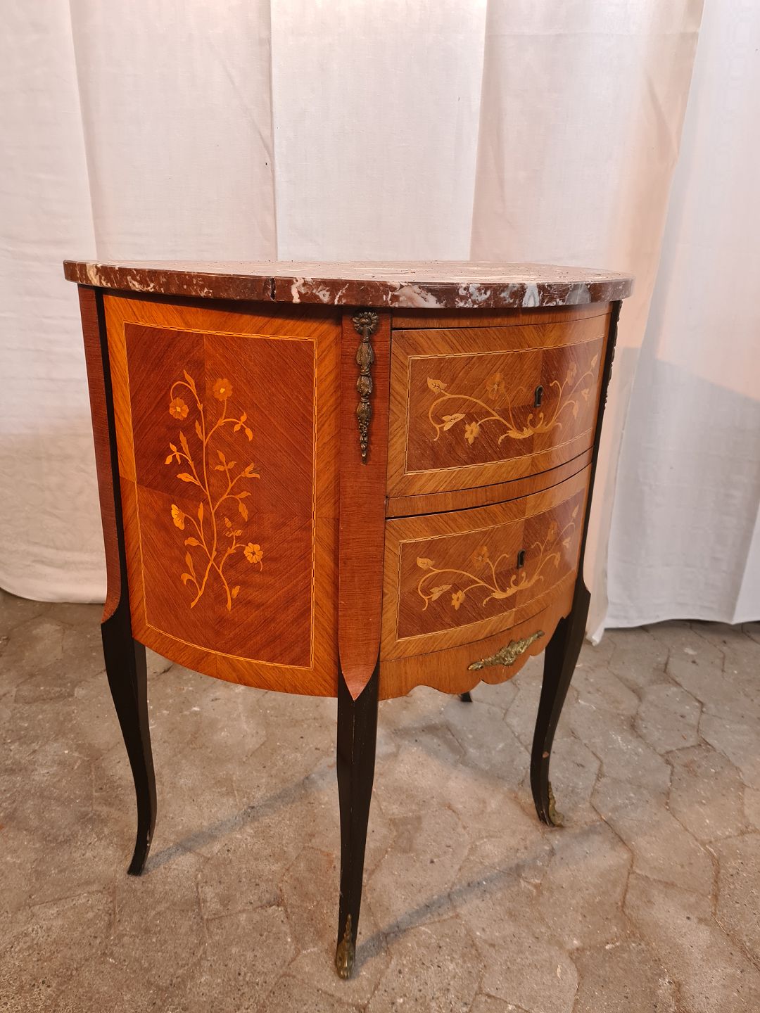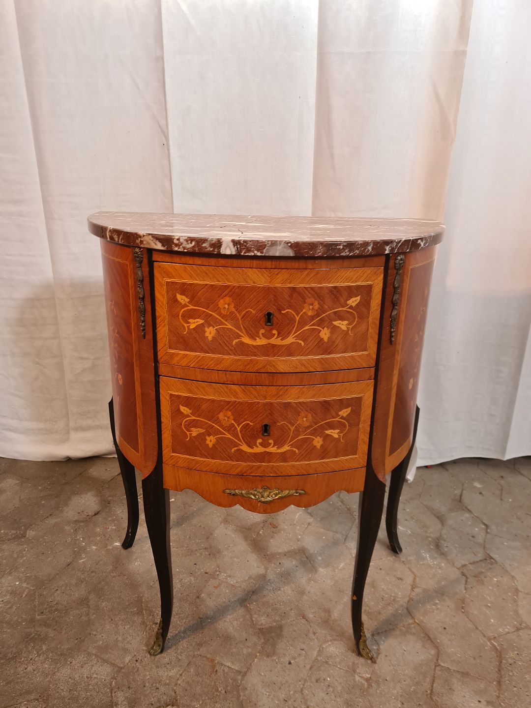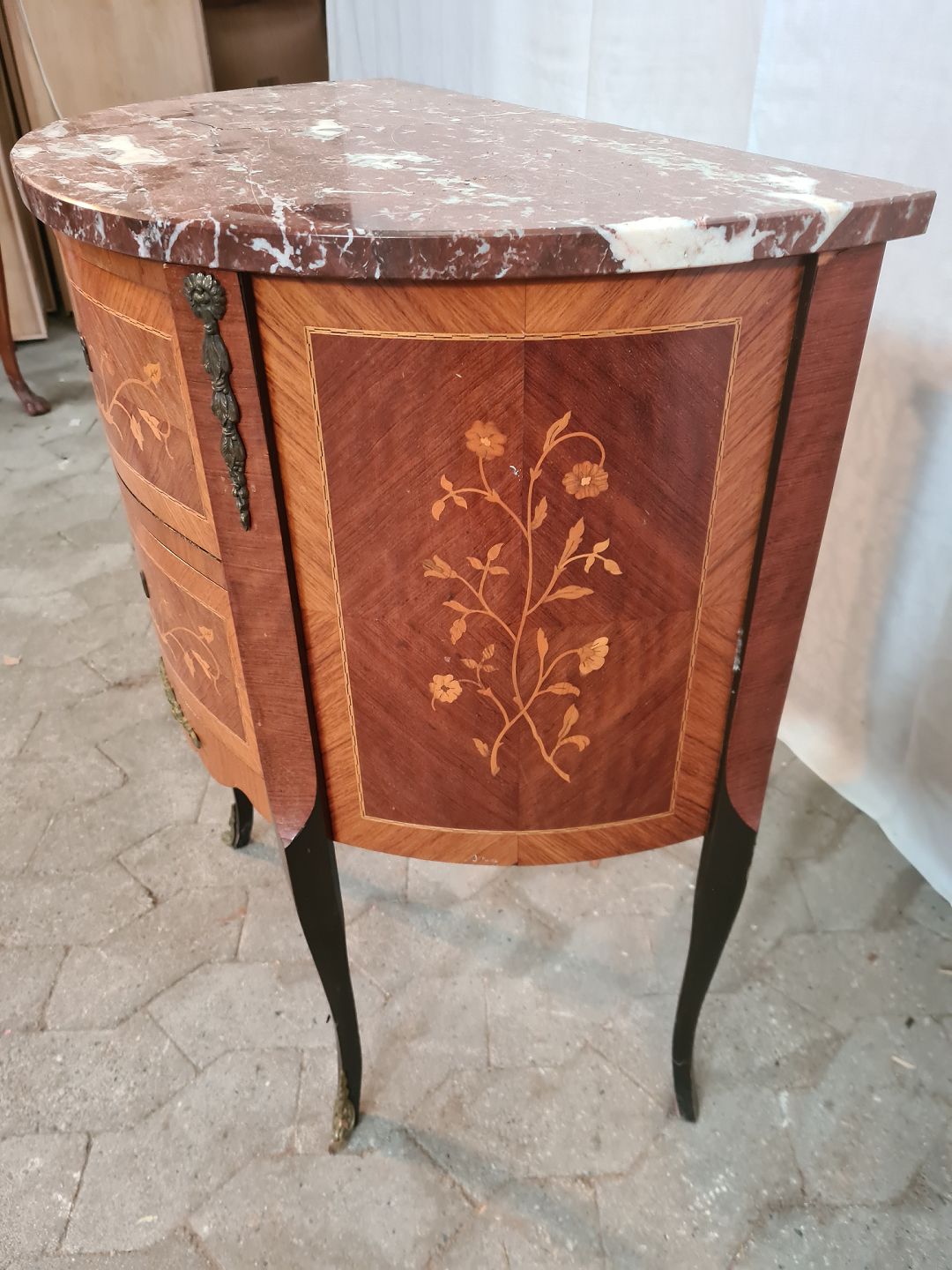 Kommode i fineret mahogni med intasia og marmorplade, fra 1980erne. Den har brugsspor og marmorpladen er defekt. Højde 76cm Bredde 64cm Dybde 37cm Emne nummer: 91121