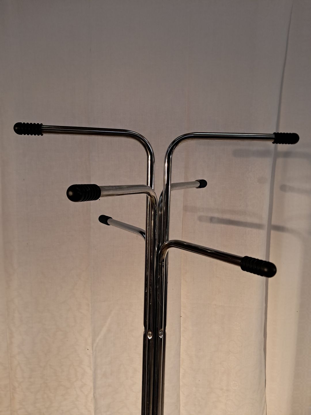 Stumtjener i metal med 6 stk. metalbøjler, fra 1990erne. Den har brugsspor. Højde 169cm Diameter 55cm Emne nummer: 91135