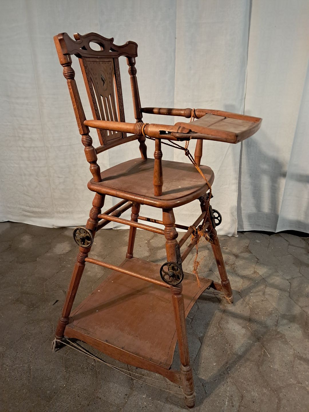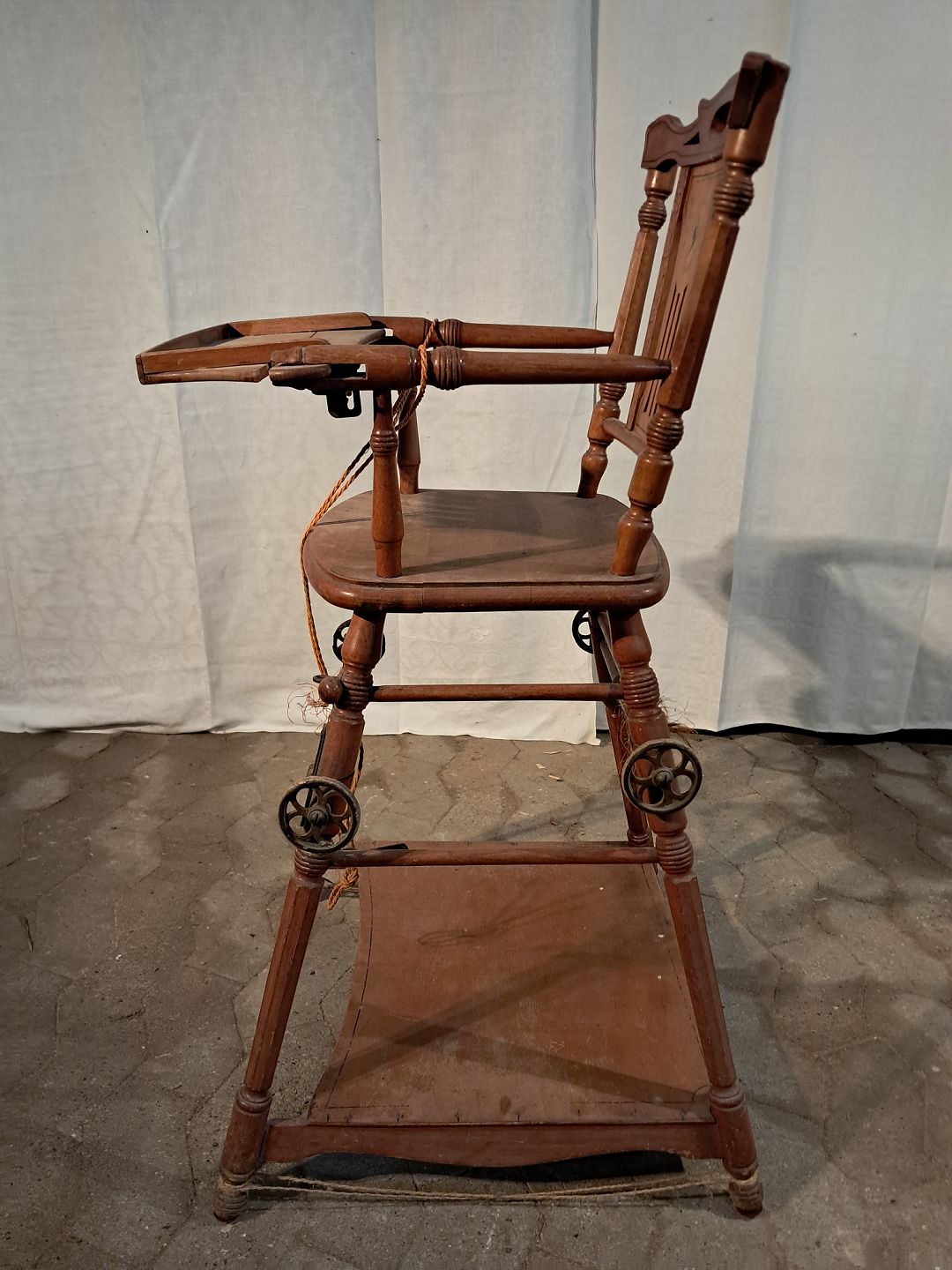 Barnestol i massivt bøgetræ med intarsia, fra 1920erne. Den er stabil, men har brugsspor og bakken skal limes. Ryghøjde 102cm Sædehøjde 60cm Emne nummer: 91138