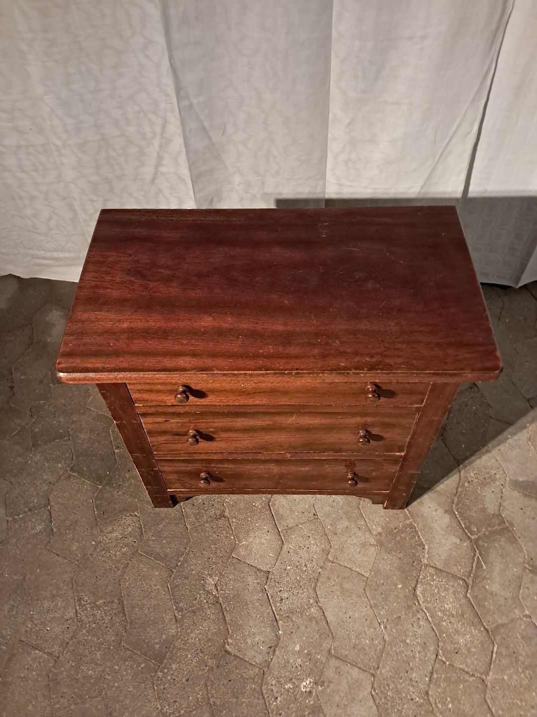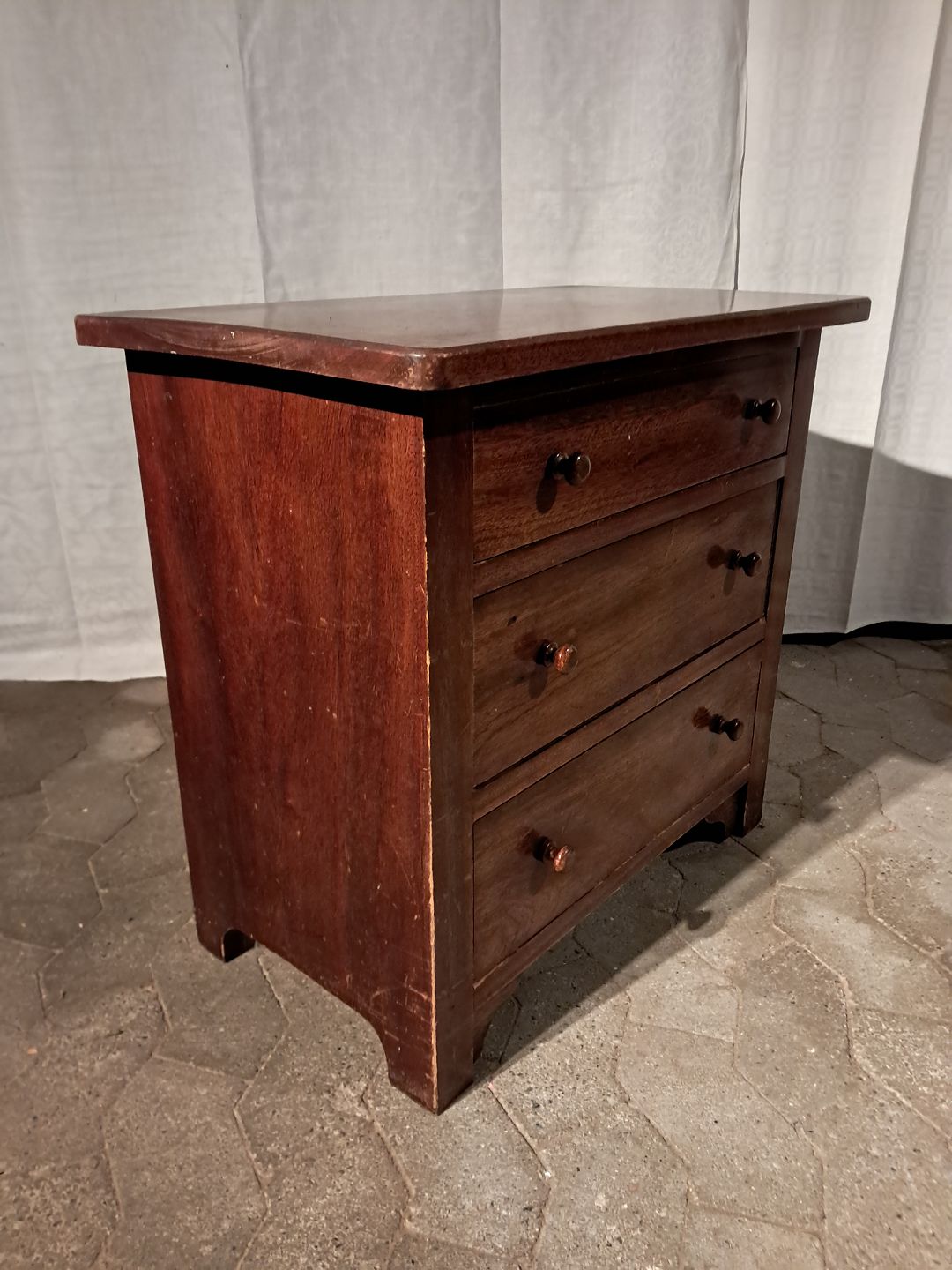 Kommode i fineret mahogni, fra 1920erne. Den har brugsspor. Højde 62cm Bredde 67cm Dybde 38cm Emne nummer: 91170