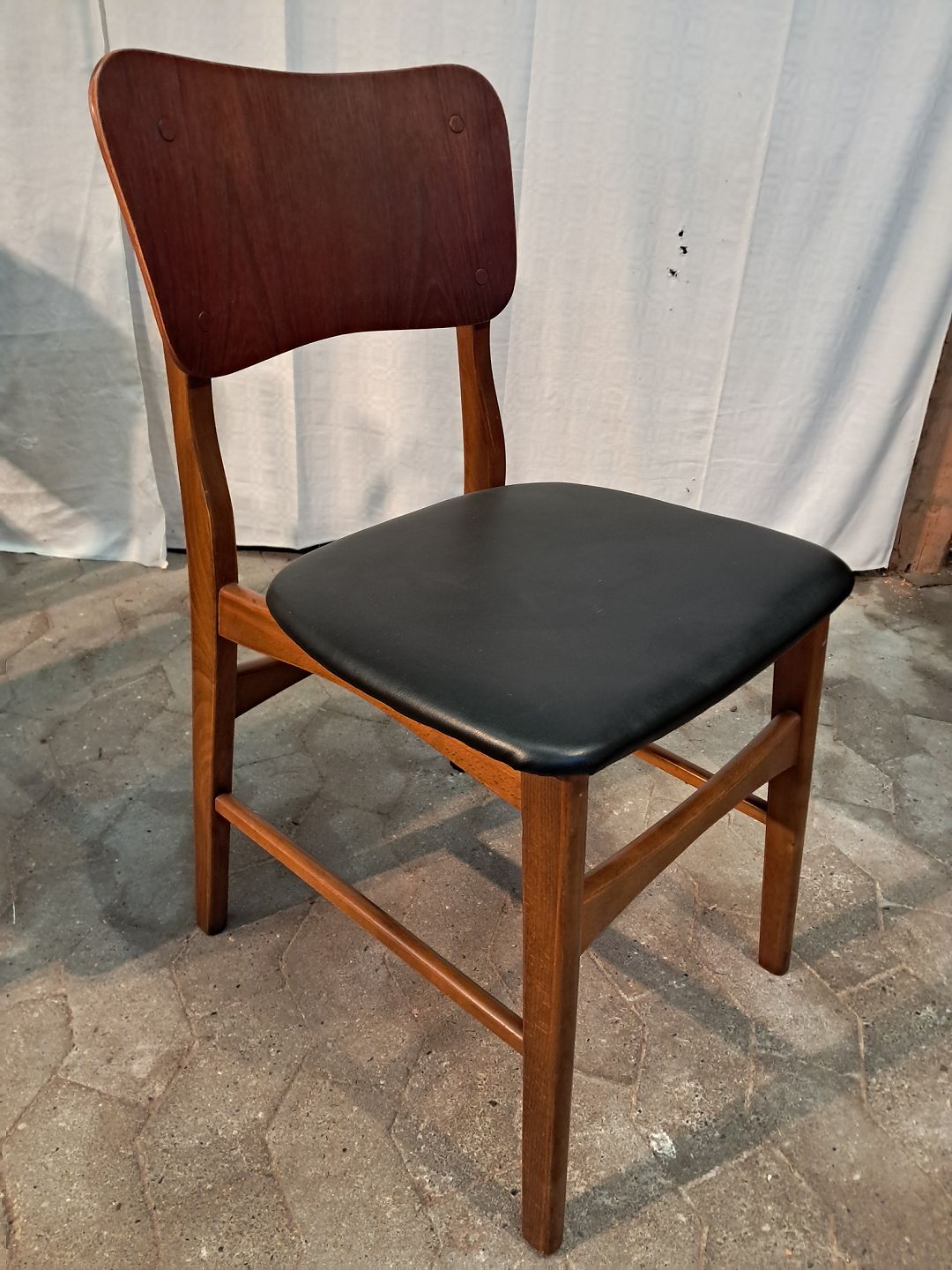 6 Stole i massivt bøgetræ og fineret teaktræ med kunstlæder betræk, fra 1960erne. De har små brugsspor , men den en rokker lidt. Ryghøjde 81cm Sædehøjde 46cm Emne nummer: 91204