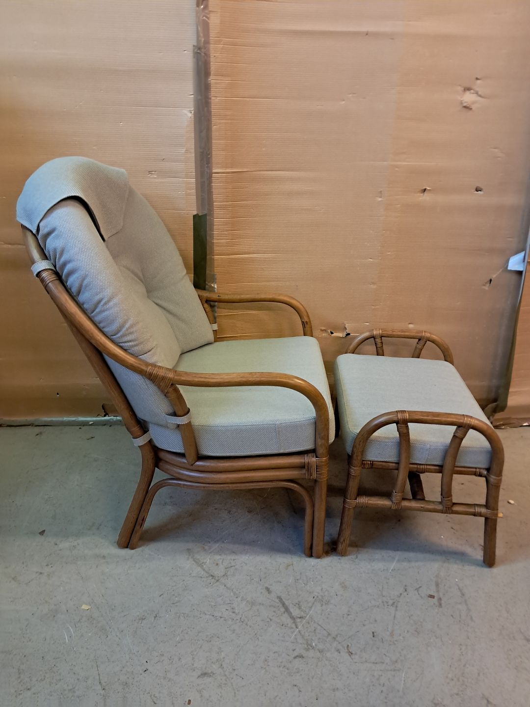 3 Stole, en fodskammel og lille bord i bambus, af nyere dato. Den en stol har et skjol på sædet. Sædehøjde 42cm Bord mål : Højde 63cm Diameter 59cm Emne nummer: 76022