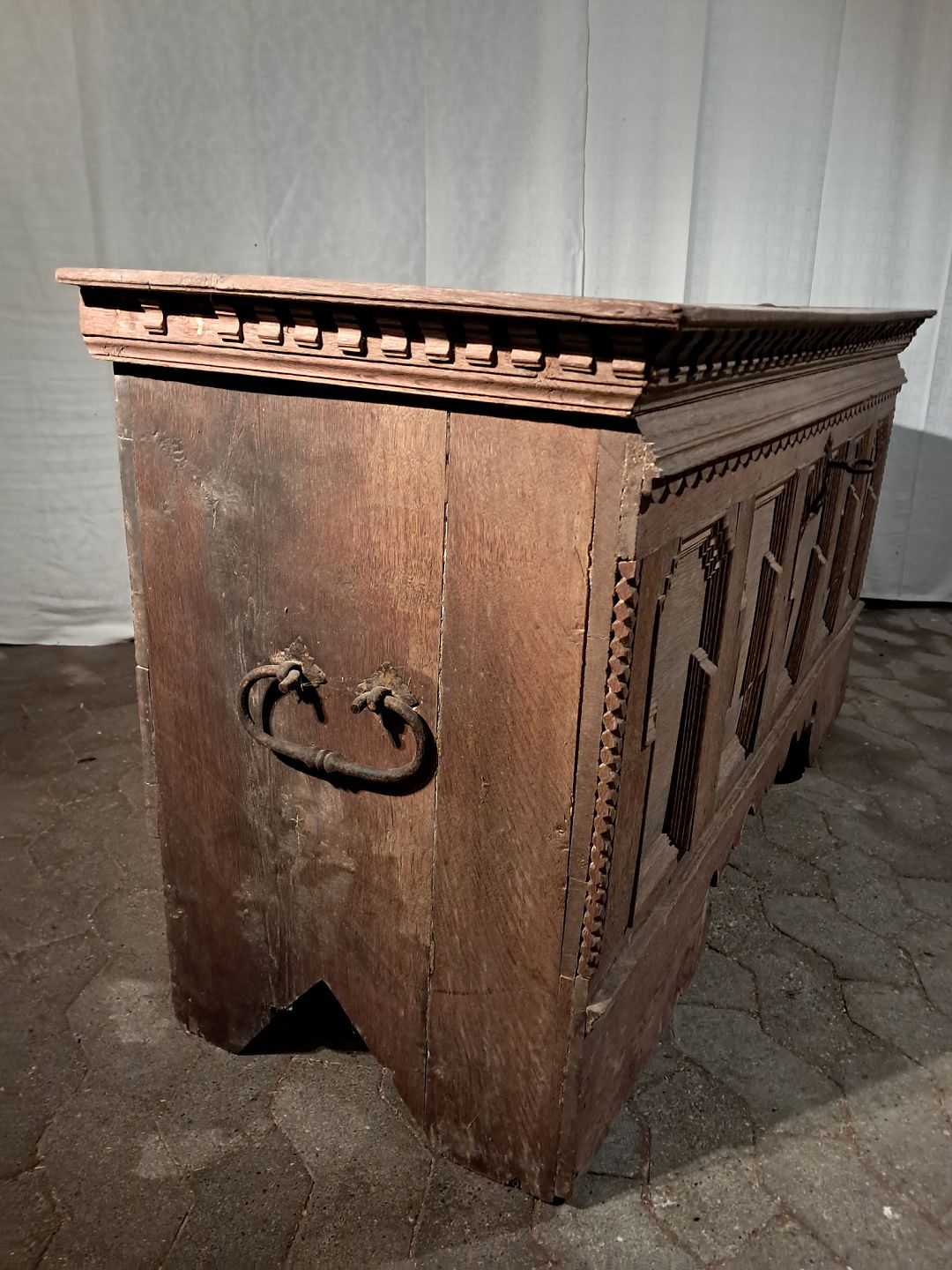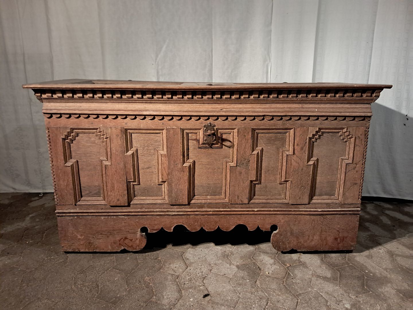 Kiste i massivt egetræ, fra 1860erne. Den har brugsspor og små defekter. Højde 78cm Bredde 148cm Dybde 55cm Emne nummer: 91248