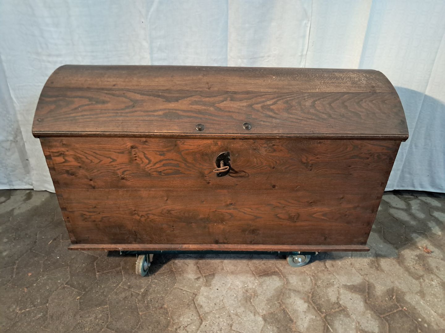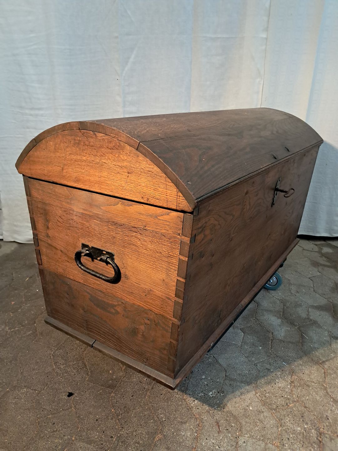 Kiste i massivt egetræ, fra 1880erne. Den har brugsspor. Højde 63cm Bredde 115cm Dybde 58cm Emne nummer: 91258