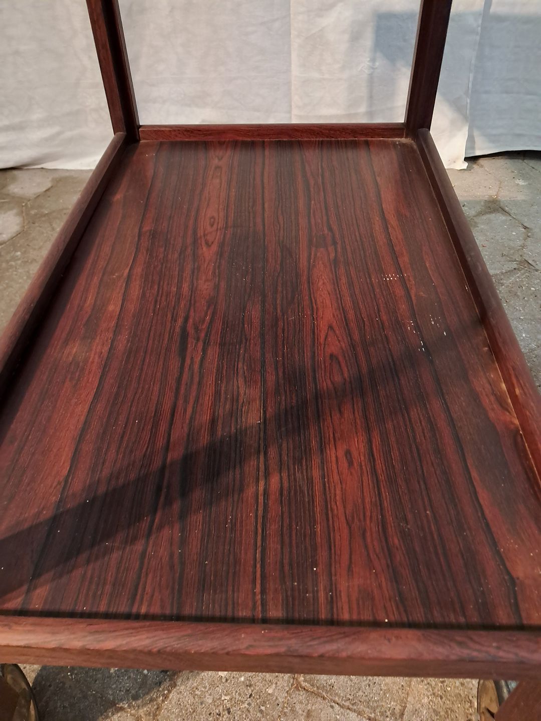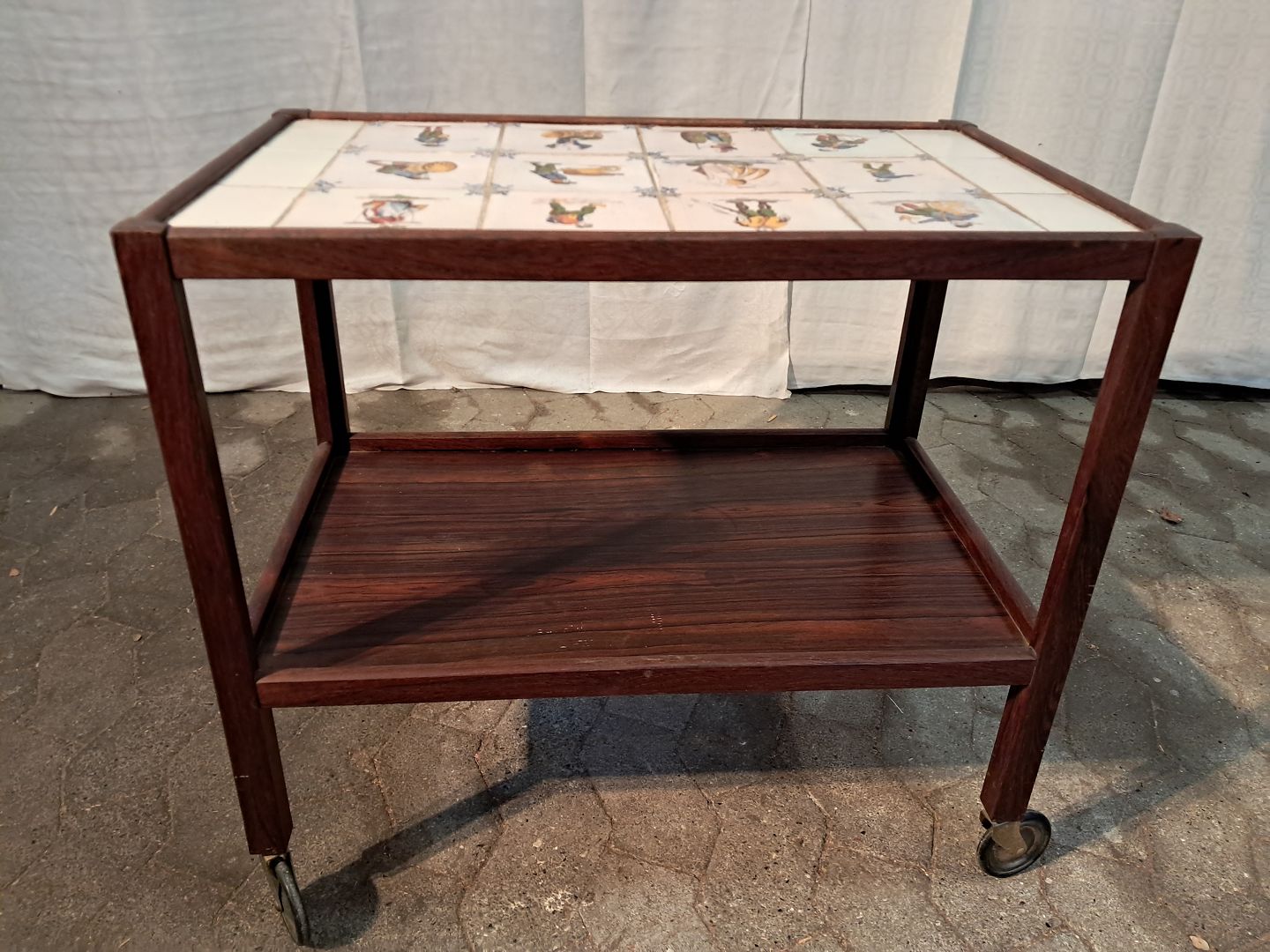Rullebord i palisander med gamle kakler, fra 1960erne. Det har brugsspor og hjulene driller lidt. Højde 63cm Bredde 43cm Længde 69cm Emne nummer: 91263