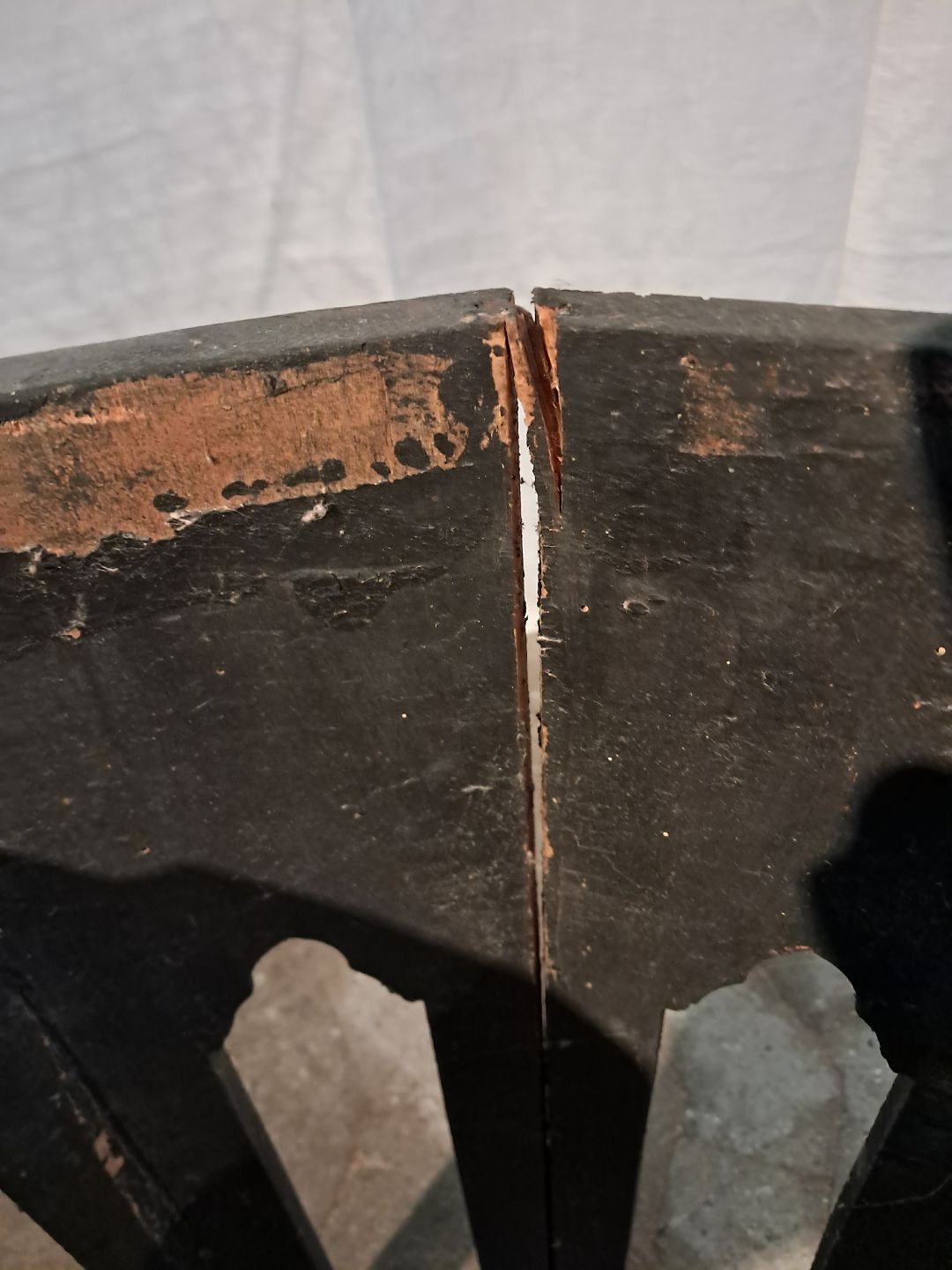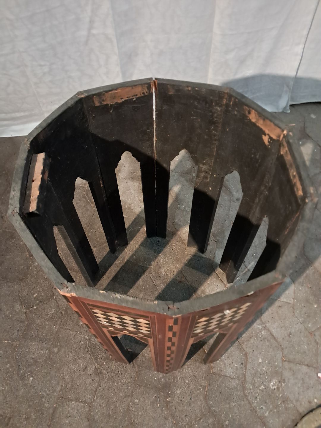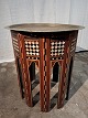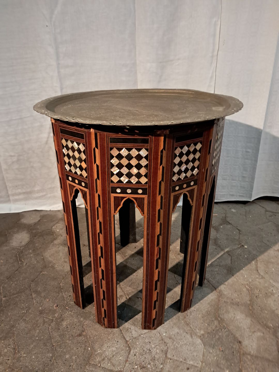 Lampebord med messingpladwe, fra 1980erne. Det har brugsspor og er revnet, men stabilt. Højde 67cm Diameter 58cm Emne nummer: 91291