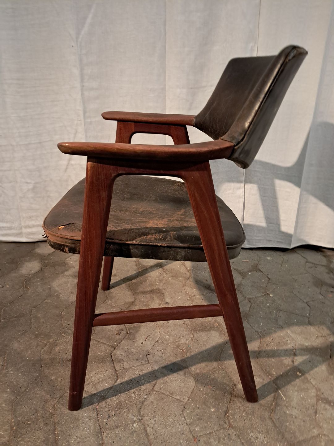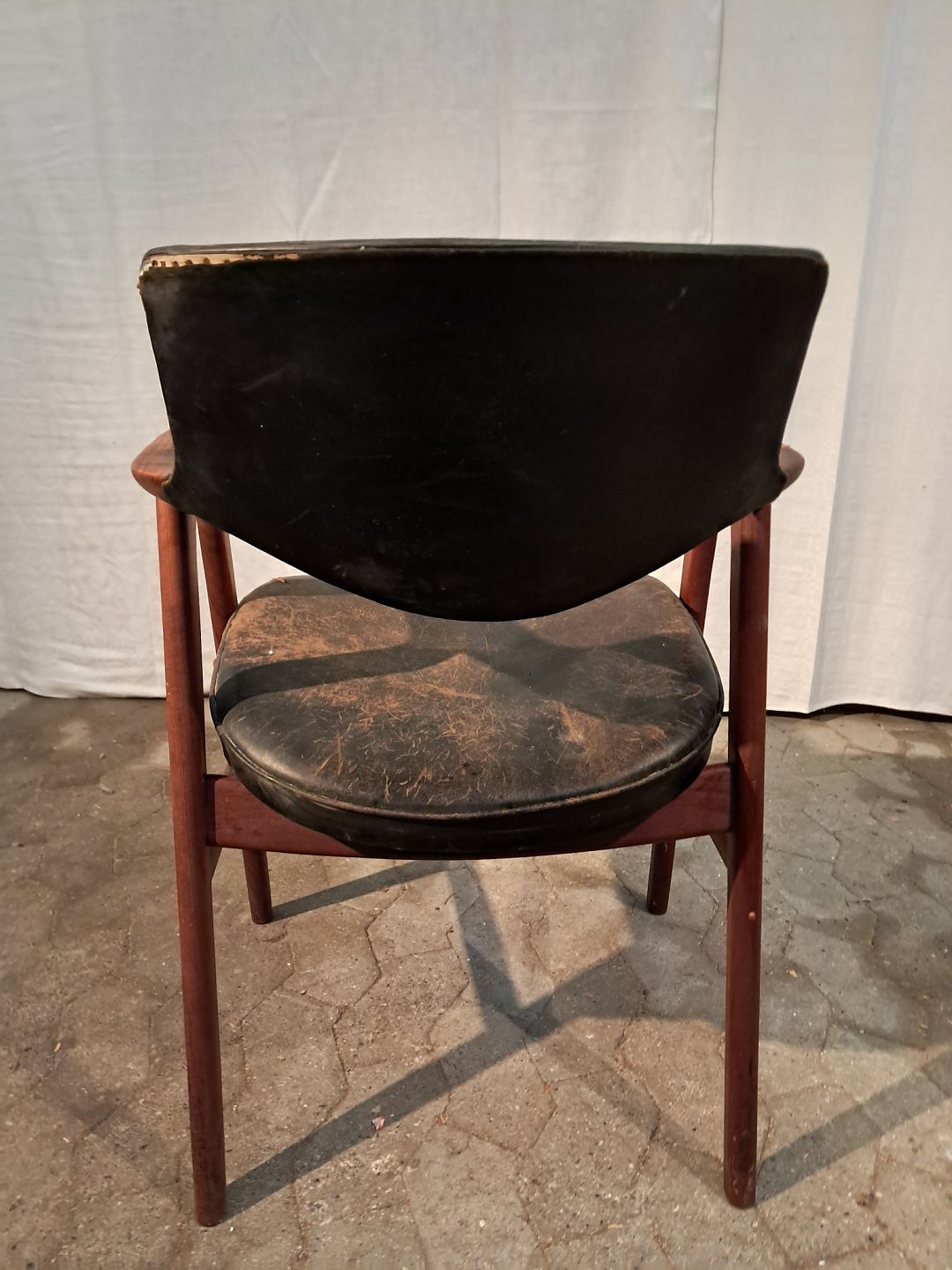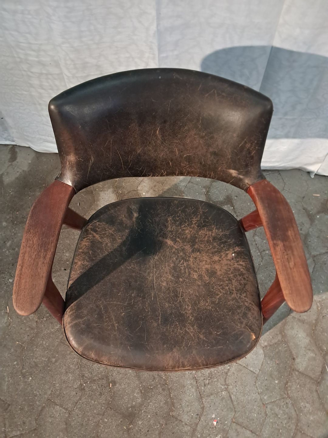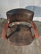 Armstol i massivt teaktræ og læder, fra 1960erne. Den har brugsspor og defekt betræk. Ryghøjde 85cm Sædehøjde 46cm Emne nummer: 91294