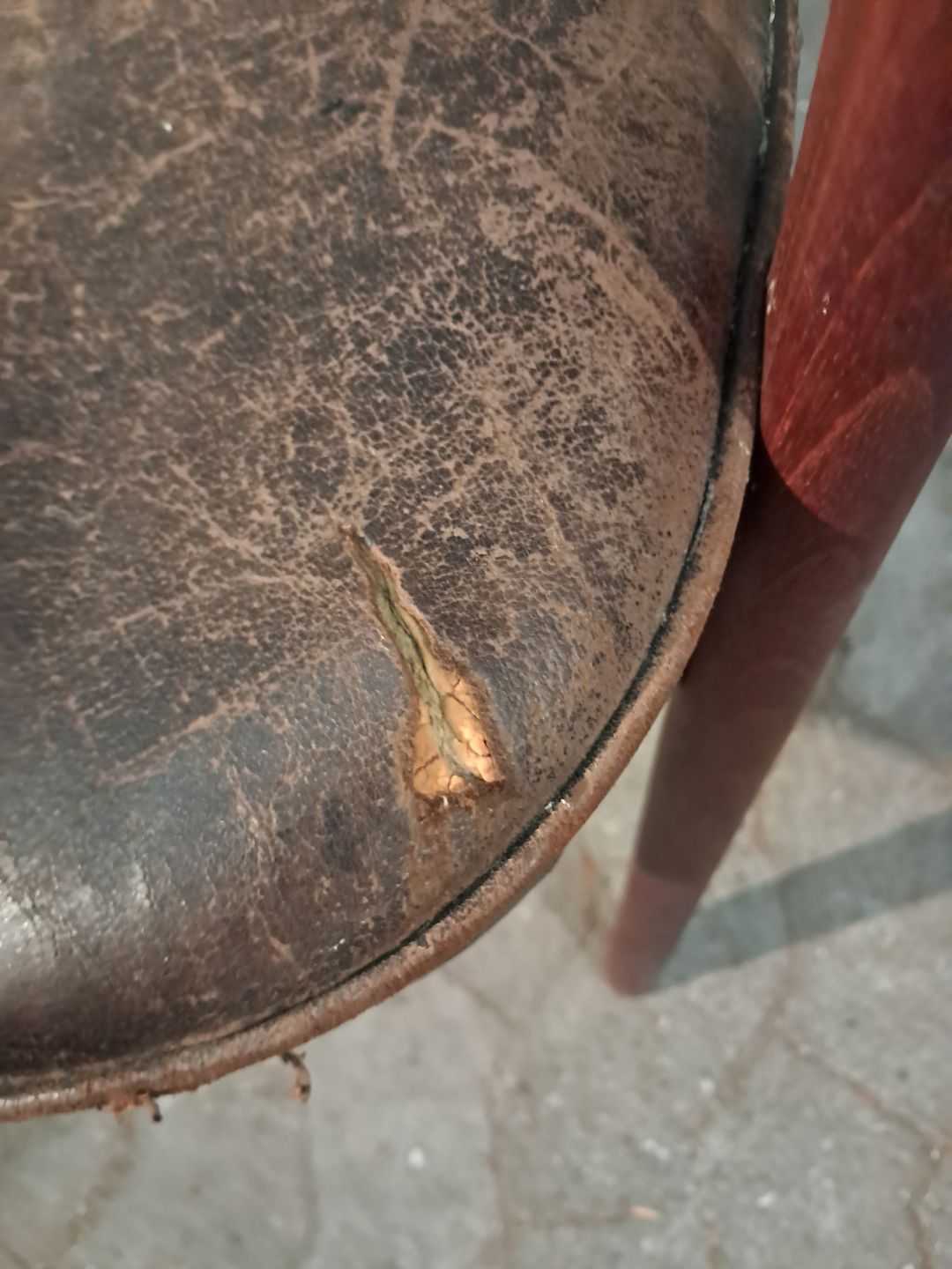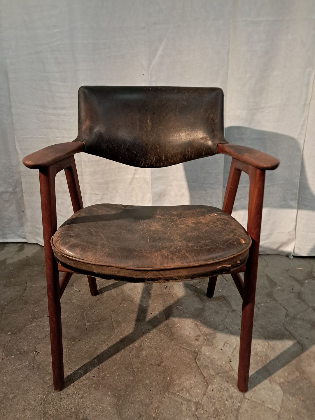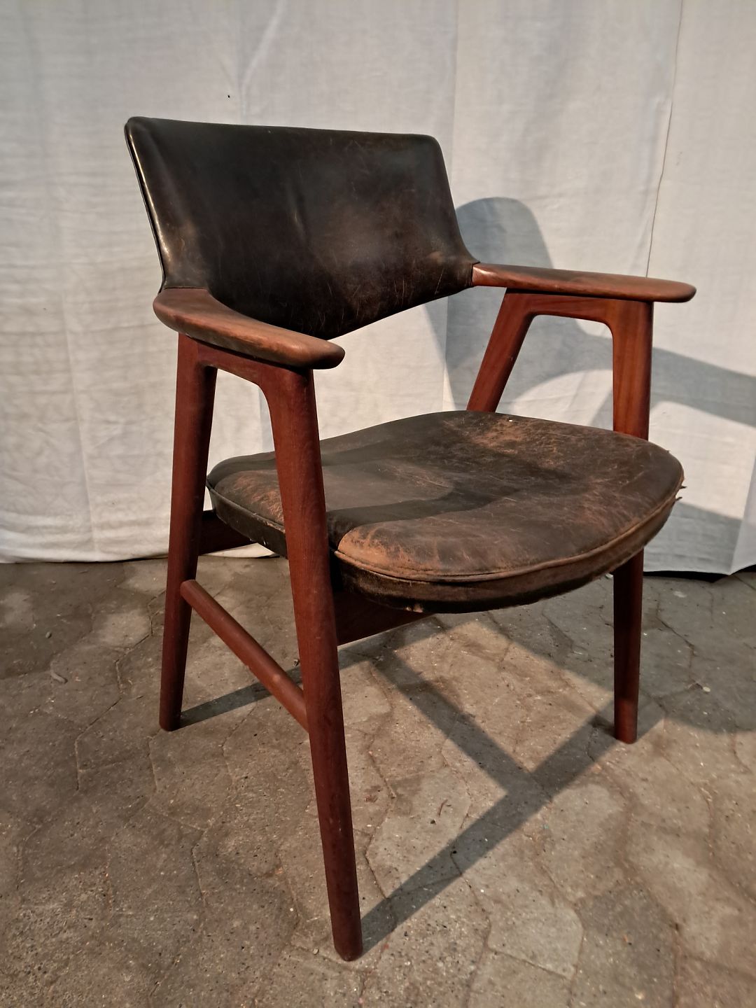 Armstol i massivt teaktræ og læder, fra 1960erne. Den har brugsspor og defekt betræk. Ryghøjde 85cm Sædehøjde 46cm Emne nummer: 91294