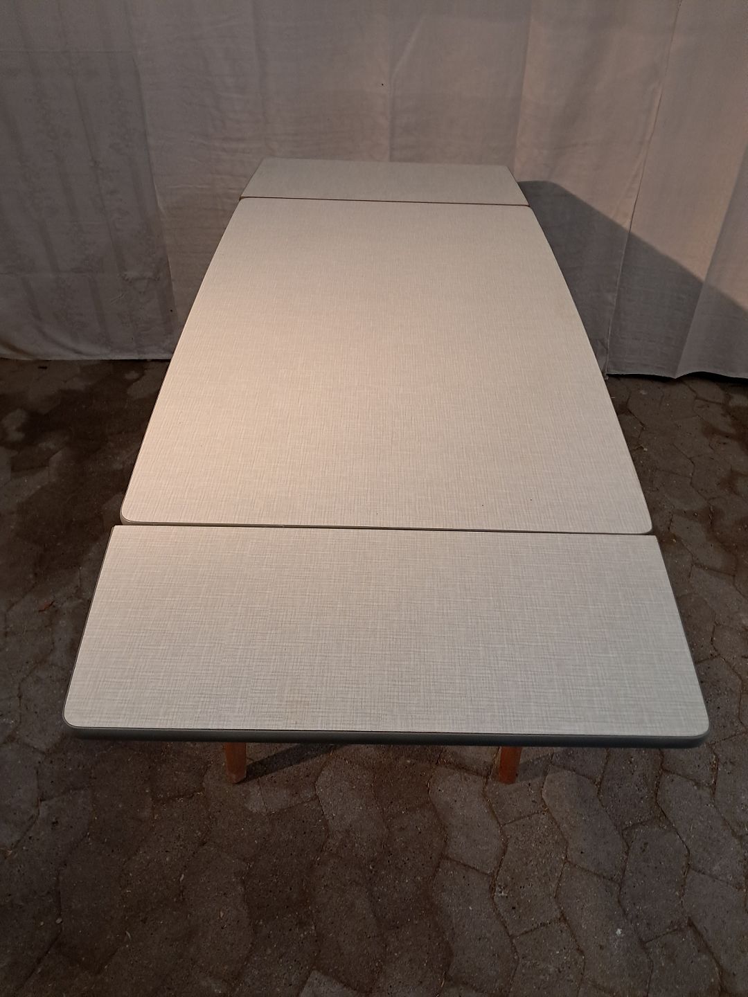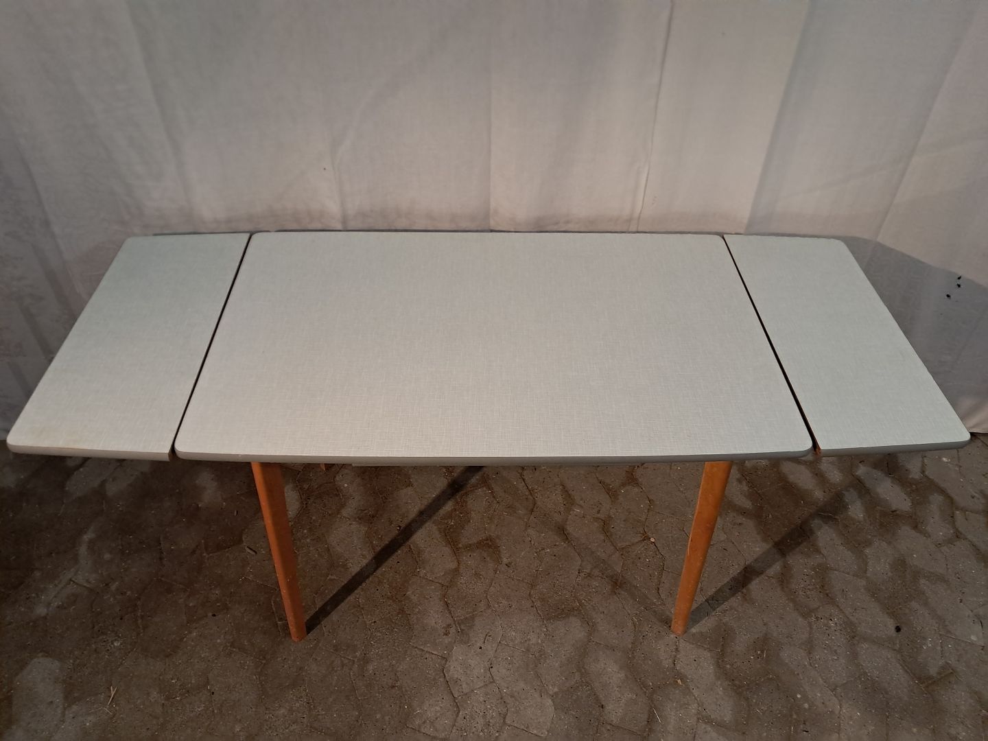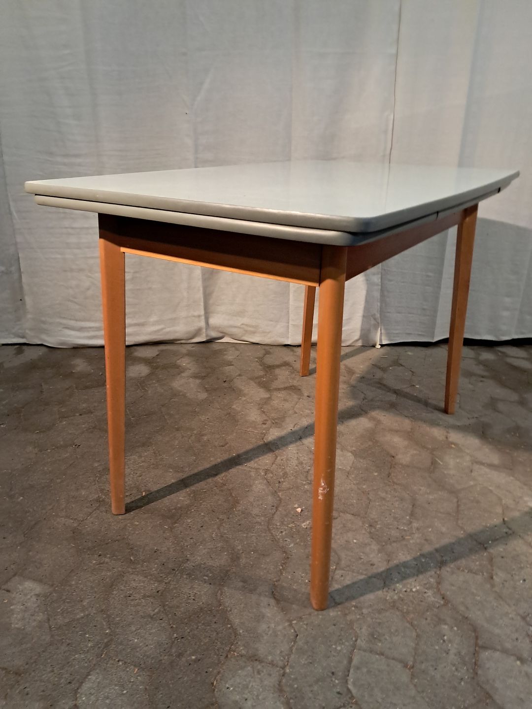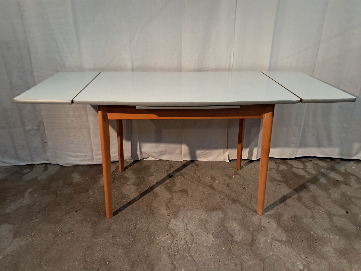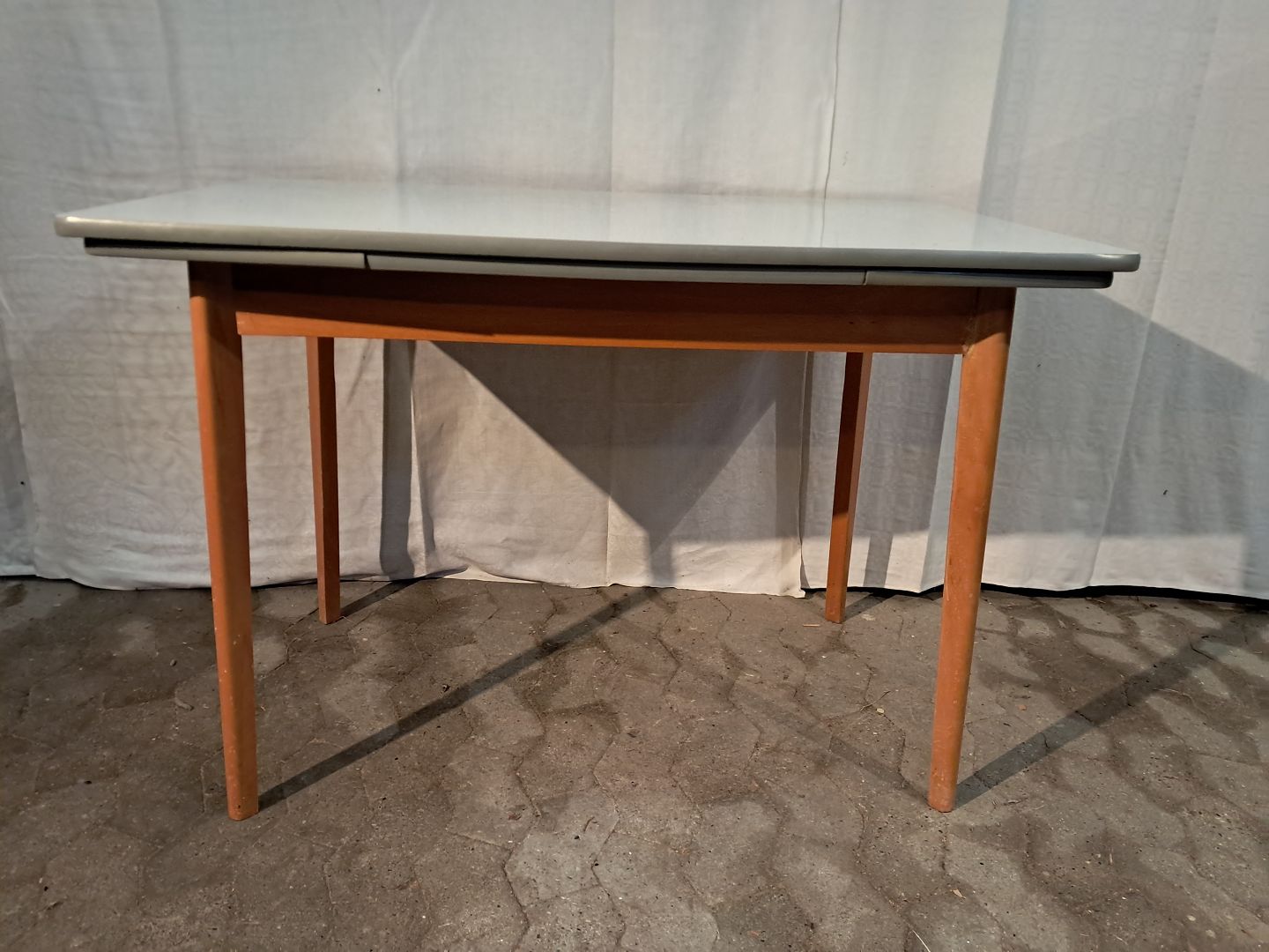 Bord i massivt bøgetræ med formikaplade og hollandsk udtræk, fra 1960erne. Det har brugsspor. Højde 70cm Bredde 75cm Længde 110cm Længde med udtræk 168cm Emne nummer: 91296