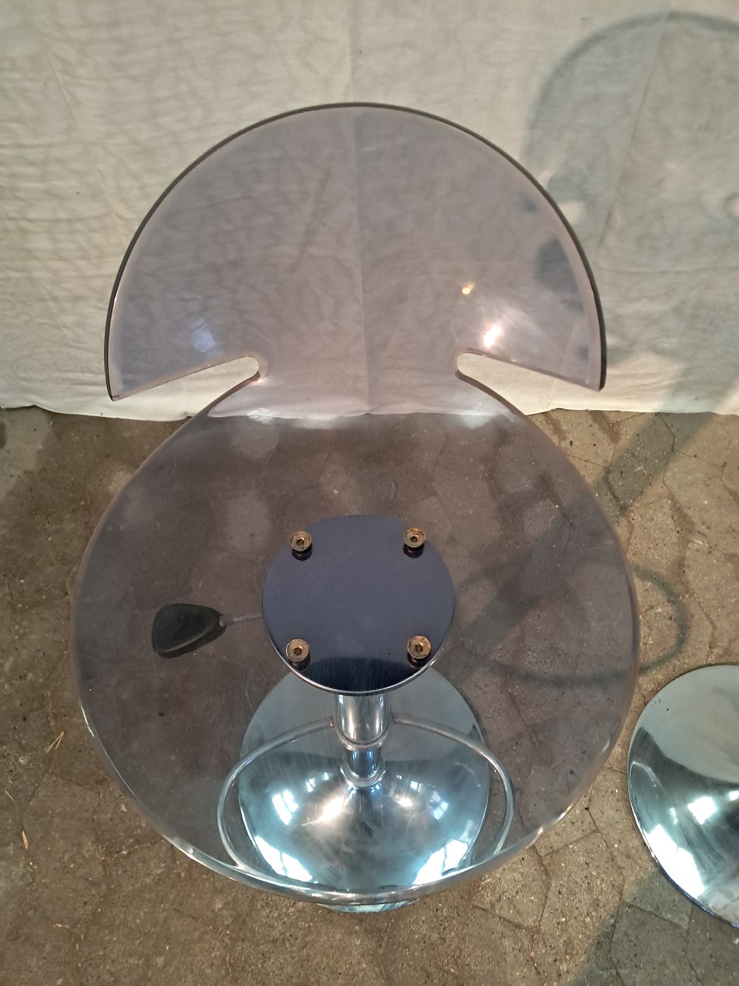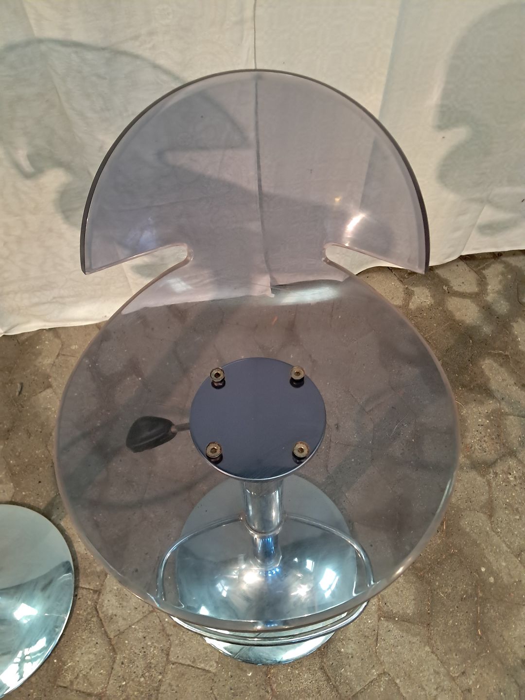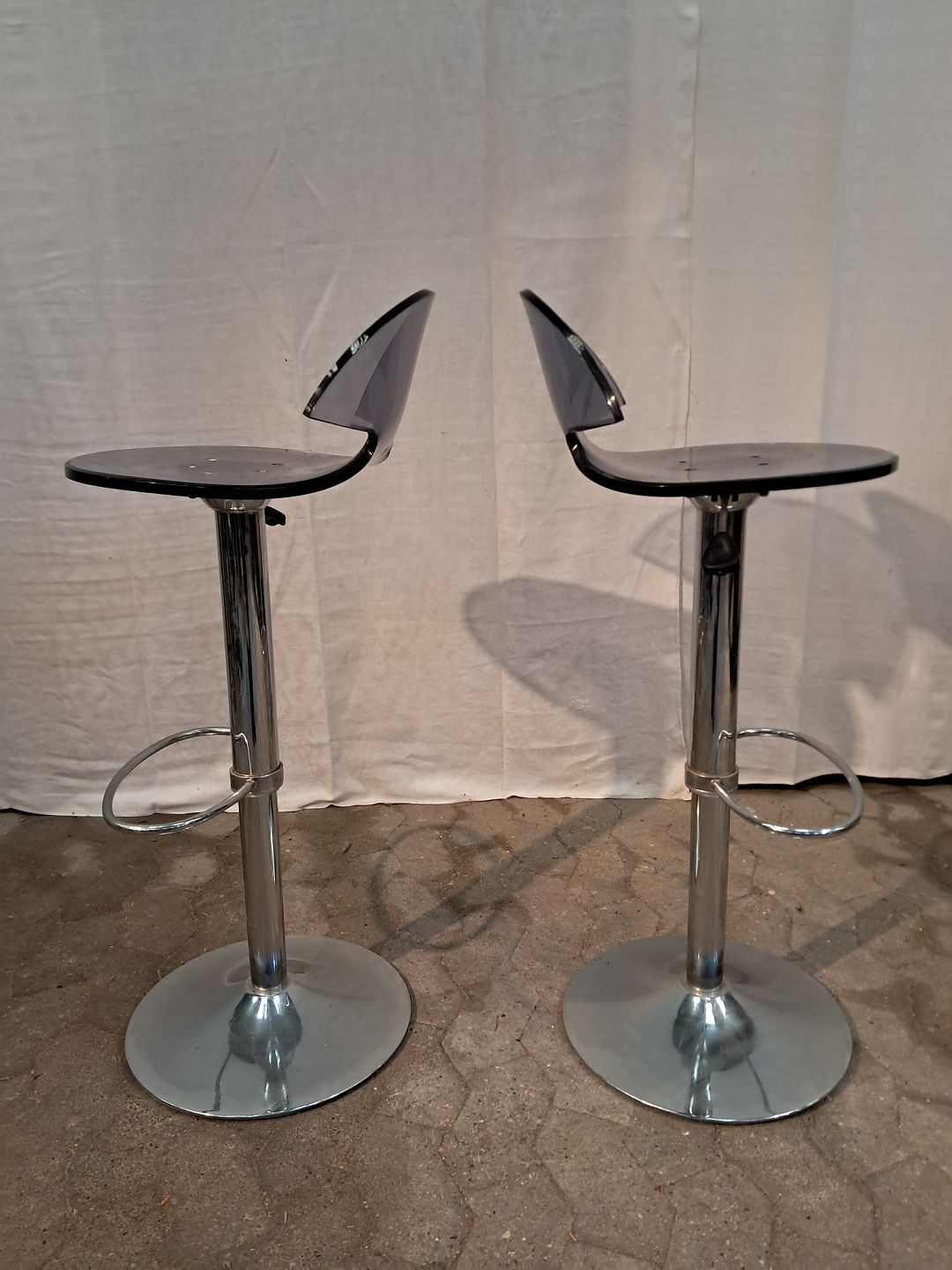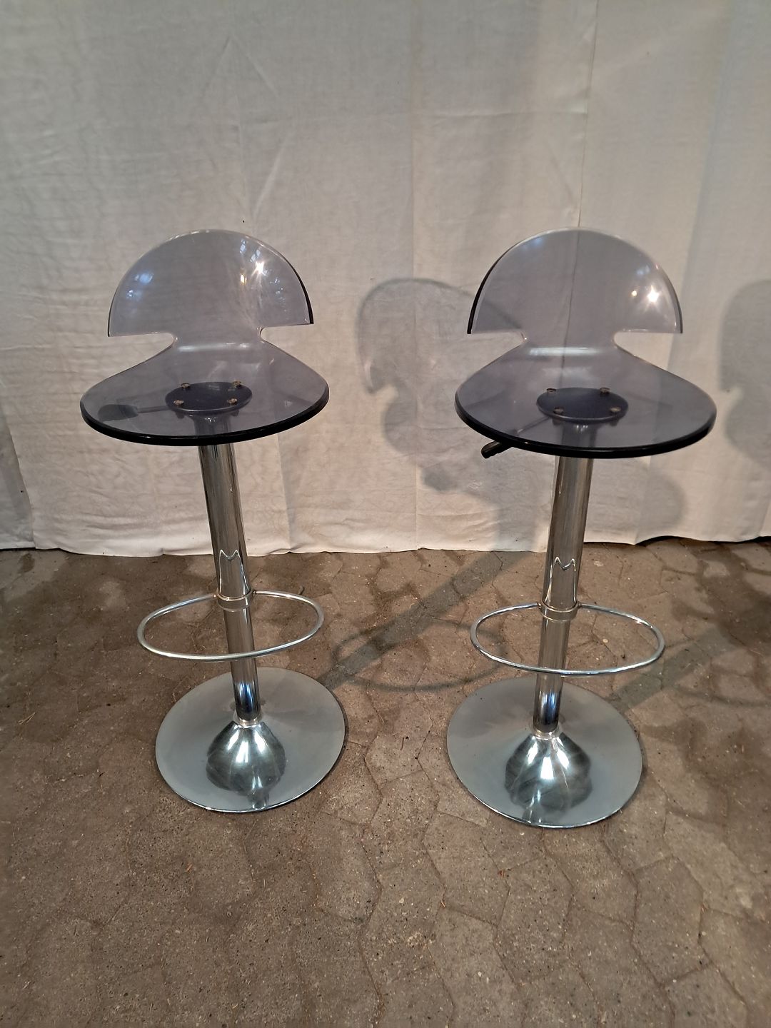 2 Barstole i metal og plast, fra 1980erne. De har brugsspor. Ryghøjde 97cm til 76cm Sædehøjde 79cm til 58cm Emne nummer: 91302
