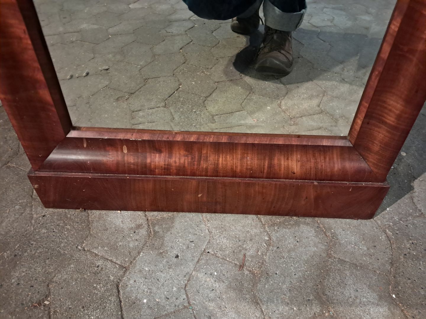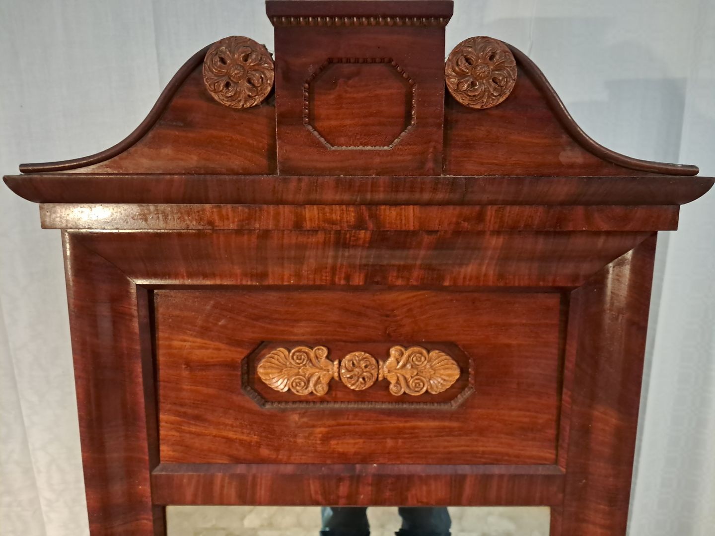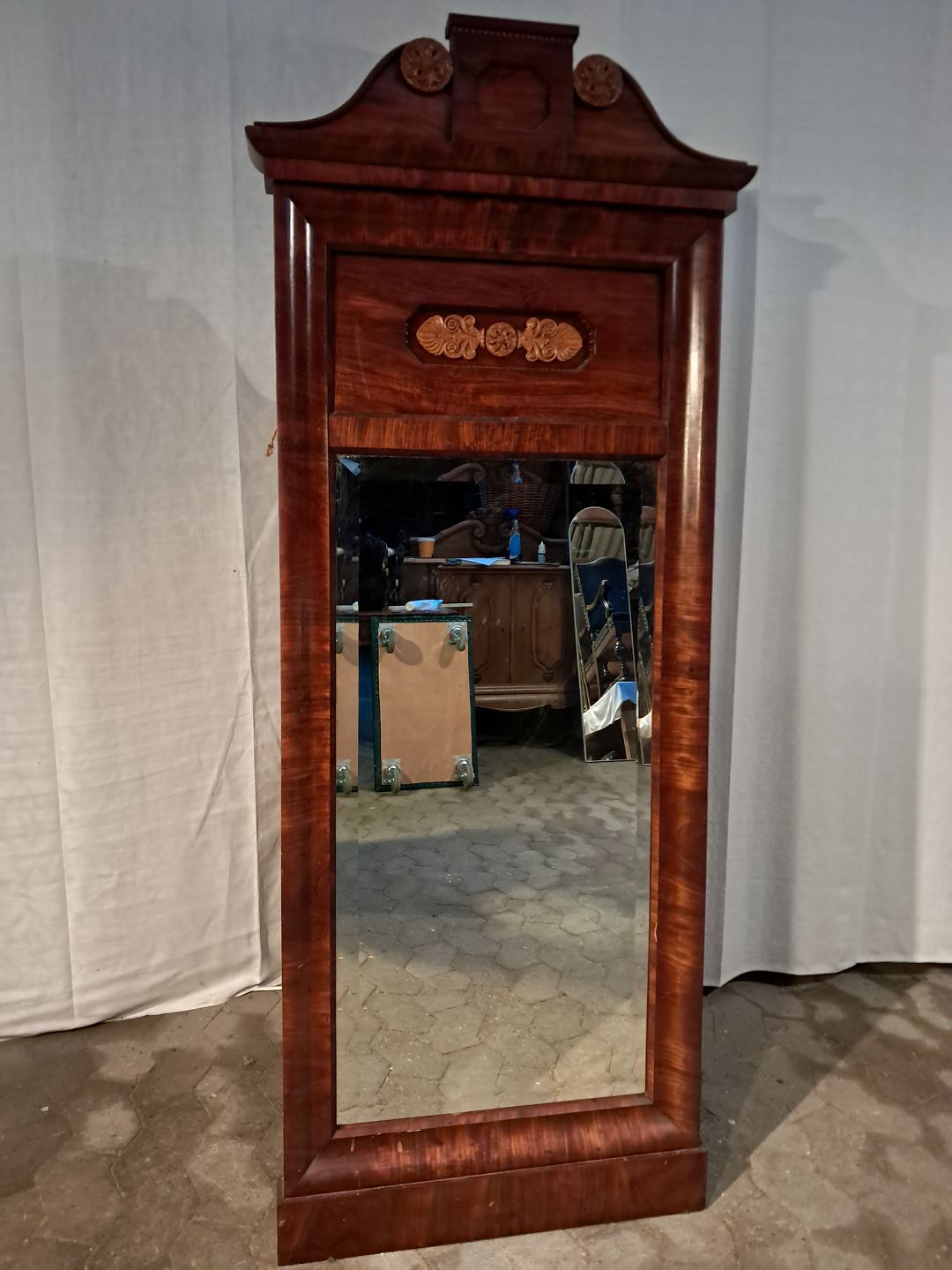 Spejl i fineret mahogni, fra 1900erne.