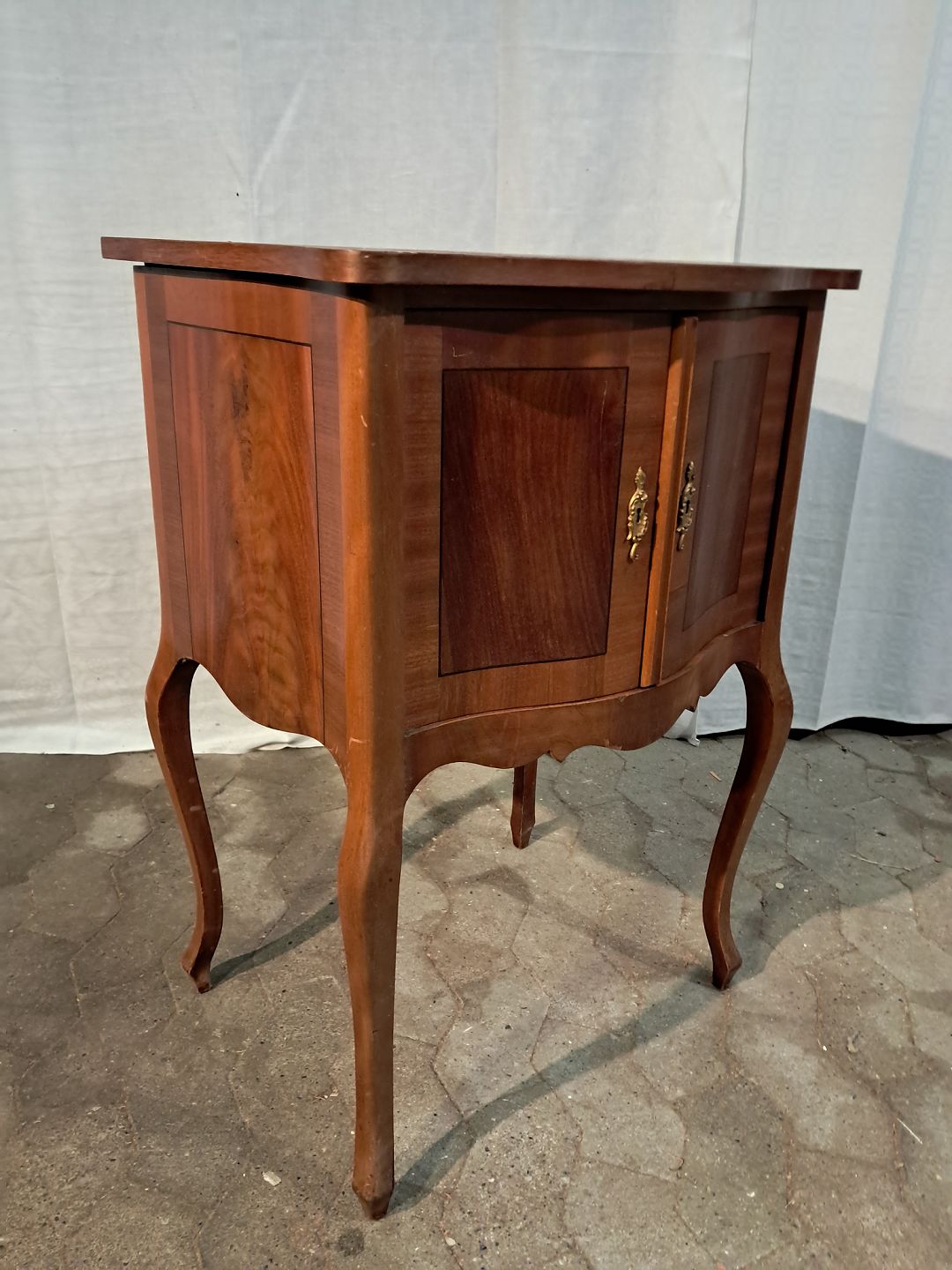 Skab i fineret mahogni og massivt bøgetræ, fra 1980erne. Det har brugsspor og højre bagben har en revne. Højde 82cm Bredde 56cm Dybde 47cm Emne nummer: 91336