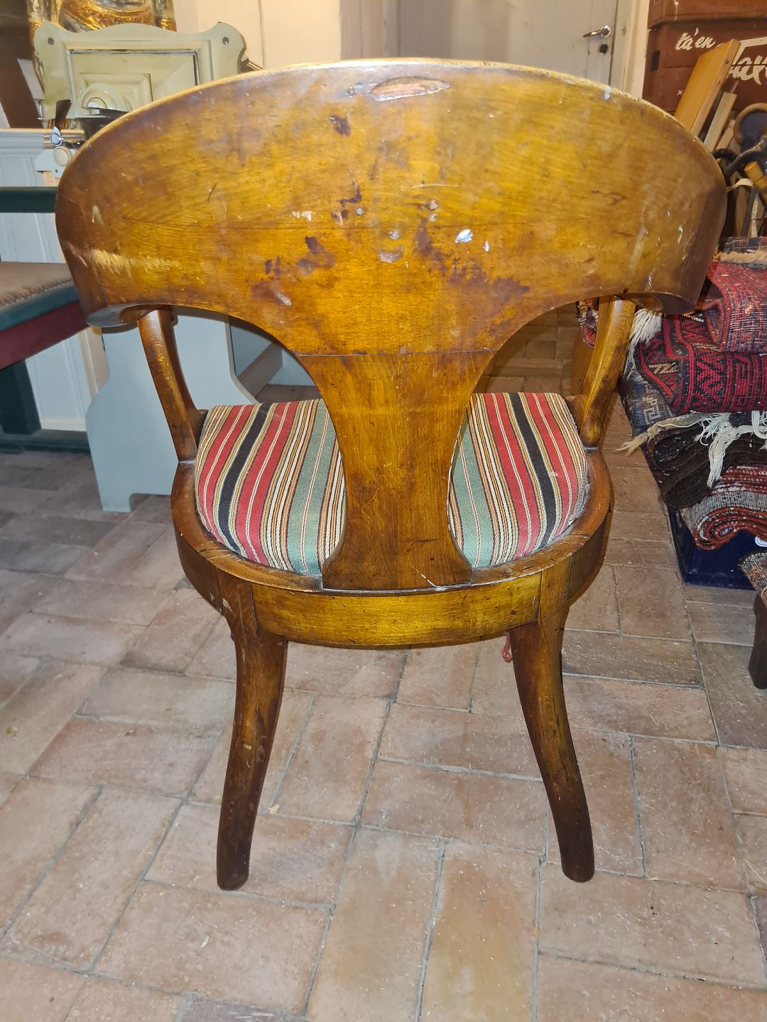 Armstol udført i mahogni samt sæde betrukket med uldstof. Udført ca. 1910. Pæn brugt stand. H. 82 cm. B. 56 cm. D. 61 cm. SH. 45 cm. Emne nummer: 80650