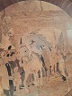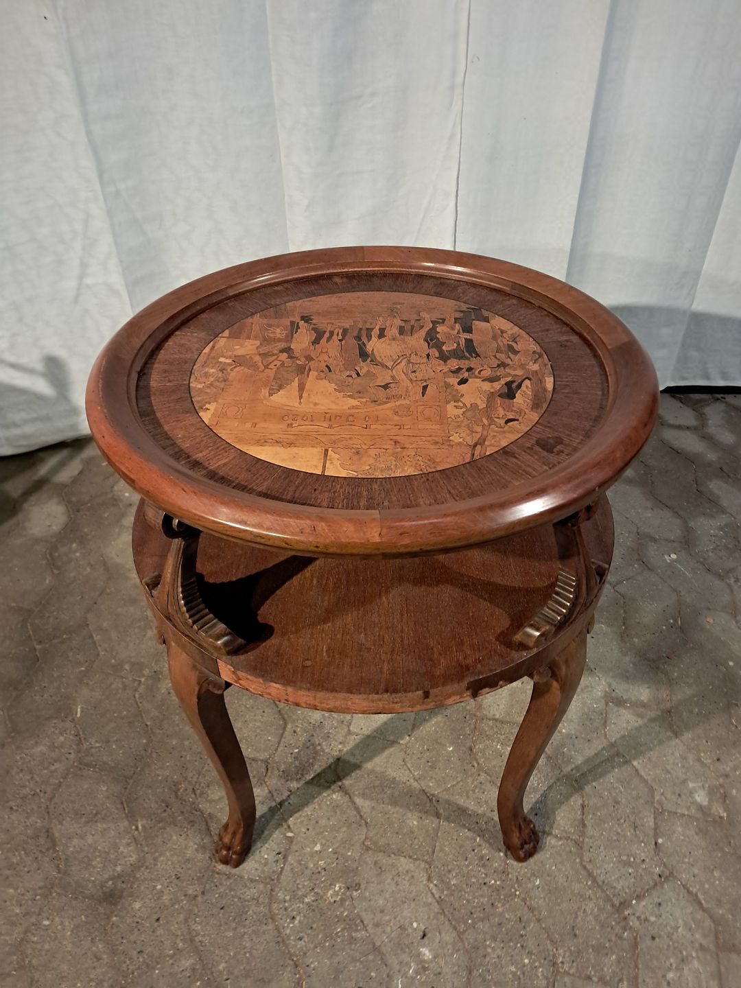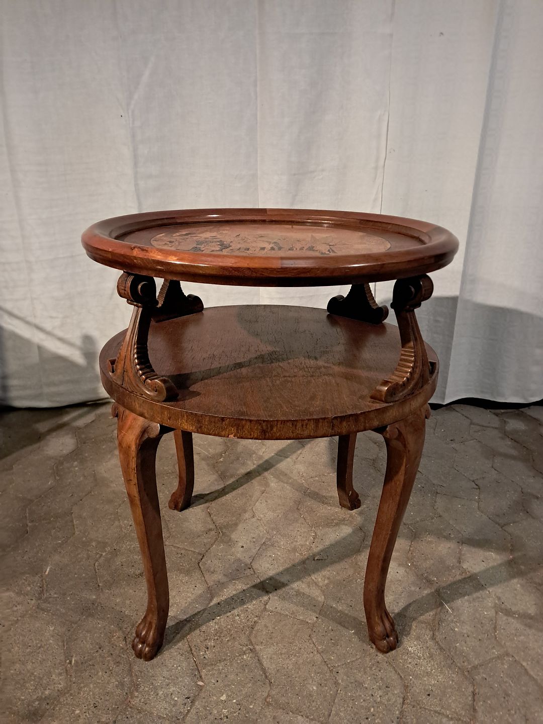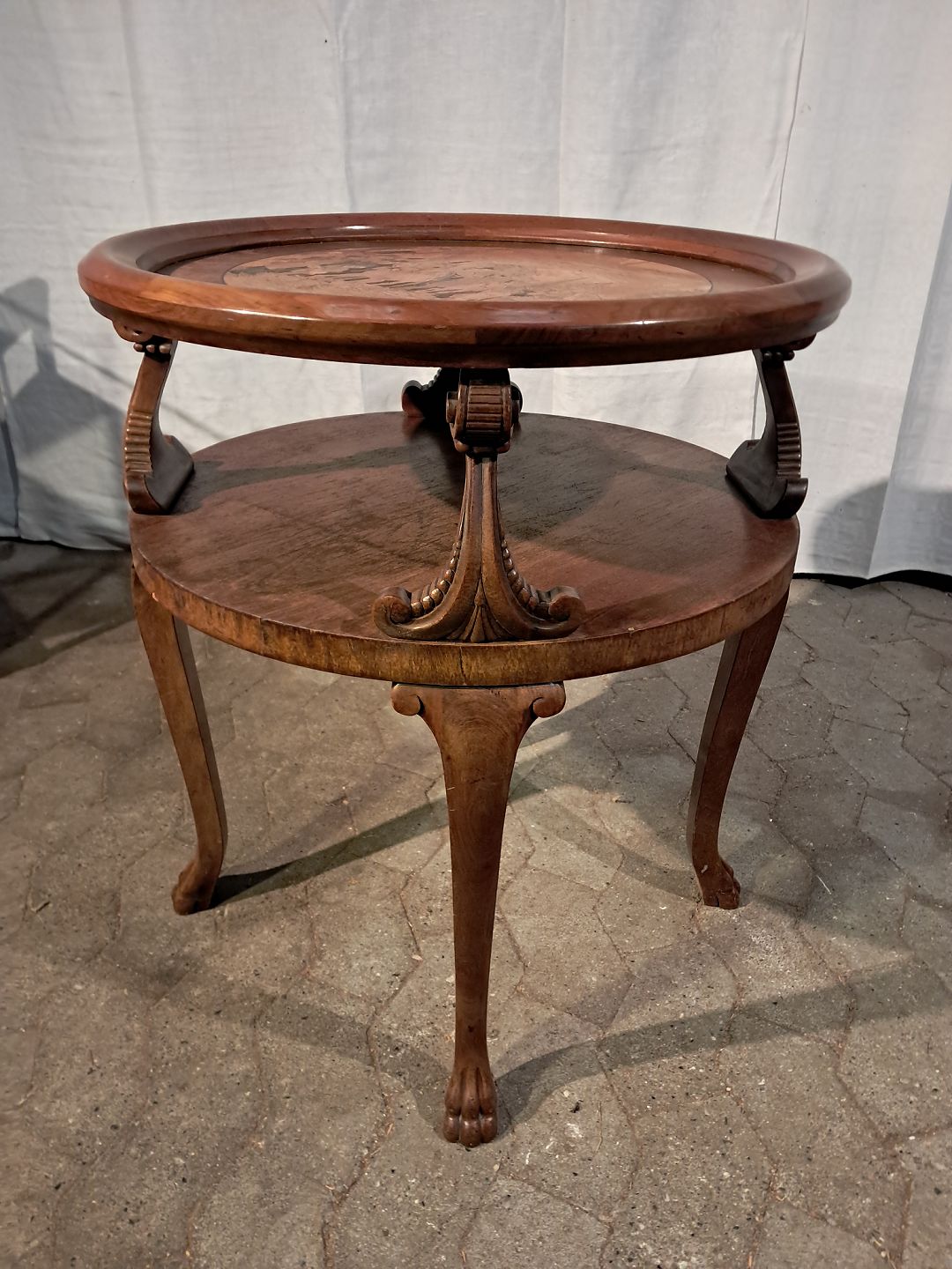 Bord med motiv af Christian X i Sønder Jylland,det er i frineret mahogni, fra 1920erne. Det har brugsspor og defekt finer og en lille skade. (se foto) Højde 70cm Diameter 61cm Emne nummer: 91356