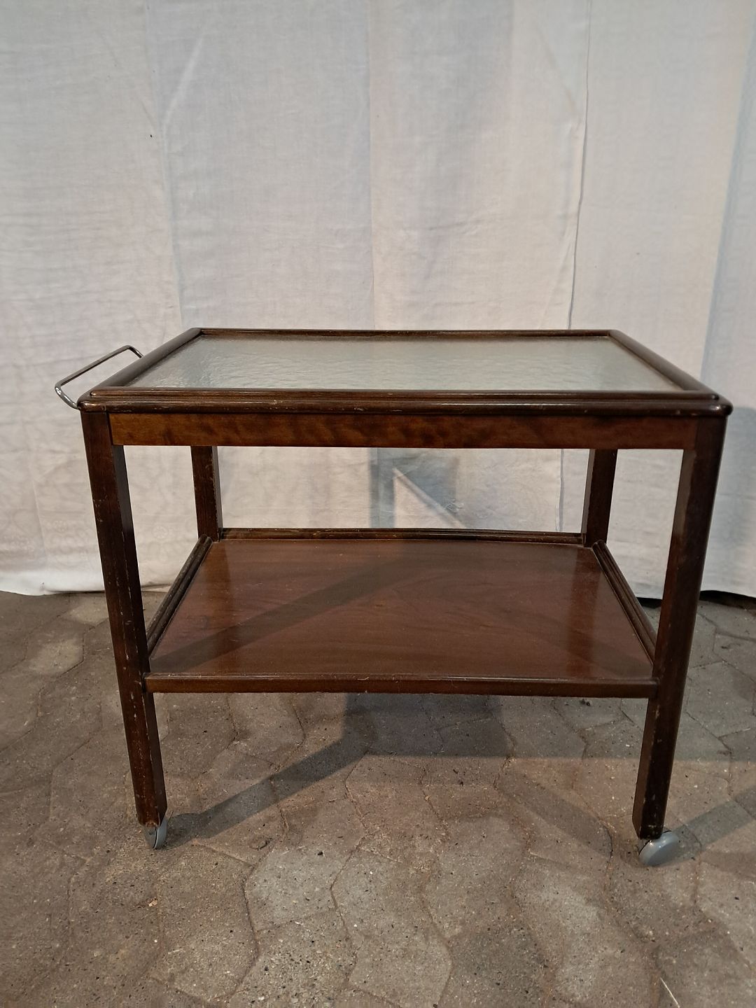 Bord i massivt birketræ med glasplade, fra 140erne. Det har brugsspor og hjulene køre dårligt. Højde 62cm Bredde 44cm Længde 66cm Emne nummer: 91368