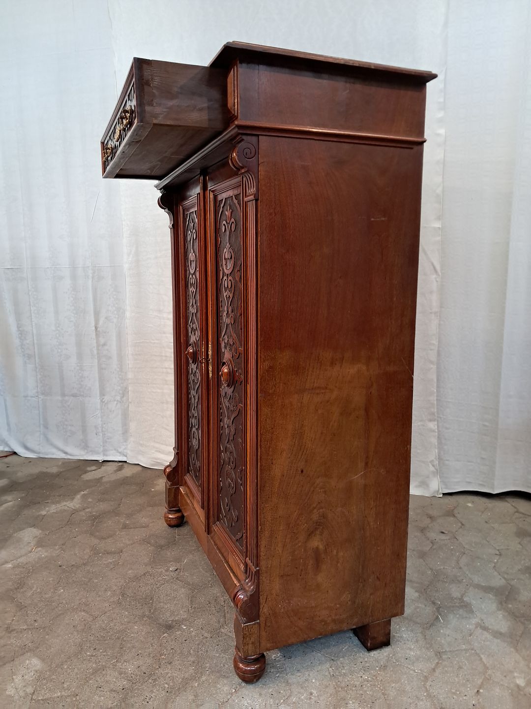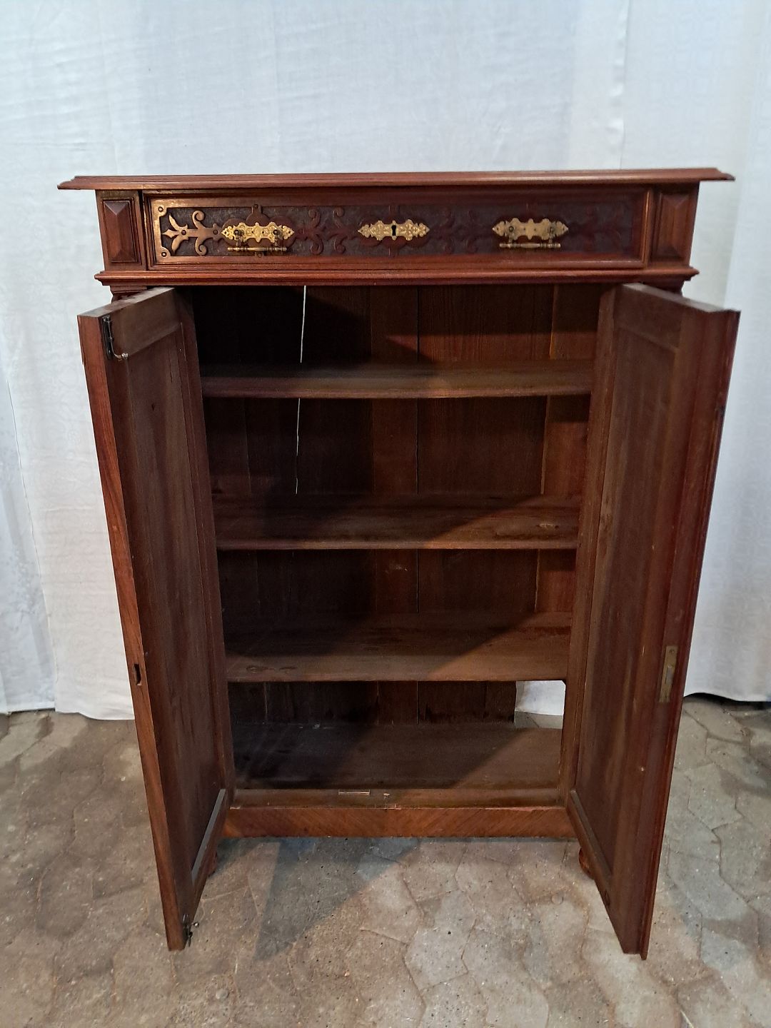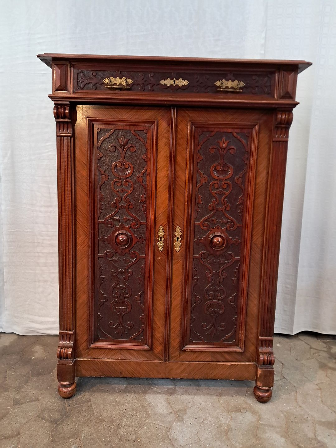 Skab i fineret mahogni, fra 1900erne. Det har brugsspor. Højde 135cm Bredde 97cm Dybde 47cm Emne nummer: 91374