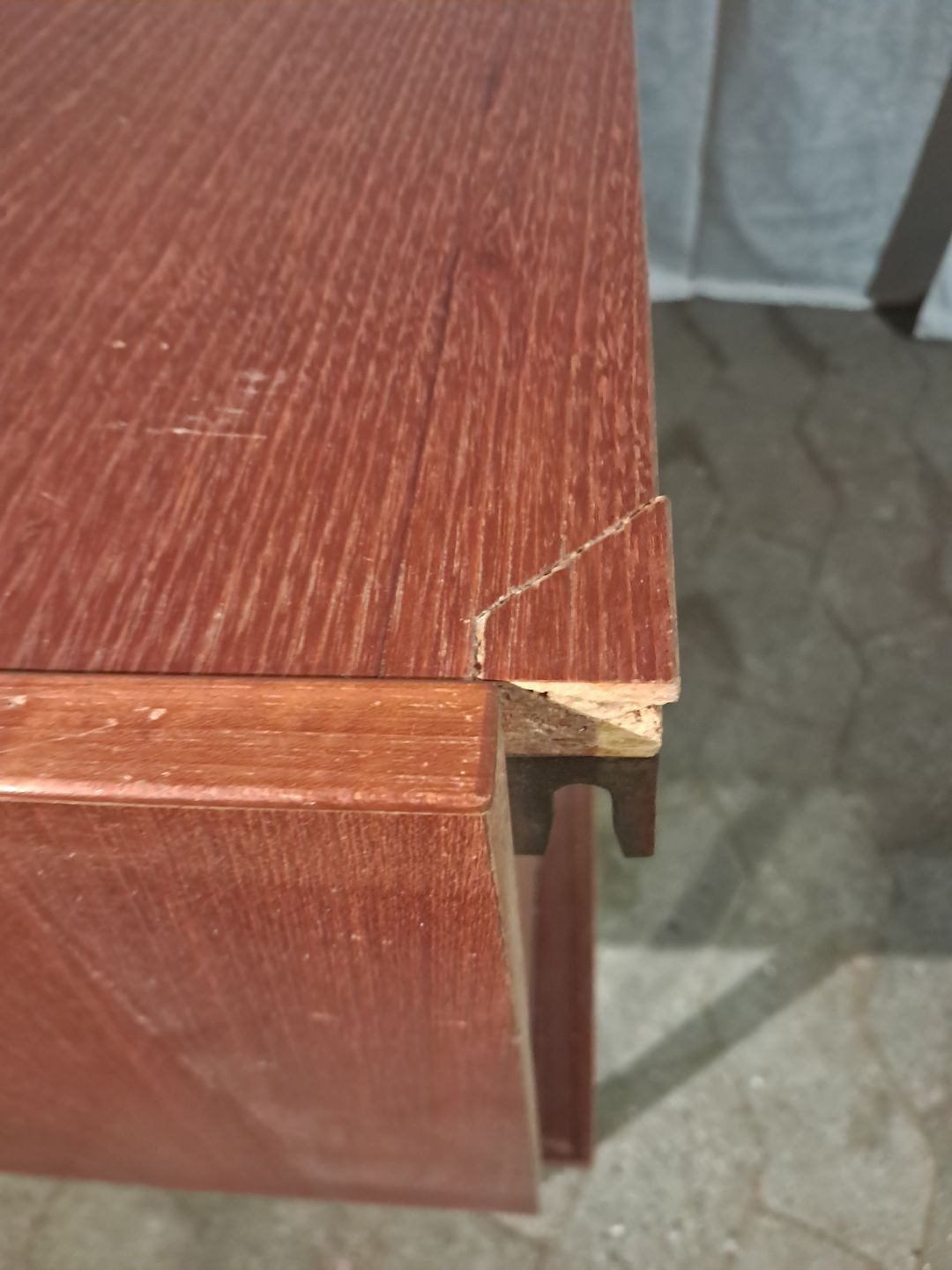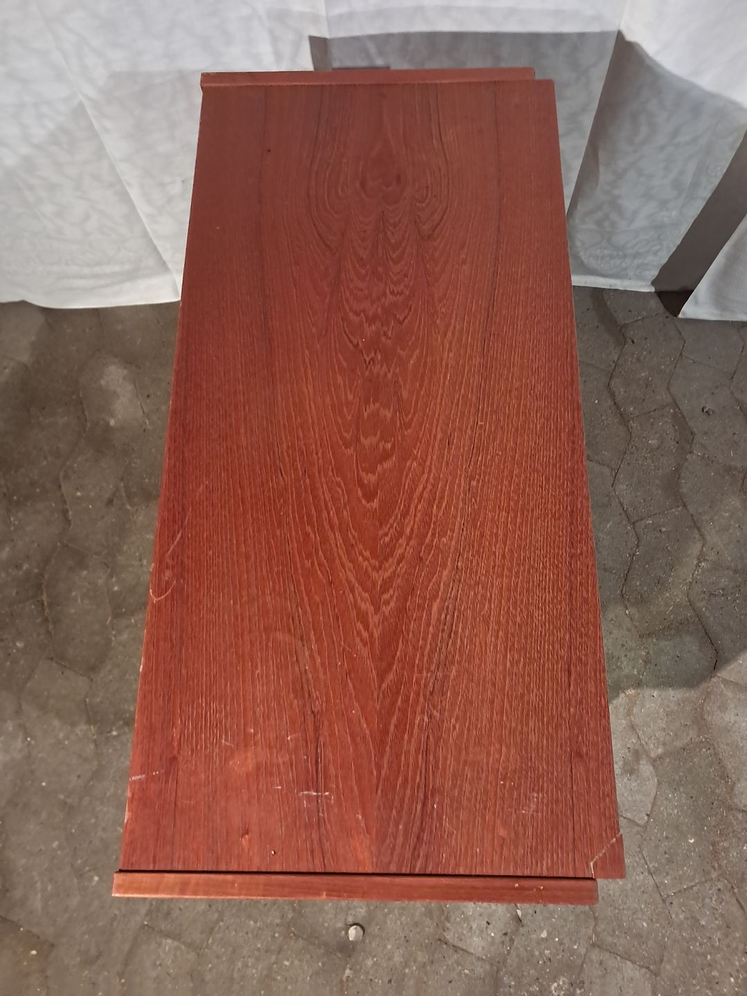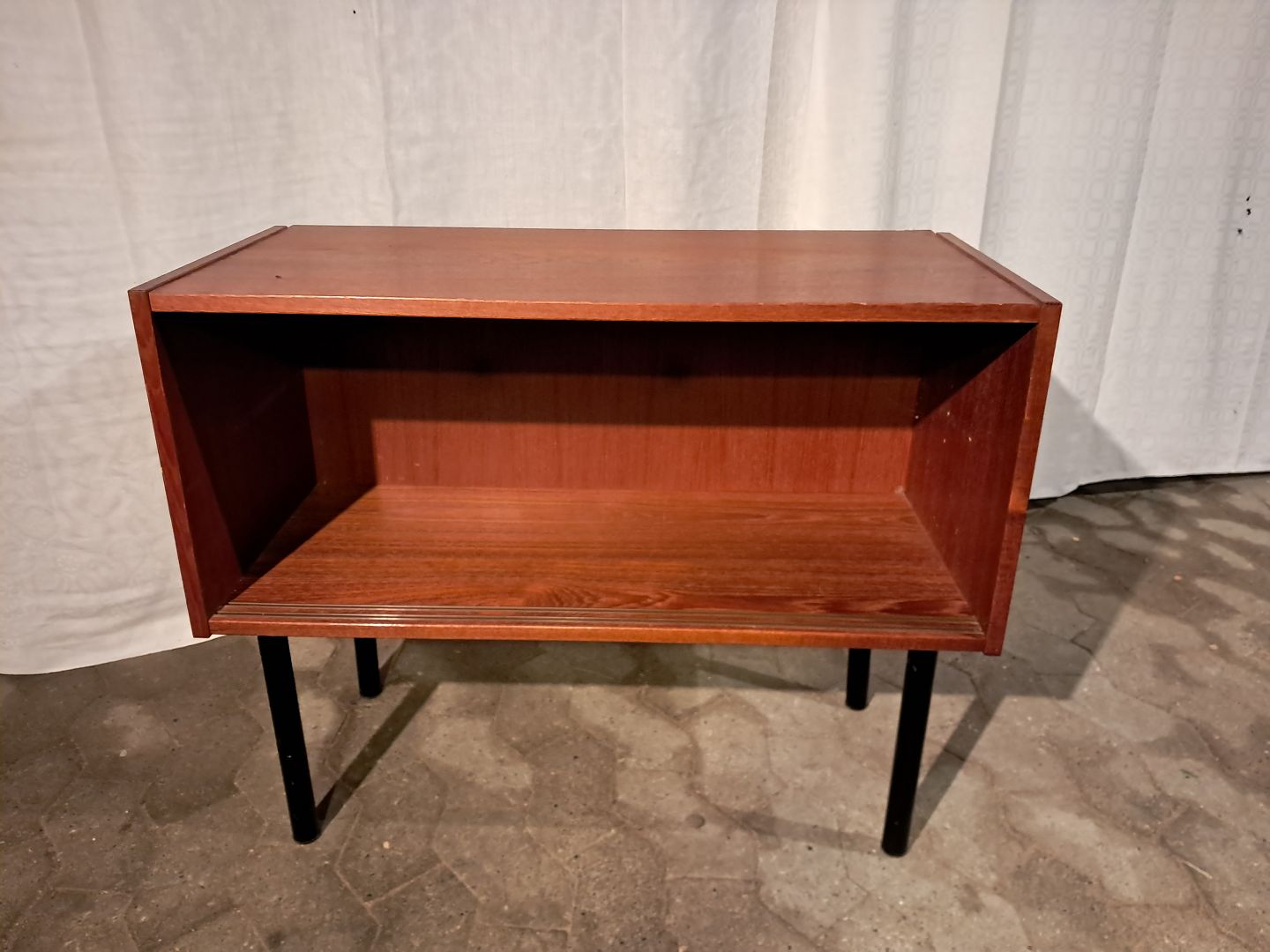 Skab i fineret teaktræ, fra 1960erne. Det har brugsspor og finer defekter. Højde 65cm Bredde 80cm Dybde 38cm Emne nummer: 91383