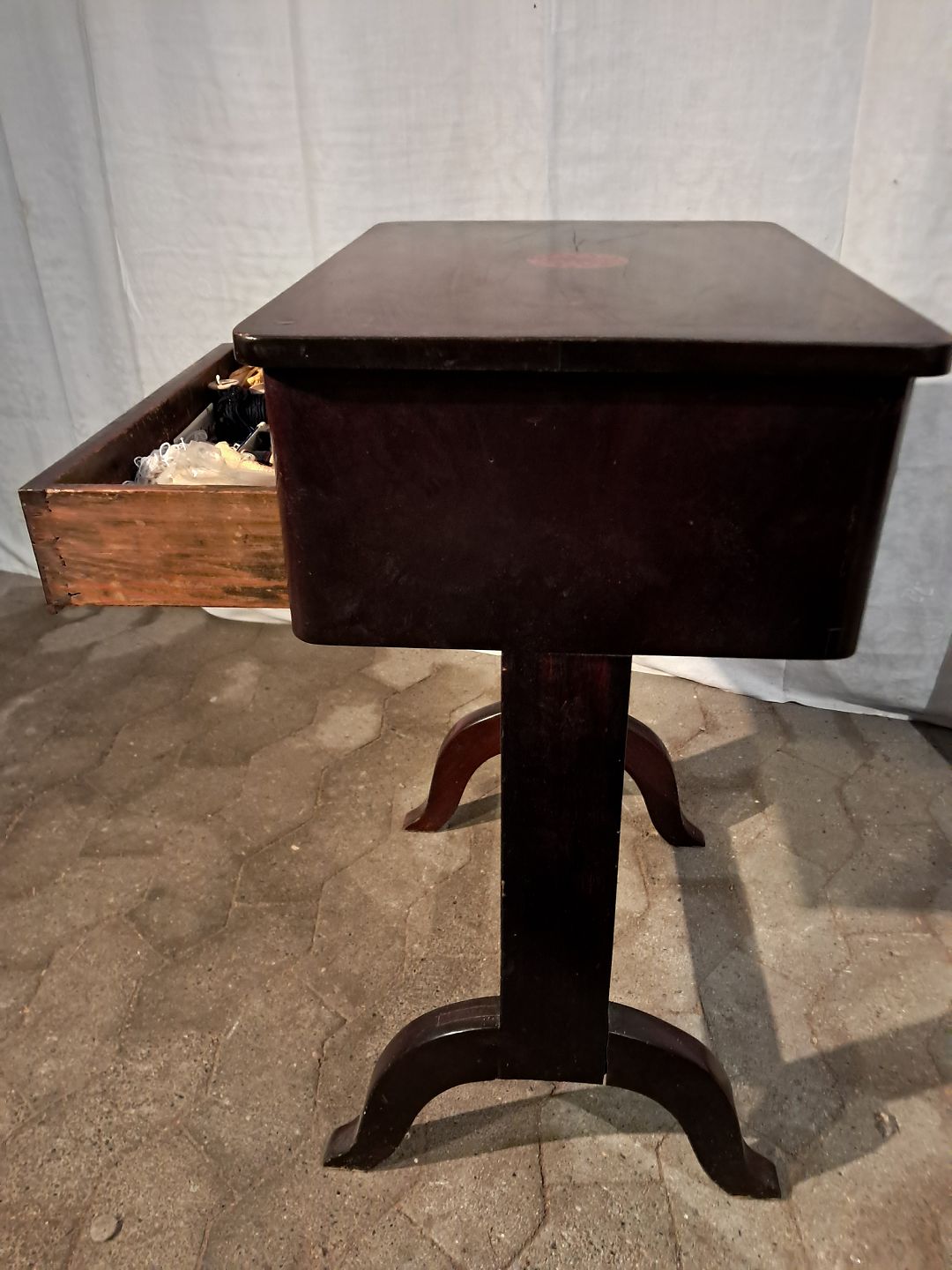 Sybord i fineret mahogni, fra 1900erne. Det har brugsspor. Højde 70cm Bredde 50cm Dybde 37cm Emne nummer: 91391