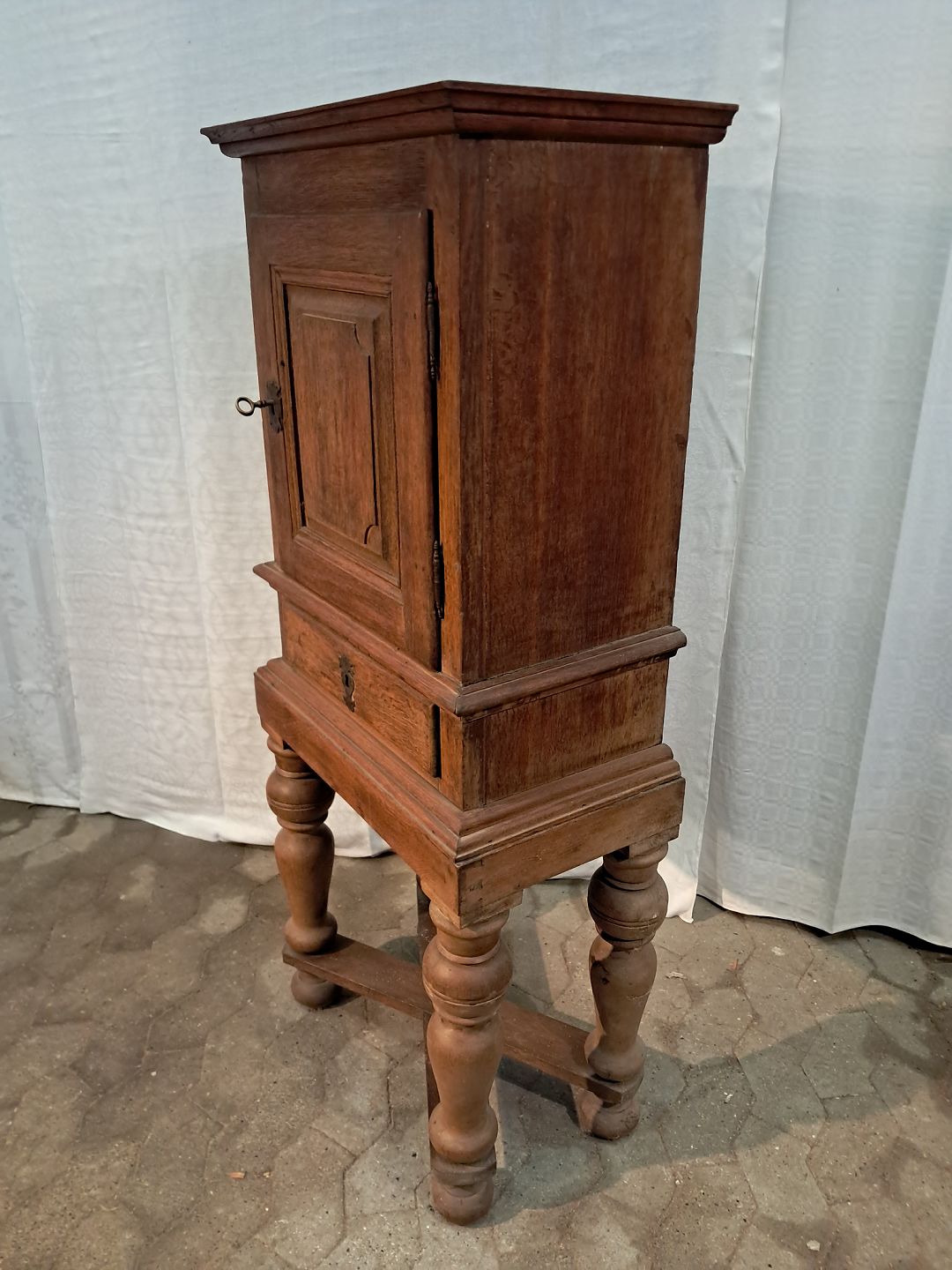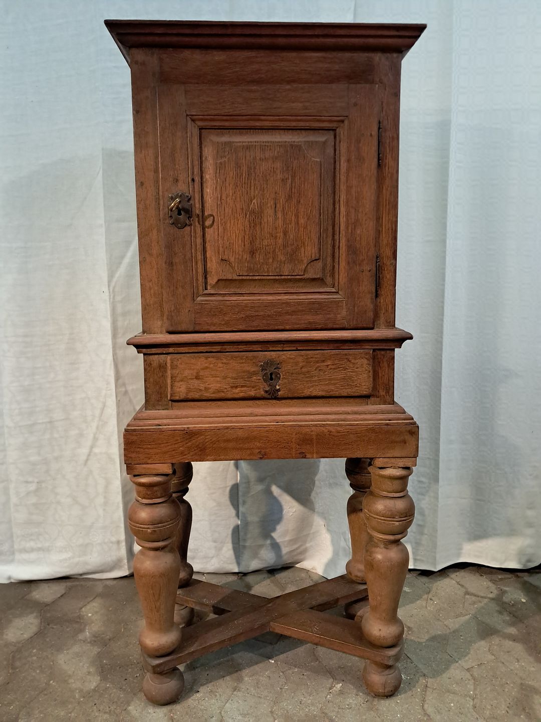 Skab i massivt egetræ, fra 1880erne. Det har brugsspor. Højde 140cm Bredde 61cm Dybde 35cm Emne nummer: 91401