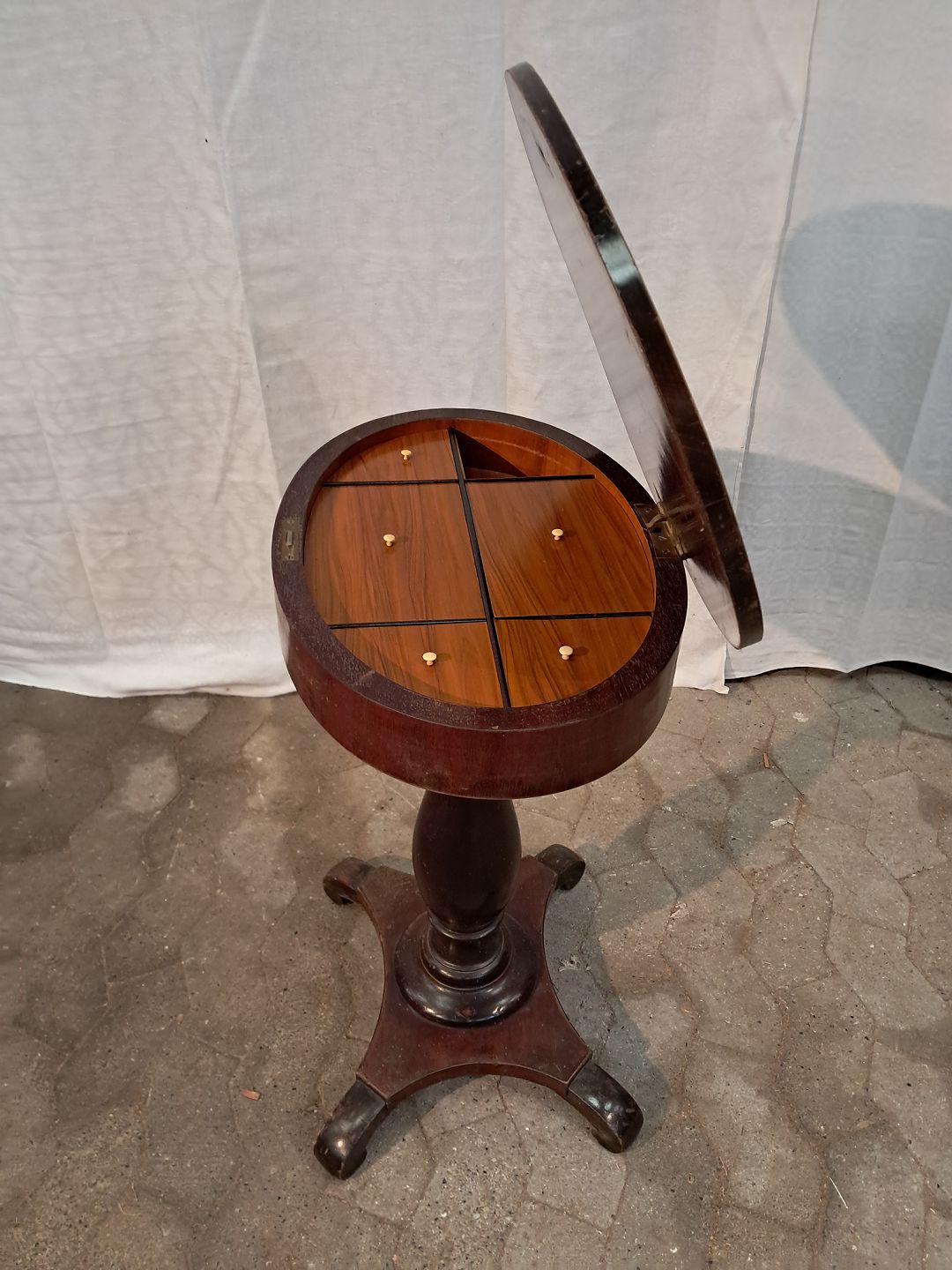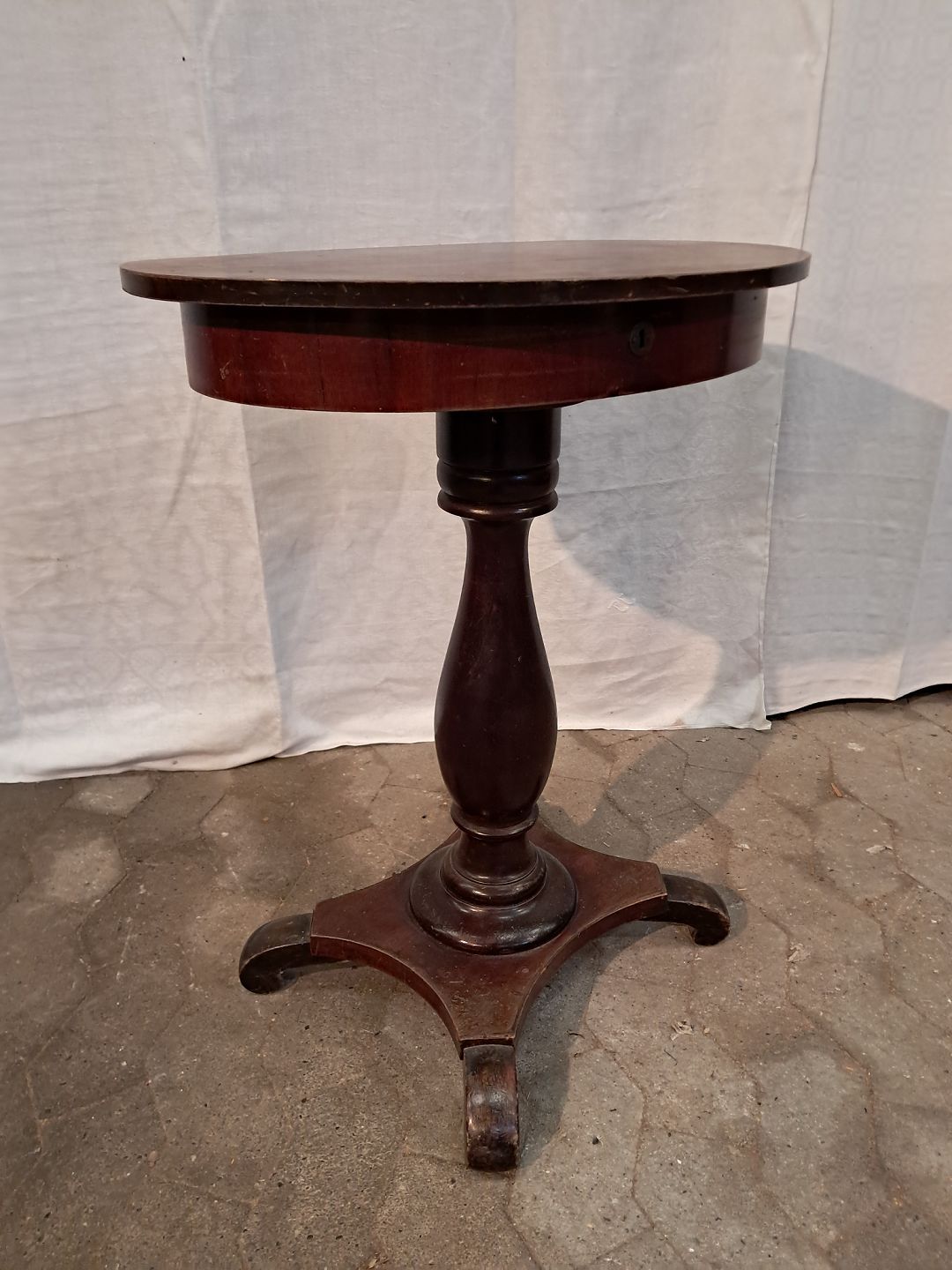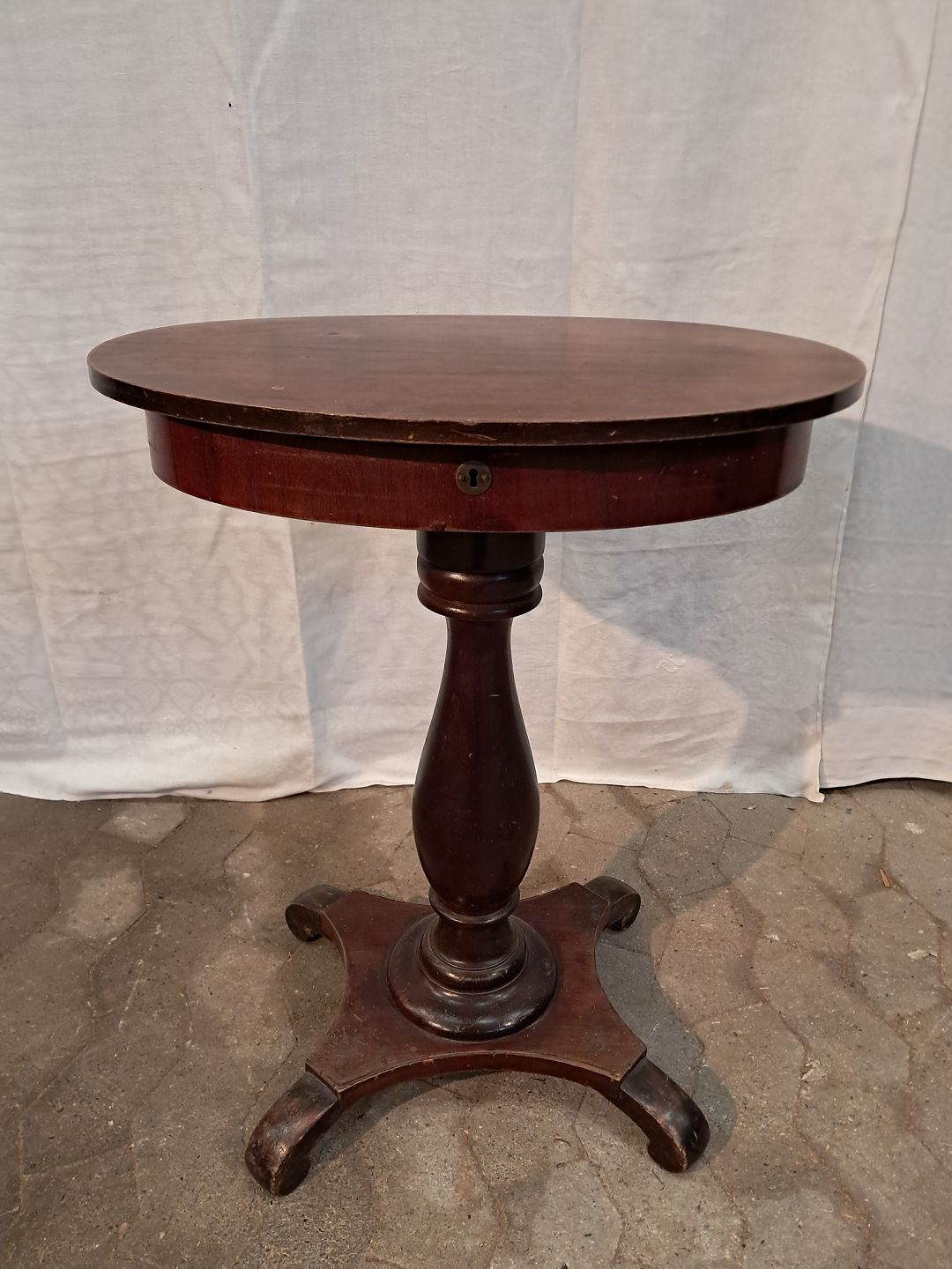 Gammelt søjlebord i fineret mahogni og massivt bøgetræ, fra 1900erne. Det har bugsspor. Højde 72cm Bredde 57cm Dybde 41cm Emne nummer: 91406
