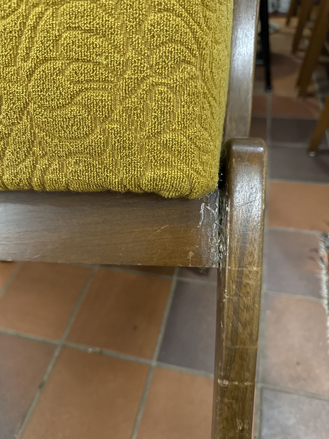 PB stand, fremstår med slitage på armlæn samt samt reparation fra tidligere skade på forben, se foto.