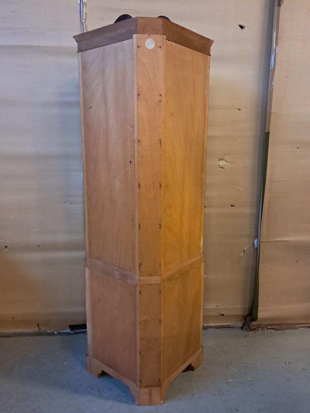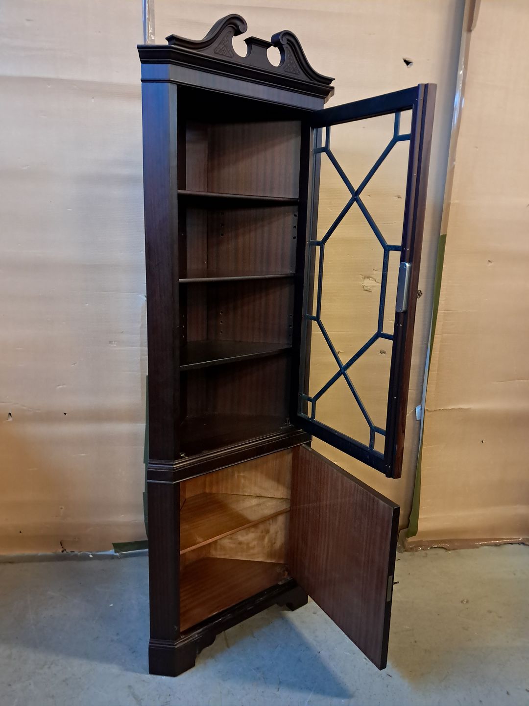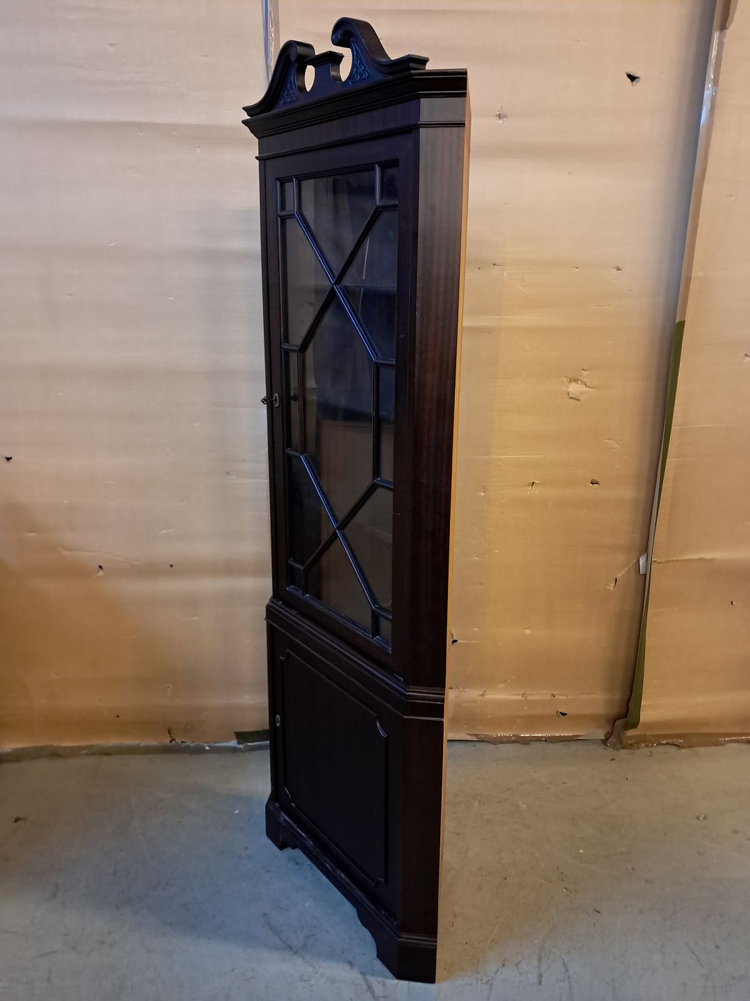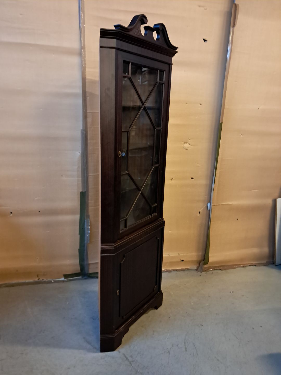 Hjørneskab i fineret mahogni, fra 1980erne. Det har brugsspor. Højde 182cm Bredde 67cm Dybder 47cm Emne nummer: 76053