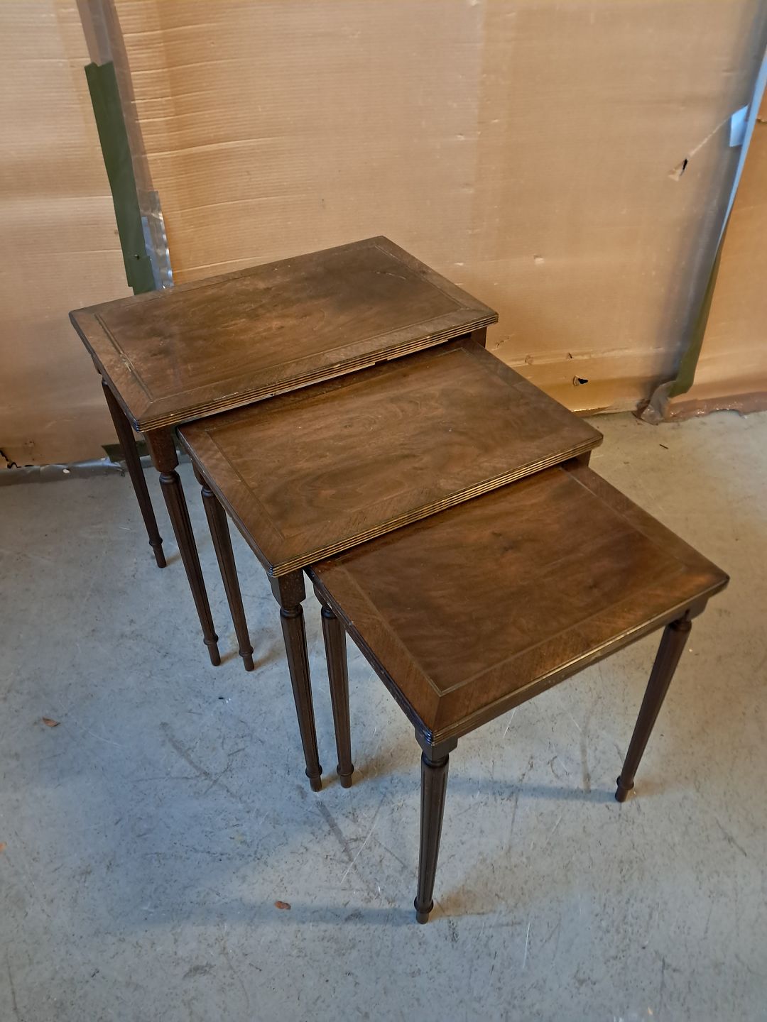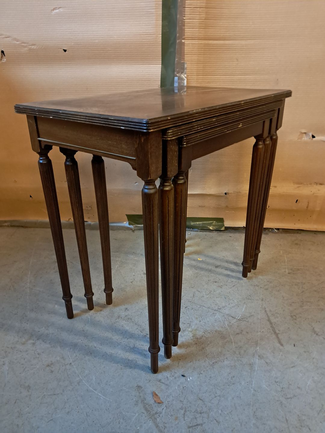 3 Indskudsborde i fineret mahogni, fra 1980erne. De har brugsspor. Højde 52cm Bredde 56cm Dybde 35cm Emne nummer: 76059
