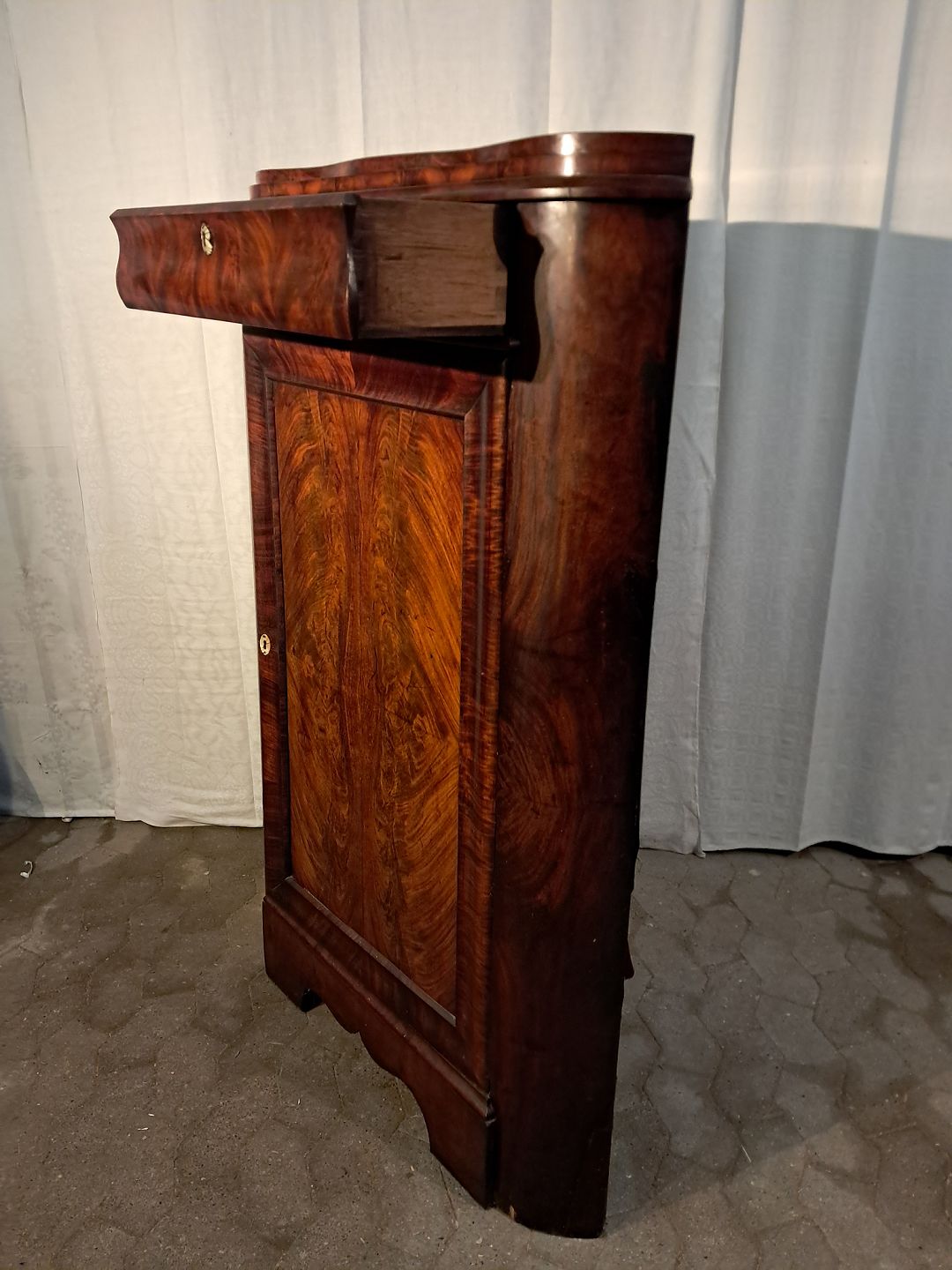 Hjørneskab i fineret mahogni, fra 1890erne. Det har brugsspor og et løst låsebeslag. Højde 147cm Bredde 93cm Dybder 69cm Emne nummer: 91417