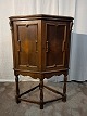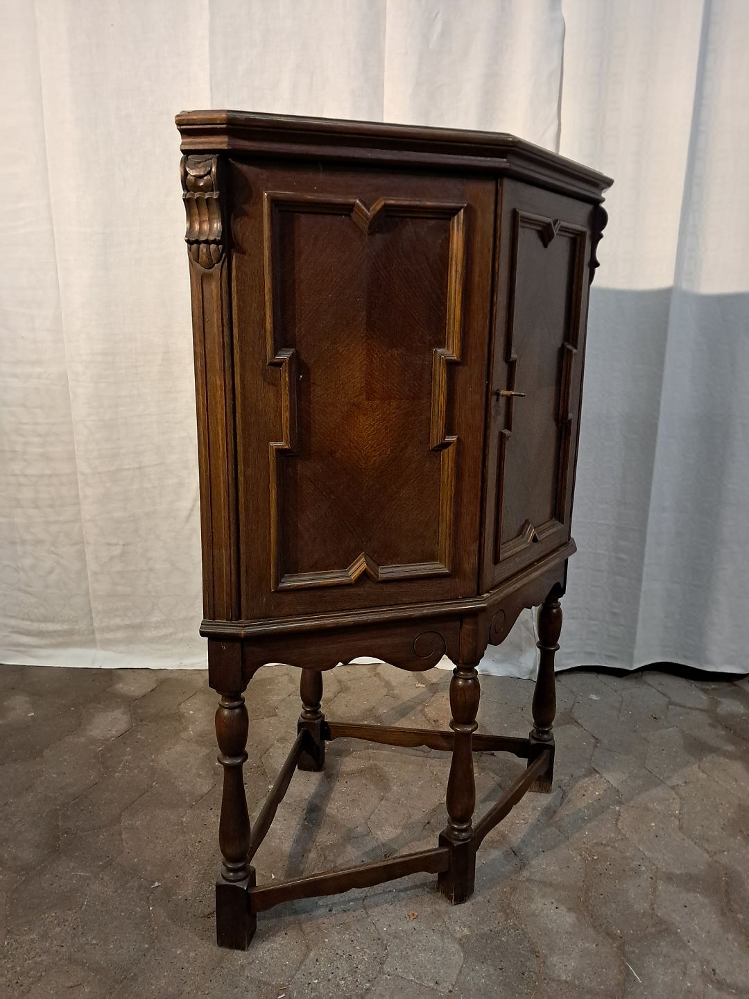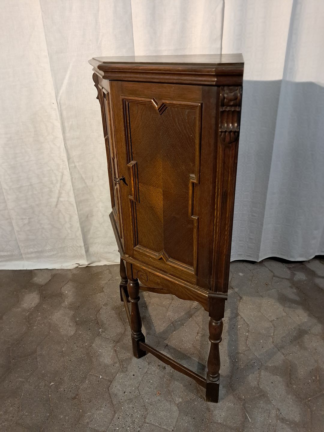 Hjørneskab i fineret egetræ, fra 1980erne. Det har brugsspor. Højde 108cm Bredde 72cm Dybder 52cm Emne nummer: 91423