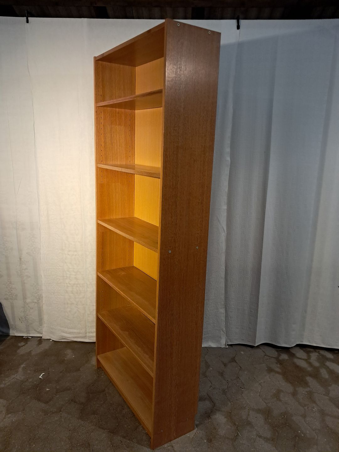 Reol i fineret egetræ, fra 1990erne. Den har brugsspor og mangler en skrue. ( den er stabil ) Højde 202cm Bredde 80cm Dybde 28cm Emne nummer: 91436