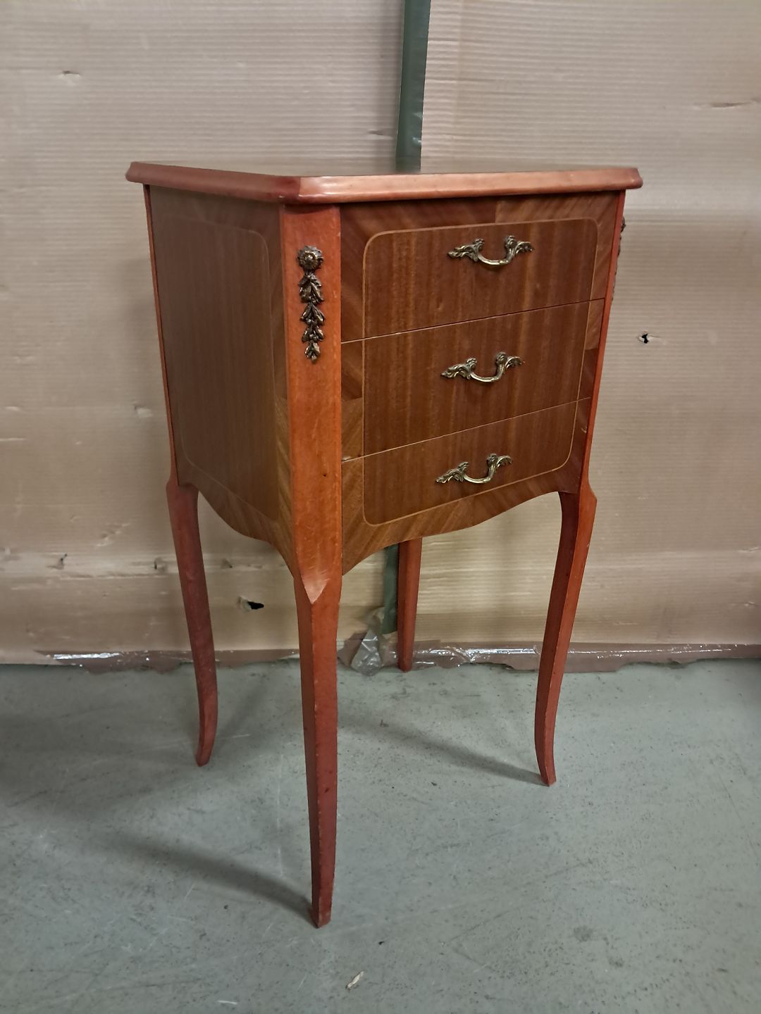 Kommode med intarsia i fineret mahogni, fra 1980erne. Den har brugsspor. Højde 70cm Bredder 37cm Dybde 30cm Emne nummer: 76098