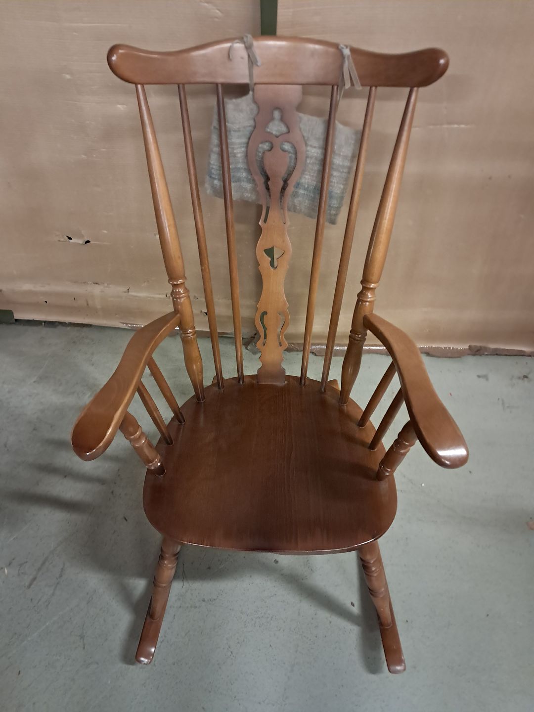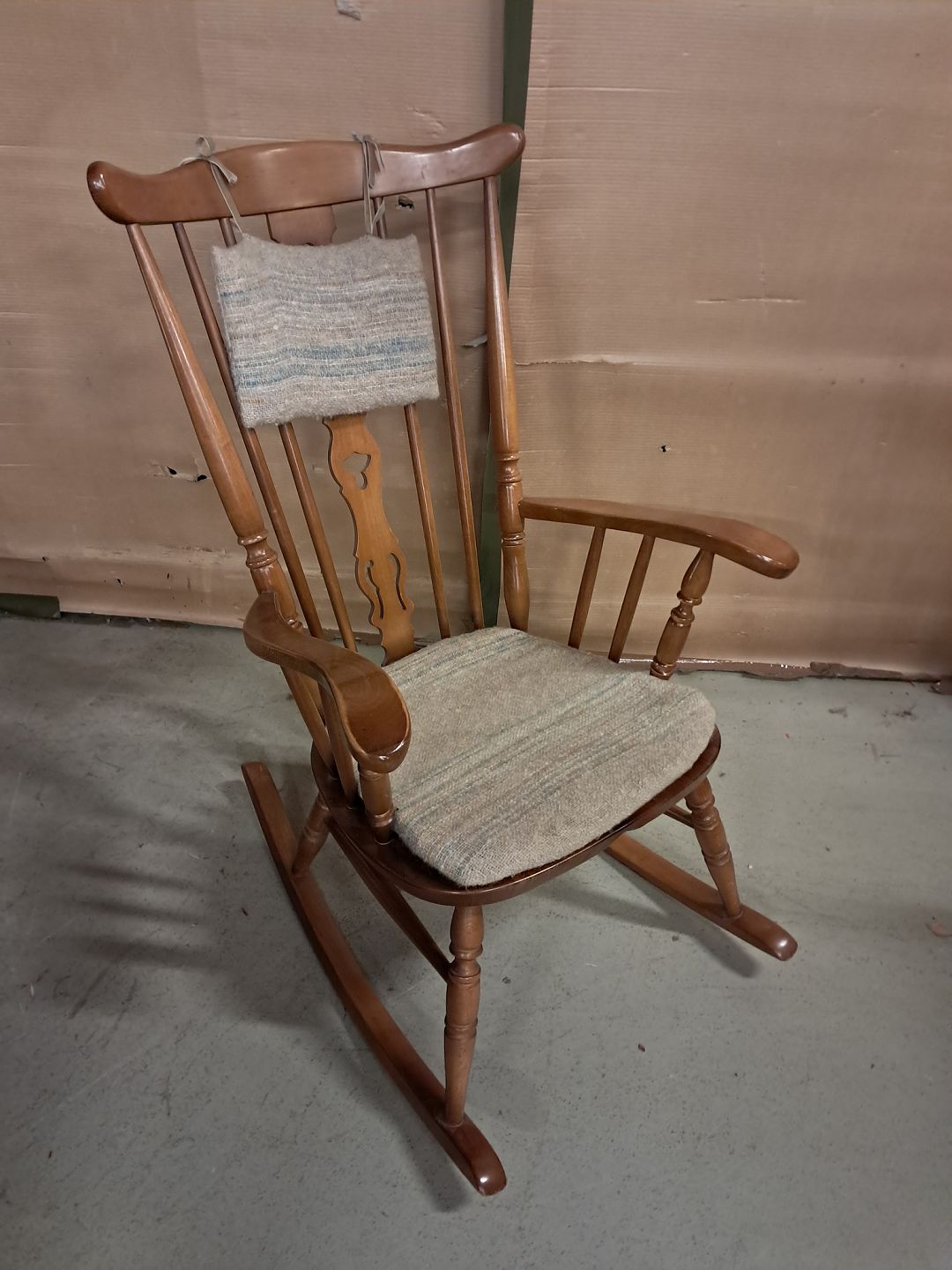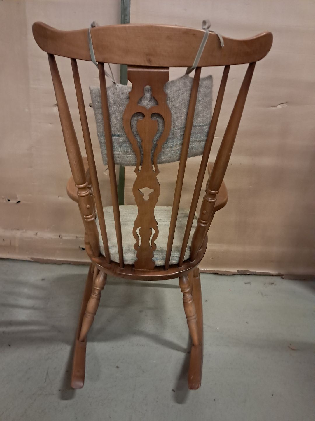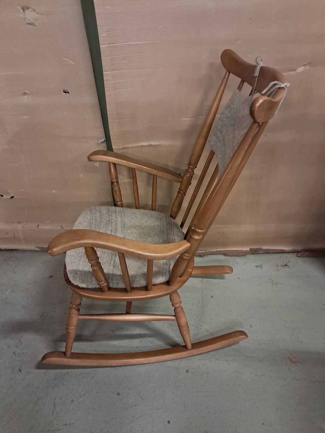 Gyngestol i massivt bøgetræ, fra 1980erne. Den har brugsspor. Ryghøjde 103cm Sædehøjde 44cm Emne nummer: 76102