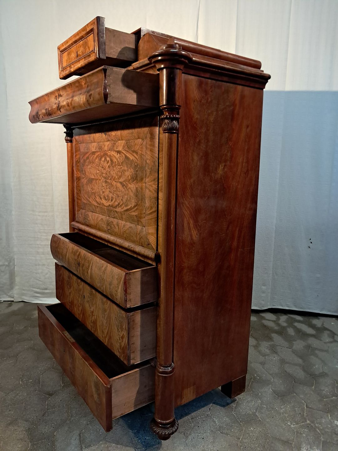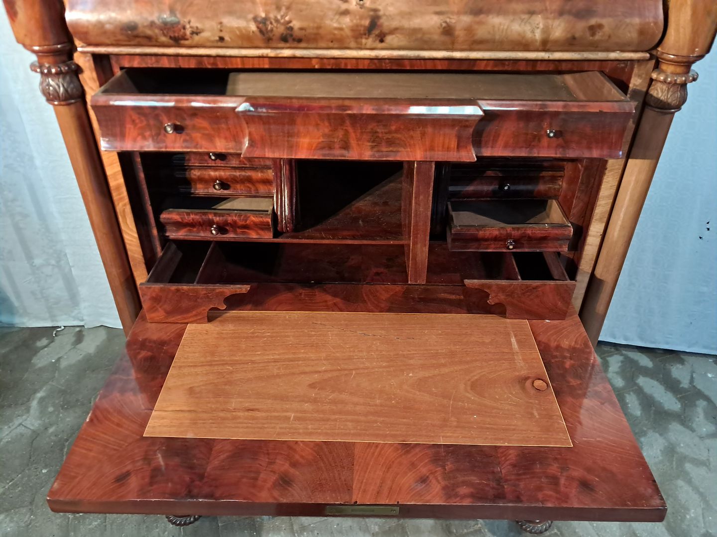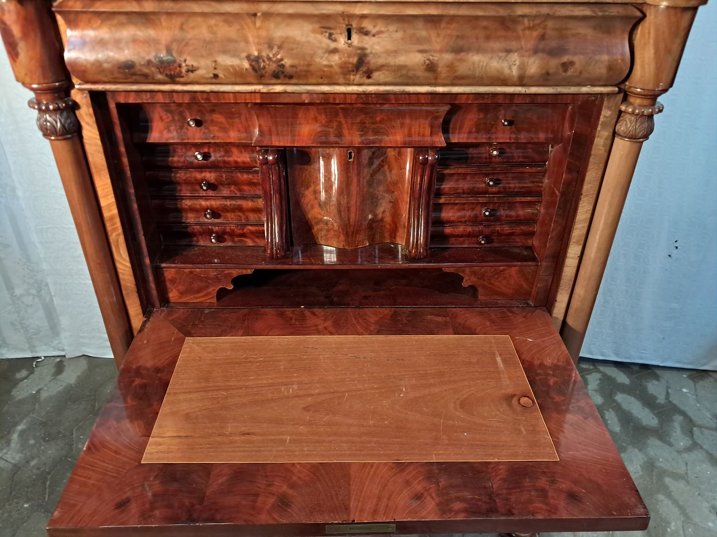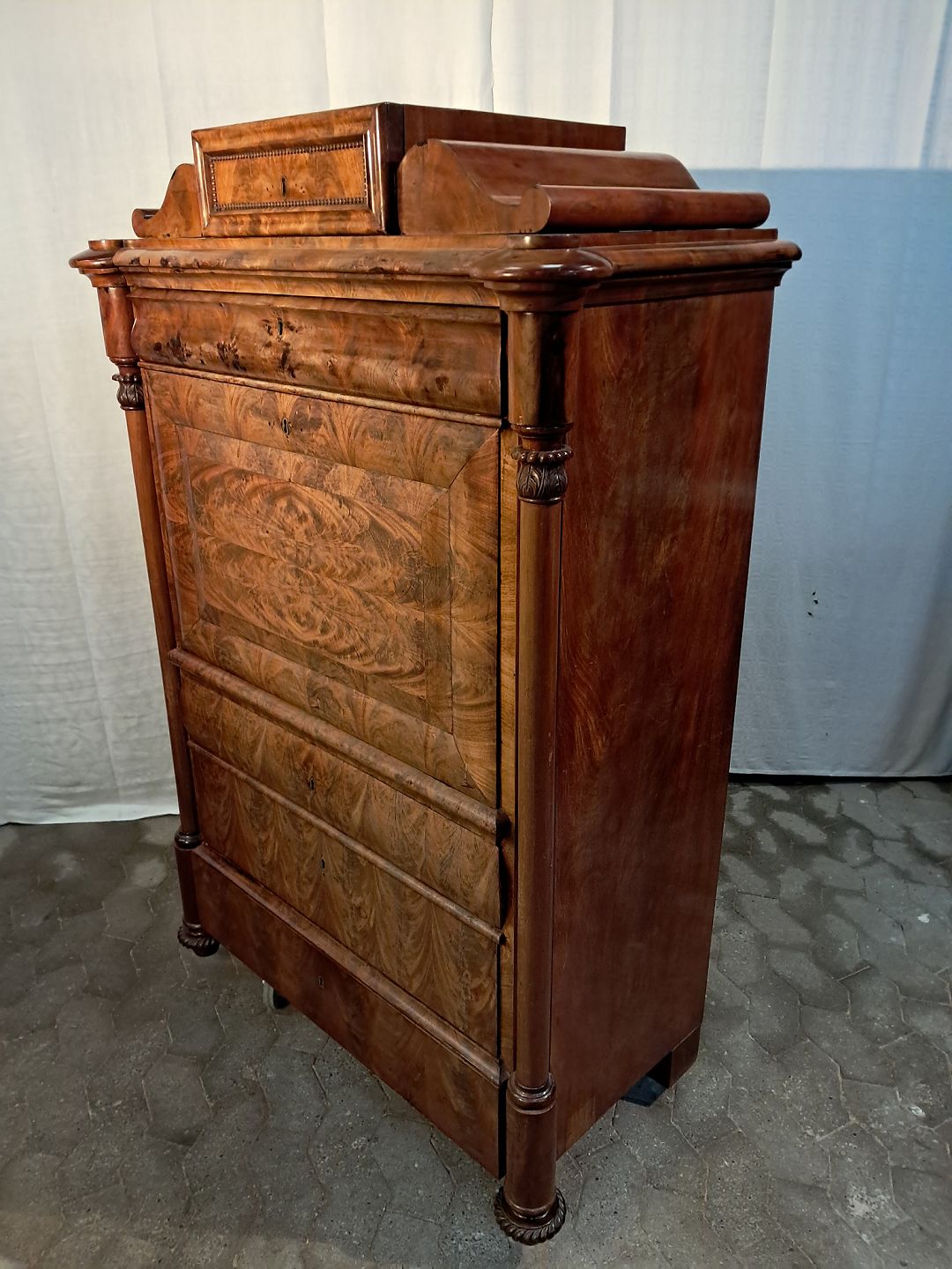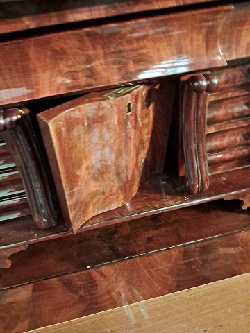 Sekretær i fineret mahogni, fra 1890erne. Den har brugsspor og defekt låge. (se foto) Højde 160cm Bredde 109cm Dybde 56cm Emne nummer: 91447