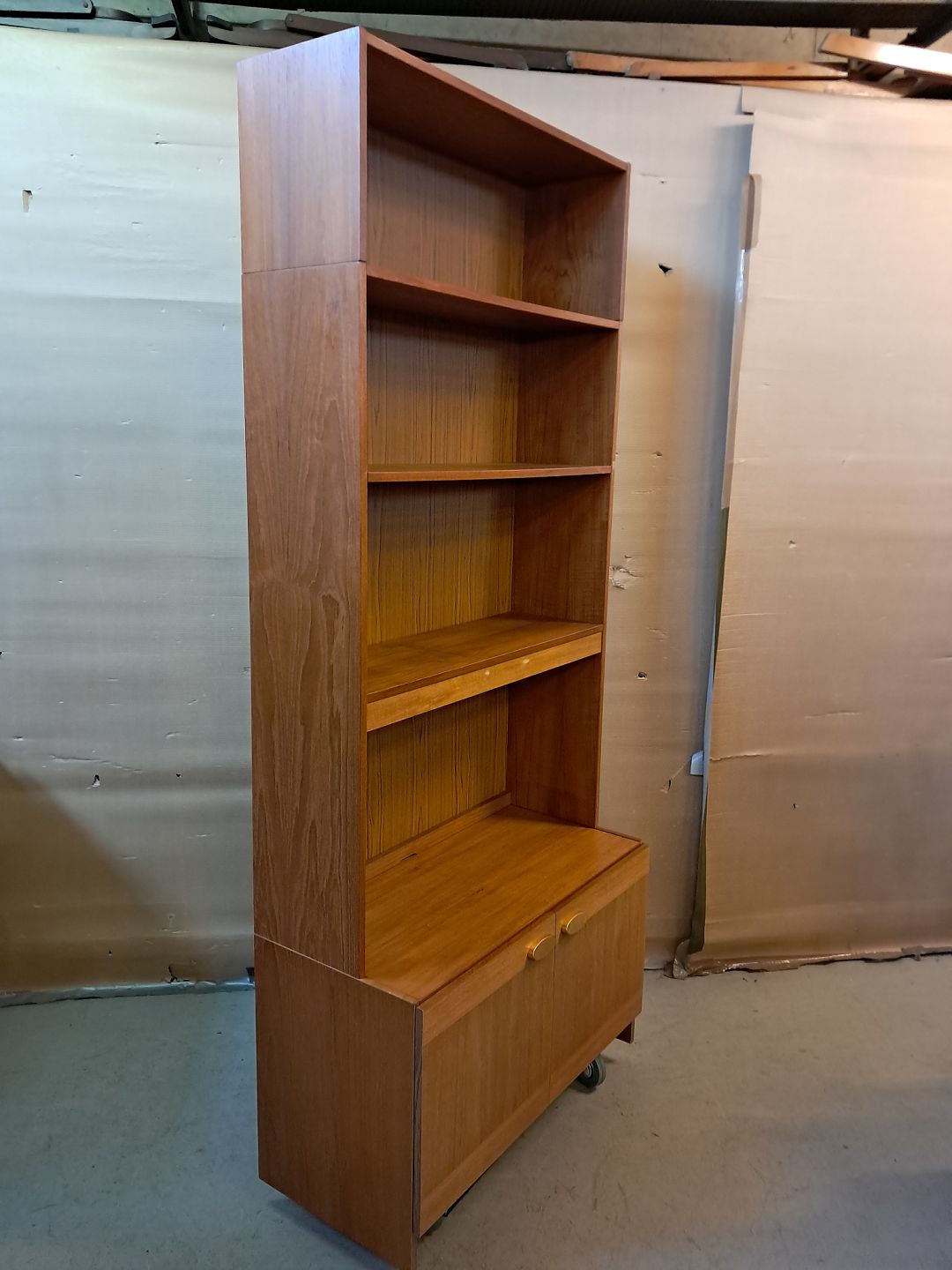 Reolsektion i fineret teaktræ, fra 1970erne. Den har brugsspor og et løst bræt på soklen.(se foto) Højde 207cm Bredde 89cm Dybde i toppen 27cm Dybde i bunden 41cm Emne nummer: 76245
