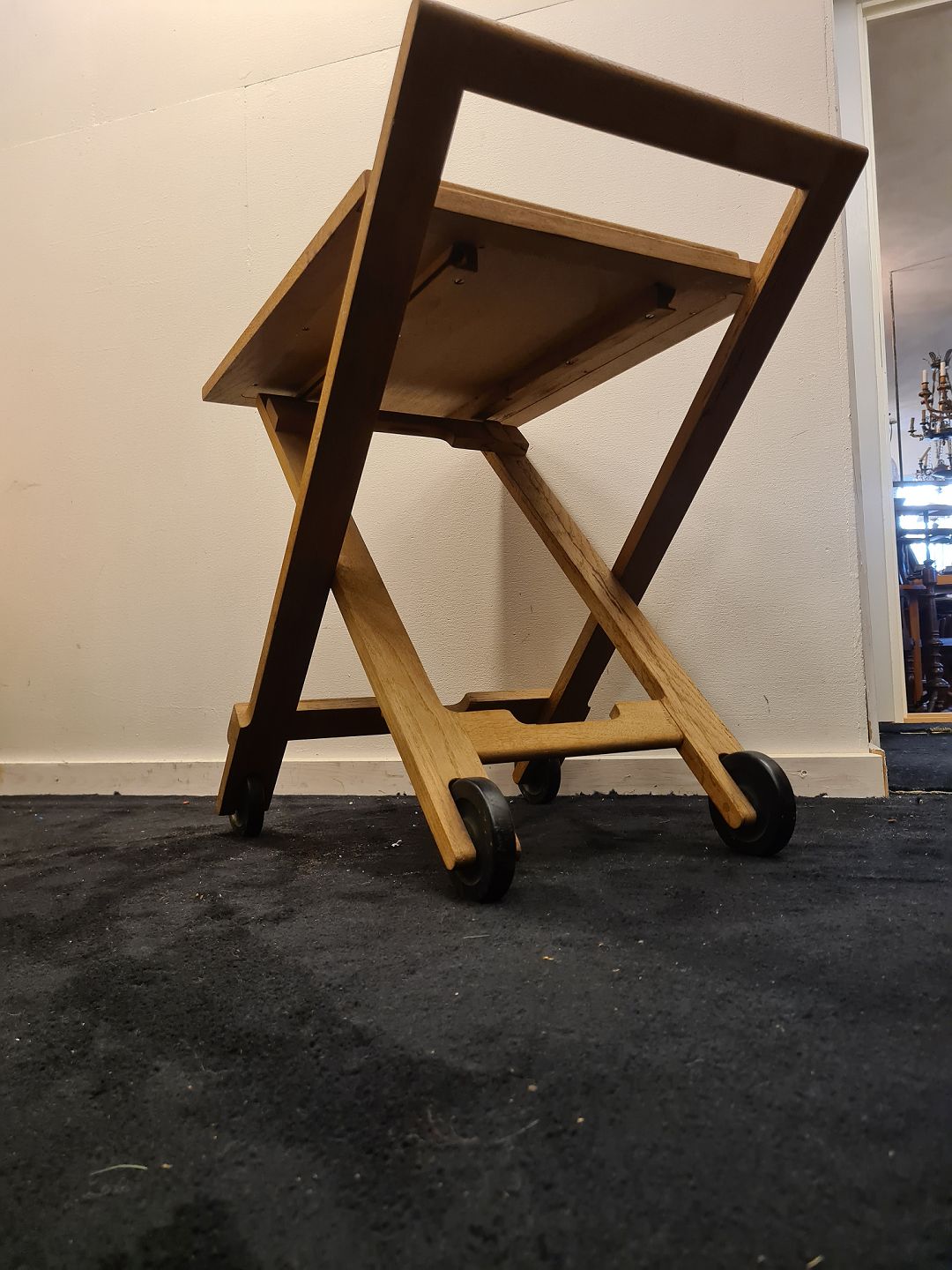 Dansk møbelproducent sammenklappeligt rullebord i eg med hjul i plast og plade af sort formica. Fremstillet ca. 1970'erne. Brugt stand, plade med brusspor. Mål: H. 57 cm. B. 55 cm. D. 43 cm. Emne nummer: 80695