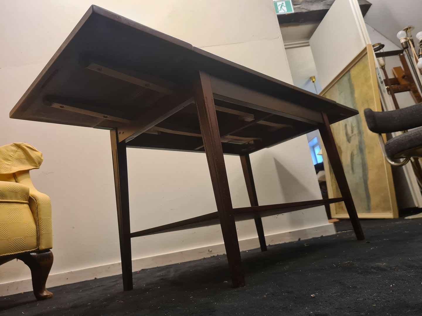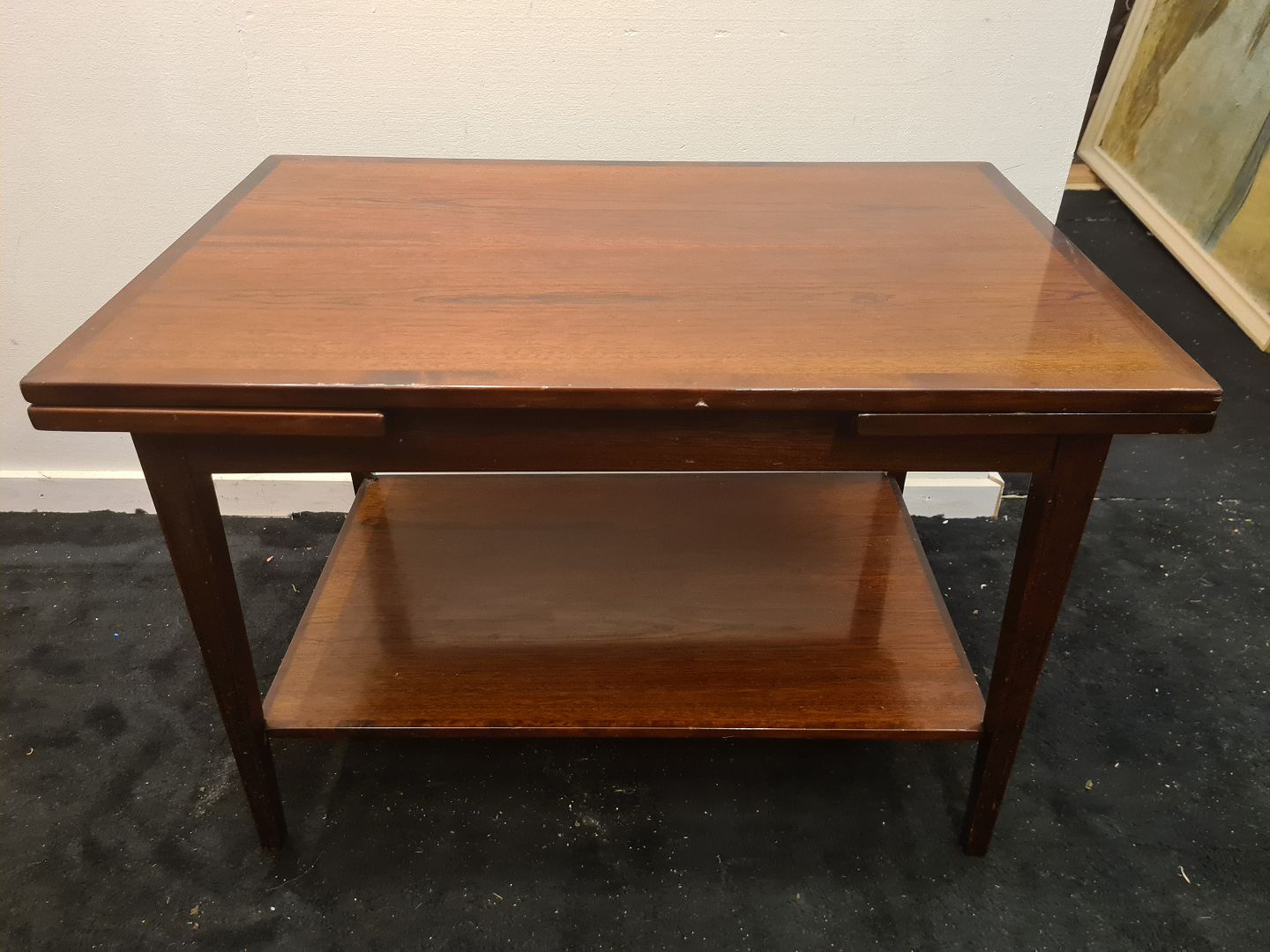 Dansk møbelproducent sofabord m. hollandsk udtræk. Udført i fineret og lakeret palisander, ene udtræksplade m. sort formica. Produceret ca. 1960'erne.