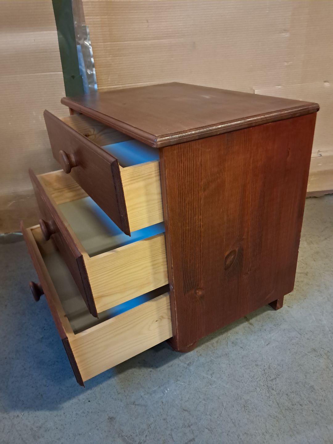 Kommode i bejdset massivt fyrretræ, fra 1990erne. Højde 44cm Bredde 46cm Dybde 31cm Emne nummer: 76258