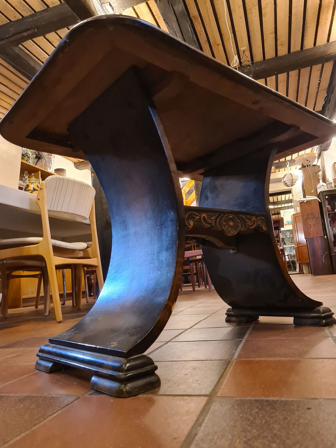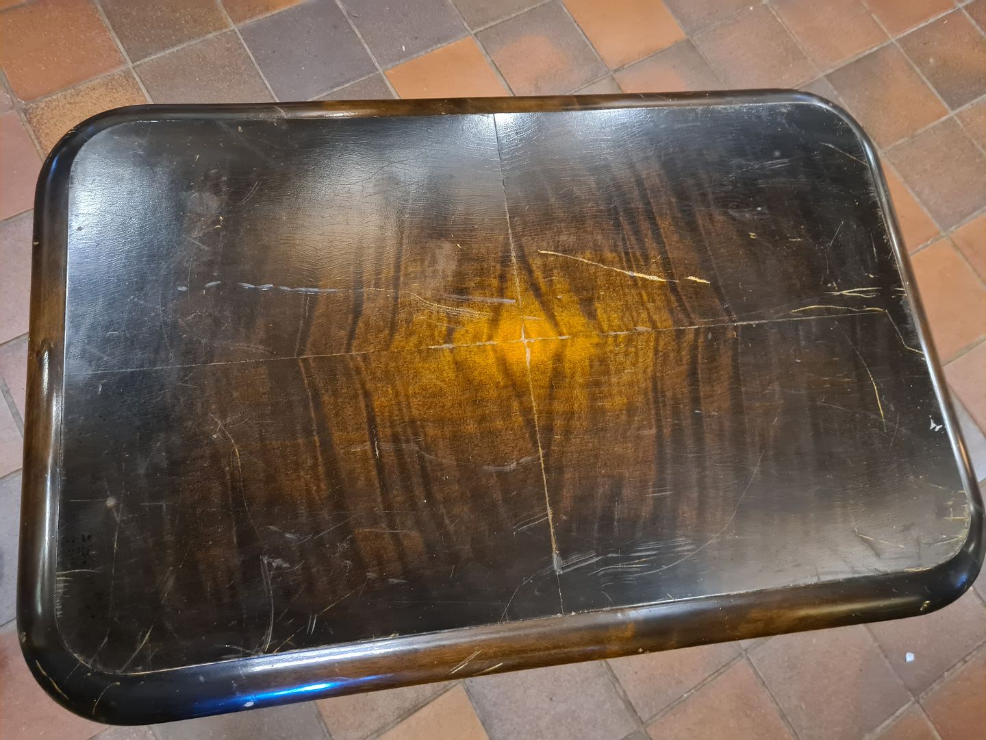 Funkis stil sofabord udført i fineret bejdset birketræ. Produceret af dansk møbelsnedker ca. 1930'erne. Fremstår med brugsspor og skrammer på plade. Mål: H. 59 cm. B. 56 cm. D. 86 cm. Emne nummer: 80753