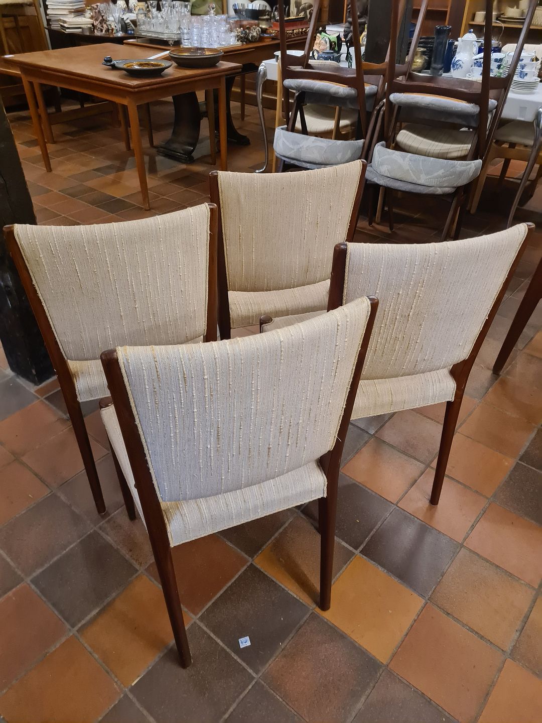 Dansk møbelsnedker sæt af 4 stole udført i teak m. messing sko på forben og polstret i lyst uld stof. Udført ca. 1950'erne. Pæn brugt stand. Mål: H. 86 cm. B. 48 cm. D. 48 cm. SH 43 cm. Emne nummer: 80765