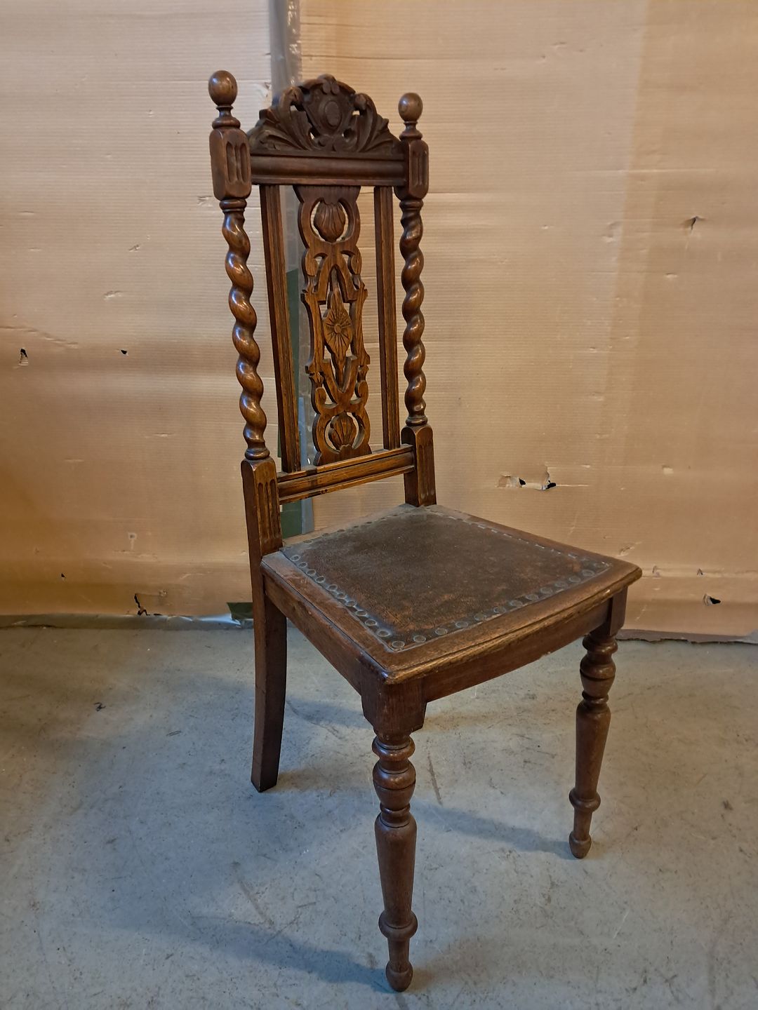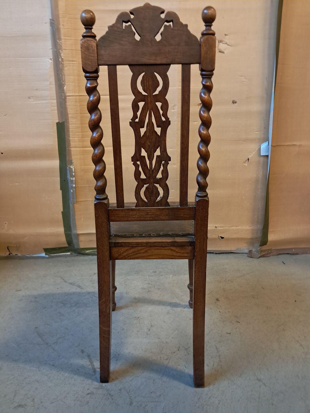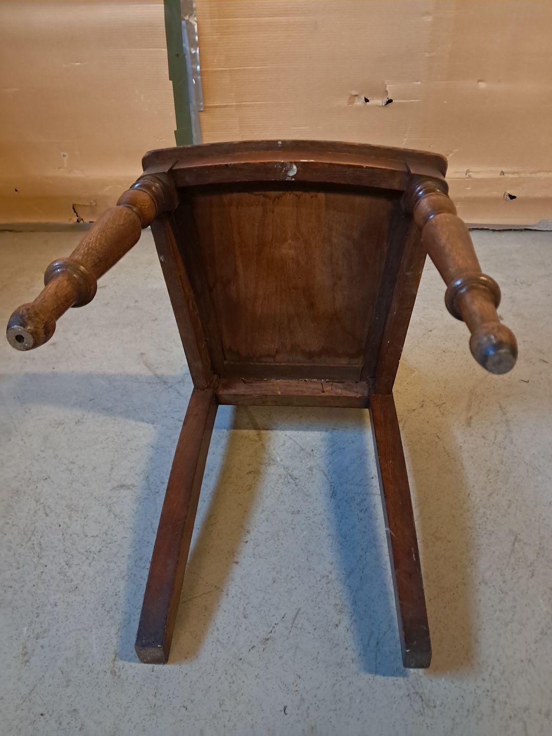 Stol i massivt egetræ, fra 1910erne. Den har brugsspor. Ryghøjde 107cm Sædehøjde 47cm Emne nummer: 76312