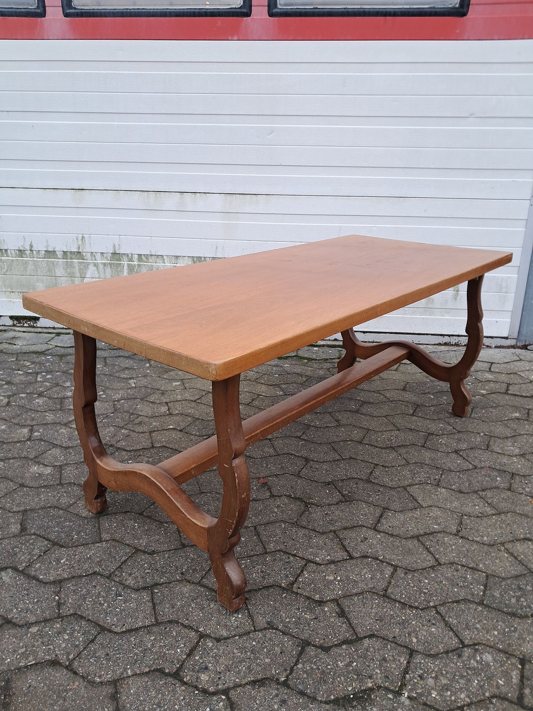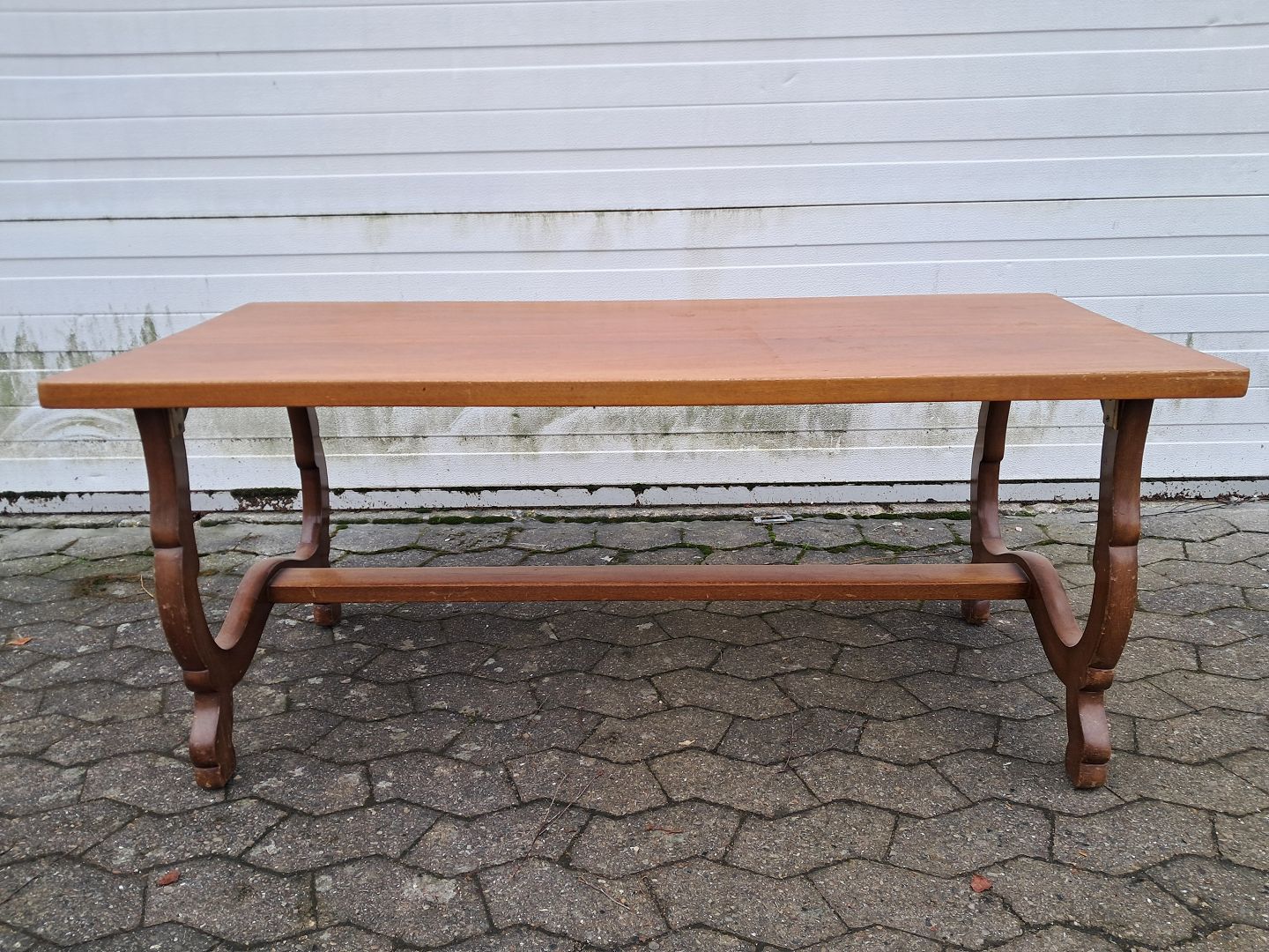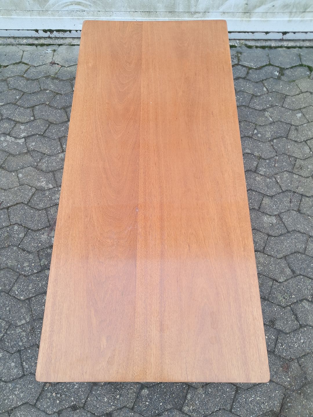 Sofabord i massivt og fineret mahogni, fra 1980erne. Det har brugsspor. Højde 55cm Bredde 58cm Længde 130cm Emne nummer: 76335