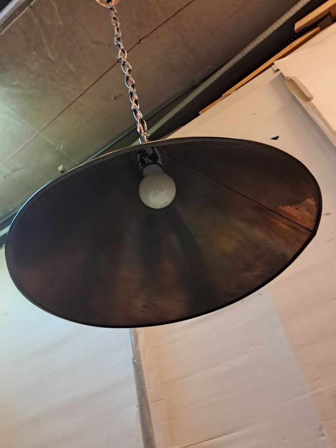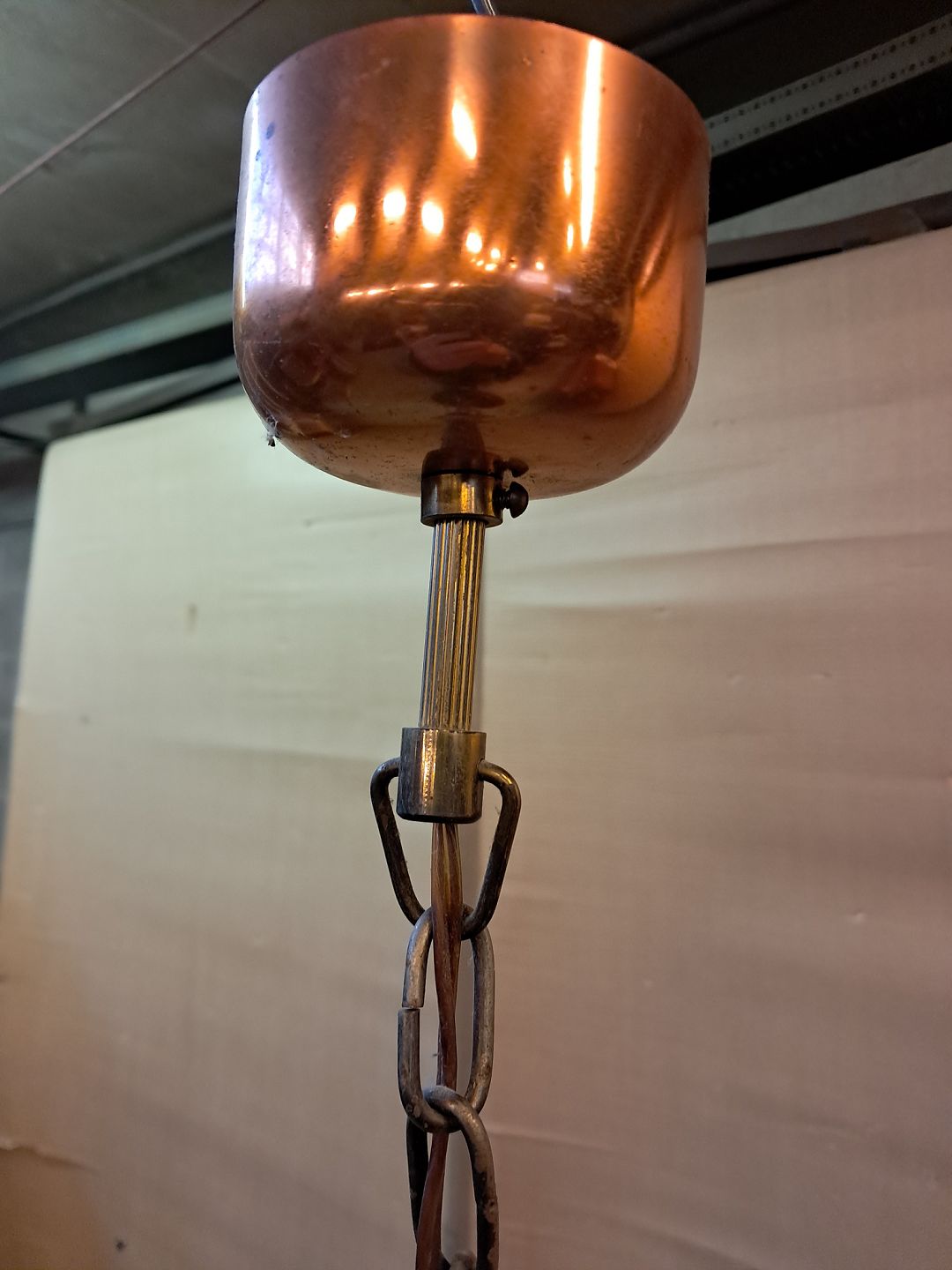 Pendel i metal, fra 1980erne. Den har brugsspor. Højde 36cm Diameter 41cm Højde med kæde 105cm Emne nummer: 76359