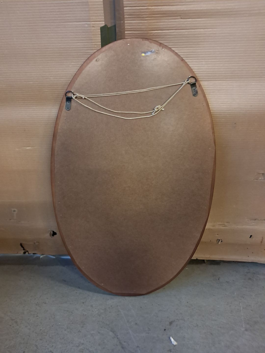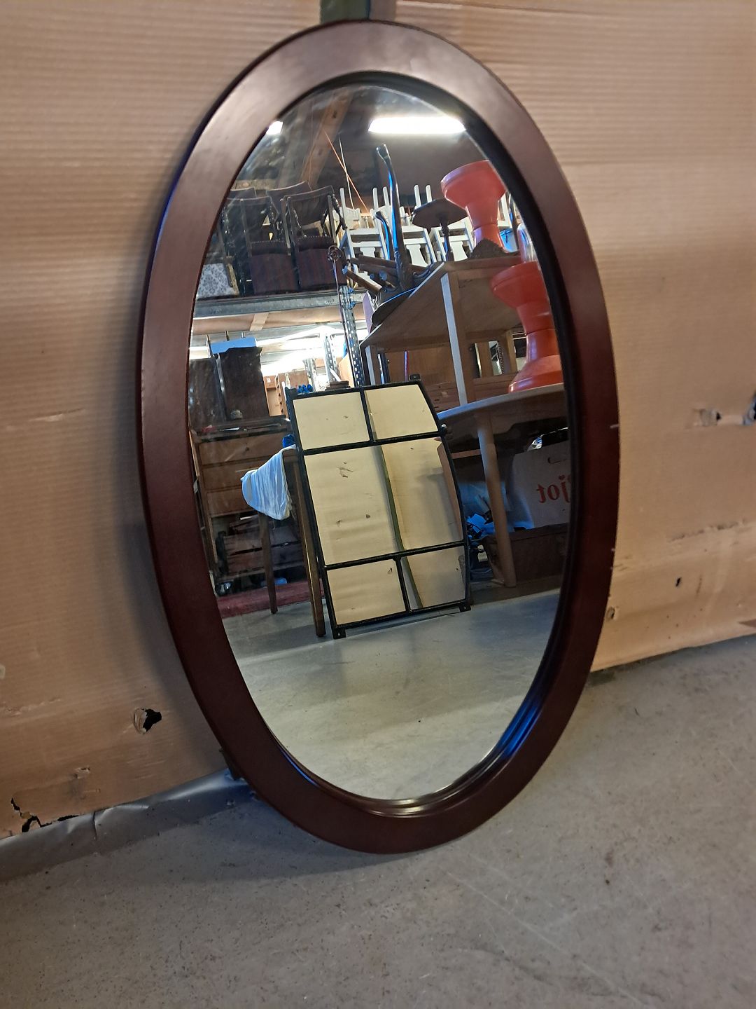 Ovalt spejl i fineret mahogni, fra 2000erne. Det har brugsspopr. Højde 78cm Bredde 48cm Emne nummer: 76382