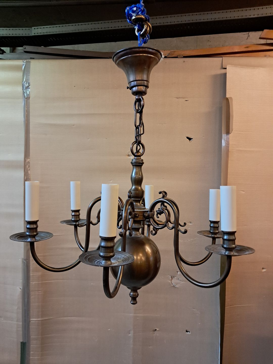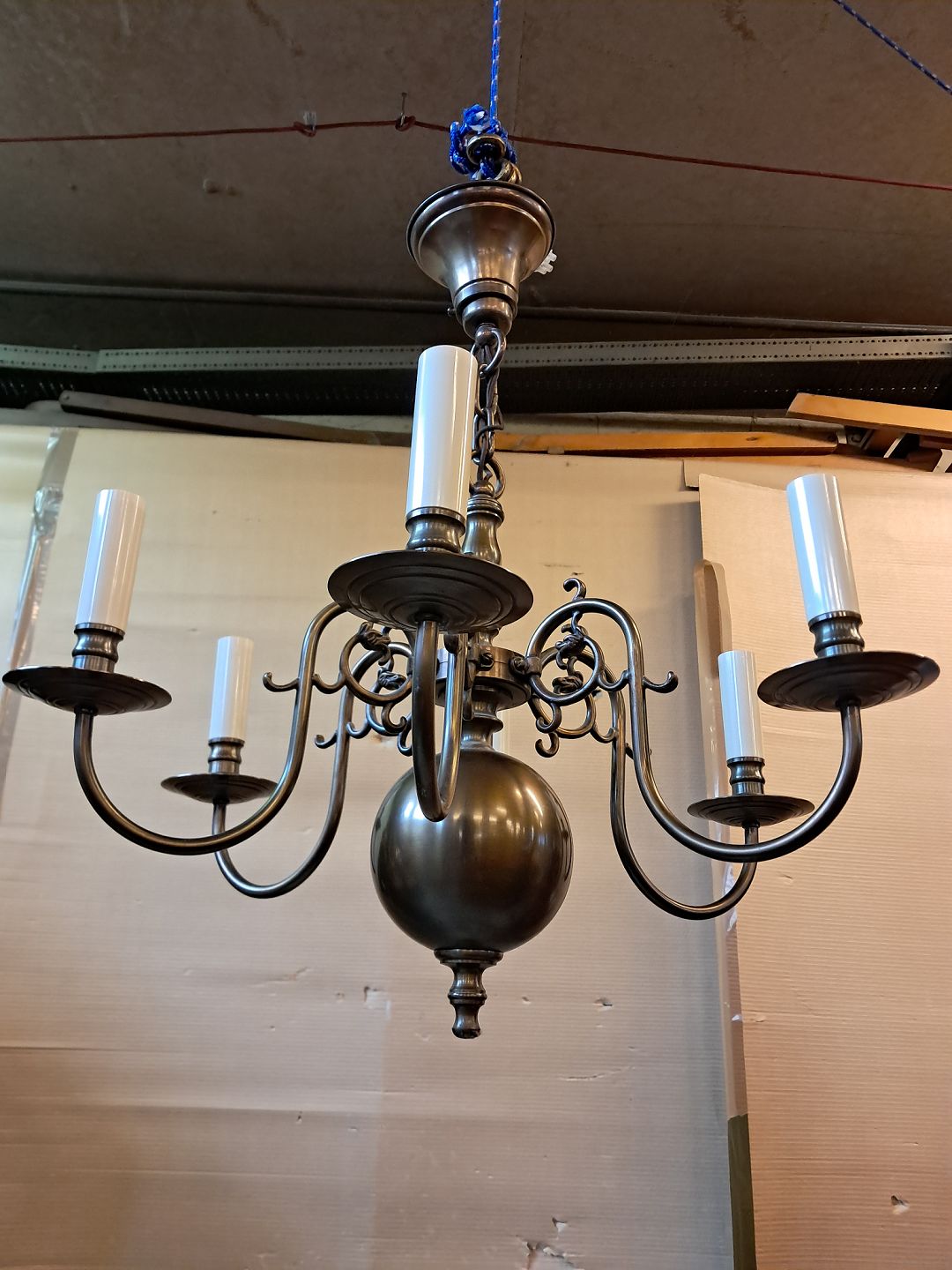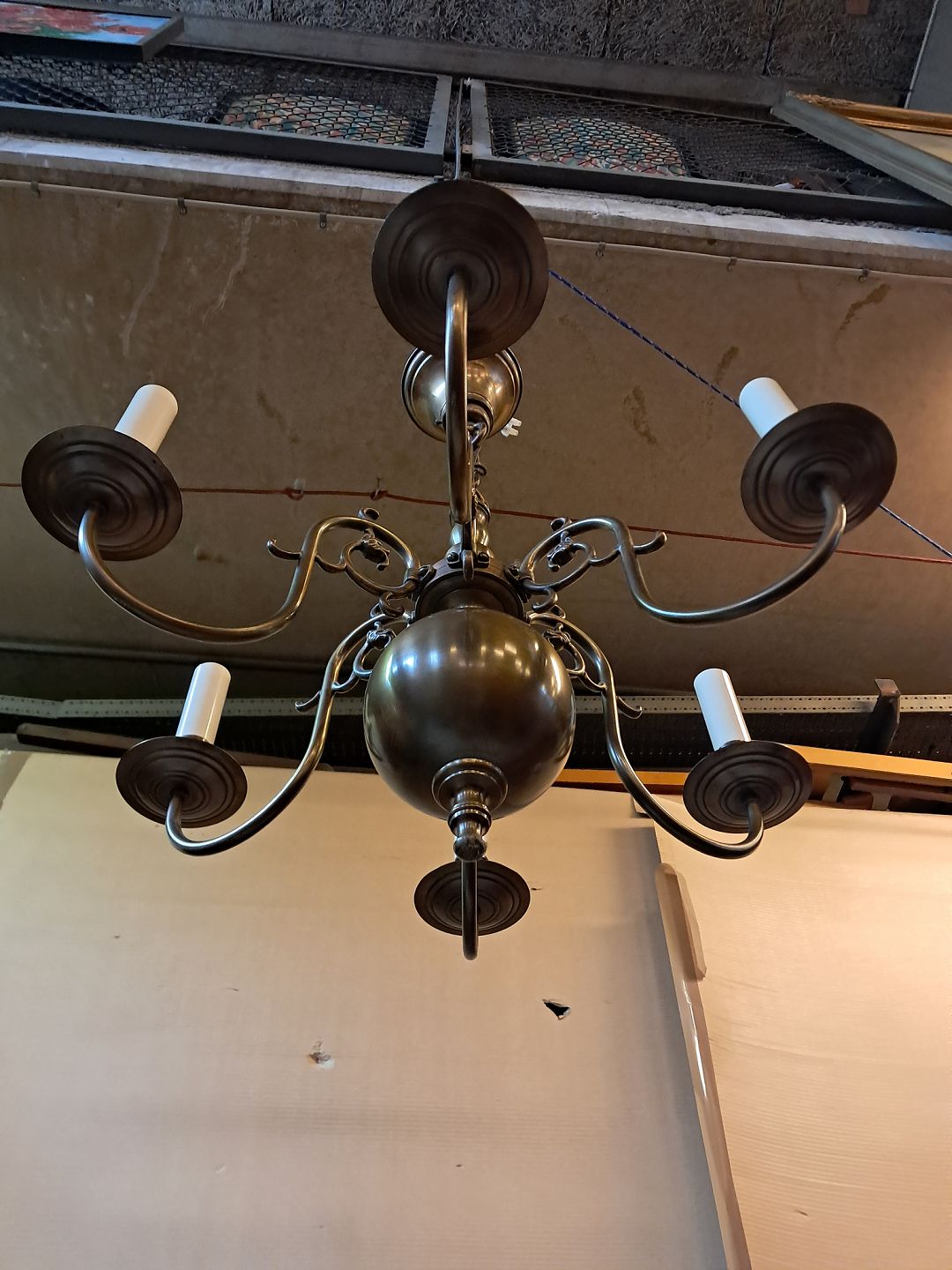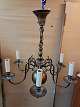 Kirkekrone i bruneret messing, fra 1930erne. Den har brugsspor. Højde med kæde 61cm Diameter 59cm Emne nummer: 76394
